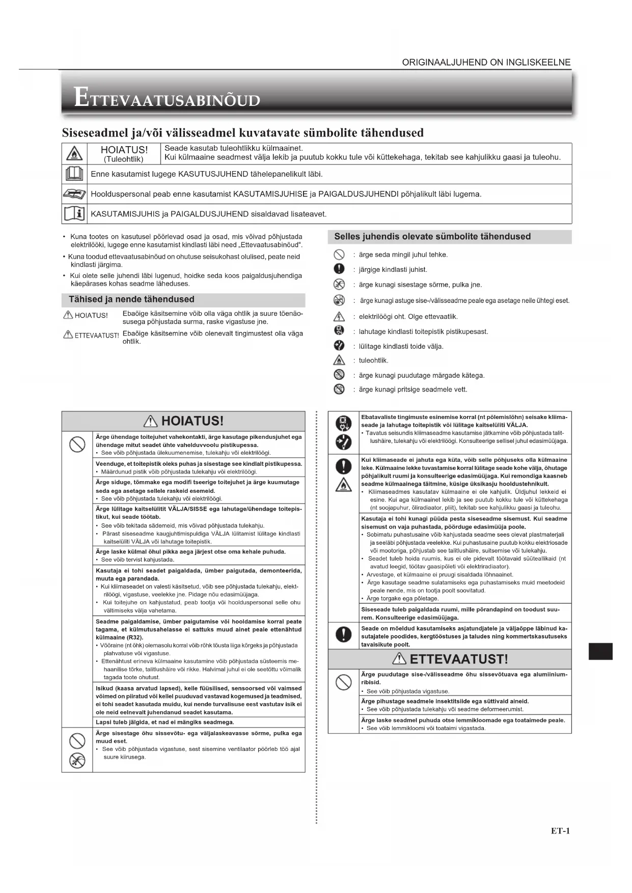 - Kuna tootes on kasutusel pöörlevad osad ja osad, mis võivad põhjustada elektrilööki, lugege enne kasutamist kindlasti läbi need „Ettevaatusabinõud“.• Kuna toodud ettevaatusabinõud on ohutuse seisukohast olulised, peate neid kindlasti järgima.• Kui olete selle juhendi läbi lugenud, hoidke seda koos paigaldusjuhendiga käepärases kohas seadme läheduses. Tähised ja nende tähendused HOIATUS!Ebaõige käsitsemine võib olla väga ohtlik ja suure tõenäo-susega põhjustada surma, raske vigastuse jne. ETTEVAATUST!Ebaõige käsitsemine võib olenevalt tingimustest olla väga ohtlik. Selles juhendis olevate sümbolite tähendused : ärge seda mingil juhul tehke. : järgige kindlasti juhist. : ärge kunagi sisestage sõrme, pulka jne. ärge kunagi astuge sise-/välisseadme peale ega asetage neile ühtegi eset. : elektrilöögi oht. Olge ettevaatlik. : lahutage kindlasti toitepistik pistikupesast. : lülitage kindlasti toide välja. : tuleohtlik. : ärge kunagi puudutage märgade kätega. : ärge kunagi pritsige seadmele vett. HOIATUS! Ärge ühendage toitejuhet vahekontakti, ärge kasutage pikendusjuhet ega ühendage mitut seadet ühte vahelduvvoolu pistikupessa.• See võib põhjustada ülekuumenemise, tulekahju või elektrilöögi.Veenduge, et toitepistik oleks puhas ja sisestage see kindlalt pistikupessa.• Määrdunud pistik võib põhjustada tulekahju või elektrilöögi.Ärge siduge, tõmmake ega modifi tseerige toitejuhet ja ärge kuumutage seda ega asetage sellele raskeid esemeid.• See võib põhjustada tulekahju või elektrilöögi.Ärge lülitage kaitselülitit VÄLJA/SISSE ega lahutage/ühendage toitepis-tikut, kui seade töötab.• See võib tekitada sädemeid, mis võivad põhjustada tulekahju.• Pärast siseseadme kaugjuhtimispuldiga VÄLJA lülitamist lülitage kindlasti kaitselüliti VÄLJA või lahutage toitepistik. Ärge laske külmal õhul pikka aega järjest otse oma kehale puhuda.• See võib tervist kahjustada.Kasutaja ei tohi seadet paigaldada, ümber paigutada, demonteerida, muuta ega parandada.• Kui kliimaseadet on valesti käsitsetud, võib see põhjustada tulekahju, elekt-rilöögi, vigastuse, veelekke jne. Pidage nõu edasimüüjaga.• Kui toitejuhe on kahjustatud, peab tootja või hoolduspersonal selle ohu vältimiseks välja vahetama.Seadme paigaldamise, ümber paigutamise või hooldamise korral peate tagama, et külmutusahelasse ei sattuks muud ainet peale ettenähtud külmaaine (R32).• Võõraine (nt õhk) olemasolu korral võib rõhk tõusta liiga kõrgeks ja põhjustada plahvatuse või vigastuse.• Ettenähtust erineva külmaaine kasutamine võib põhjustada süsteemis me-haanilise tõrke, talitlushäire või rikke. Halvimal juhul ei ole seetõttu võimalik tagada toote ohutust.Isikud (kaasa arvatud lapsed), kelle füüsilised, sensoorsed või vaimsed võimed on piiratud või kellel puuduvad vastavad kogemused ja teadmised, ei tohi seadet kasutada muidu, kui nende turvalisuse eest vastutav isik ei ole neid eelnevalt juhendanud seadet kasutama.Lapsi tuleb jälgida, et nad ei mängiks seadmega. Ärge sisestage õhu sissevõtu- ega väljalaskeavasse sõrme, pulka ega muud eset.• See võib põhjustada vigastuse, sest sisemine ventilaator pöörleb töö ajal suure kiirusega. Ebatavaliste tingimuste esinemise korral (nt põlemislõhn) seisake kliima-seade ja lahutage toitepistik või lülitage kaitselüliti VÄLJA.• Tavatus seisundis kliimaseadme kasutamise jätkamine võib põhjustada talit-lushäire, tulekahju või elektrilöögi. Konsulteerige sellisel juhul edasimüüjaga. Kui kliimaseade ei jahuta ega küta, võib selle põhjuseks olla külmaaine leke. Külmaaine lekke tuvastamise korral lülitage seade kohe välja, õhutage põhjalikult ruumi ja konsulteerige edasimüüjaga. Kui remondiga kaasneb seadme külmaainega täitmine, küsige üksikasju hooldustehnikult.• Kliimaseadmes kasutatav külmaaine ei ole kahjulik. Üldjuhul lekkeid ei esine. Kui aga külmaainet lekib ja see puutub kokku tule või küttekehaga (nt soojapuhur, õliradiaator, pliit), tekitab see kahjulikku gaasi ja tuleohu.Kasutaja ei tohi kunagi püüda pesta siseseadme sisemust. Kui seadme sisemust on vaja puhastada, pöörduge edasimüüja poole.• Sobimatu puhastusaine võib kahjustada seadme sees olevat plastmaterjali ja seeläbi põhjustada veelekke. Kui puhastusaine puutub kokku elektriosade või mootoriga, põhjustab see talitlushäire, suitsemise või tulekahju.• Seadet tuleb hoida ruumis, kus ei ole pidevalt töötavaid süüteallikaid (nt avatud leegid, töötav gaasipõleti või elektriradiaator).• Arvestage, et külmaaine ei pruugi sisaldada lõhnaainet.• Ärge kasutage seadme sulatamiseks ega puhastamiseks muid meetodeid peale nende, mis on tootja poolt soovitatud.• Ärge torgake ega põletage.Siseseade tuleb paigaldada ruumi, mille põrandapind on toodust suu-rem. Konsulteerige edasimüüjaga.Seade on mõeldud kasutamiseks asjatundjatele ja väljaõppe läbinud ka-sutajatele poodides, kergtööstuses ja taludes ning kommertskasutuseks tavaisikute poolt. ETTEVAATUST! Ärge puudutage sise-/välisseadme õhu sissevõtuava ega alumiinium-ribisid.• See võib põhjustada vigastuse.Ärge pihustage seadmele insektitsiide ega süttivaid aineid.• See võib põhjustada tulekahju või seadme deformeerumist.Ärge laske seadmel puhuda otse lemmikloomade ega toataimede peale.• See võib lemmikloomi või toataimi vigastada. Siseseadmel ja/või välisseadmel kuvatavate sümbolite tähendused HOIATUS! (Tuleohtlik)Seade kasutab tuleohtlikku külmaainet.Kui külmaaine seadmest välja lekib ja puutub kokku tule või küttekehaga, tekitab see kahjulikku gaasi ja tuleohu.Enne kasutamist lugege KASUTUSJUHEND tähelepanelikult läbi.Hoolduspersonal peab enne kasutamist KASUTAMISJUHISE ja PAIGALDUSJUHENDI põhjalikult läbi lugema.KASUTAMISJUHIS ja PAIGALDUSJUHEND sisaldavad lisateavet. JG79Y566L01_20Et.indd 1 2018/12/27 13:48:07ET ET ET-2 Seadme õi