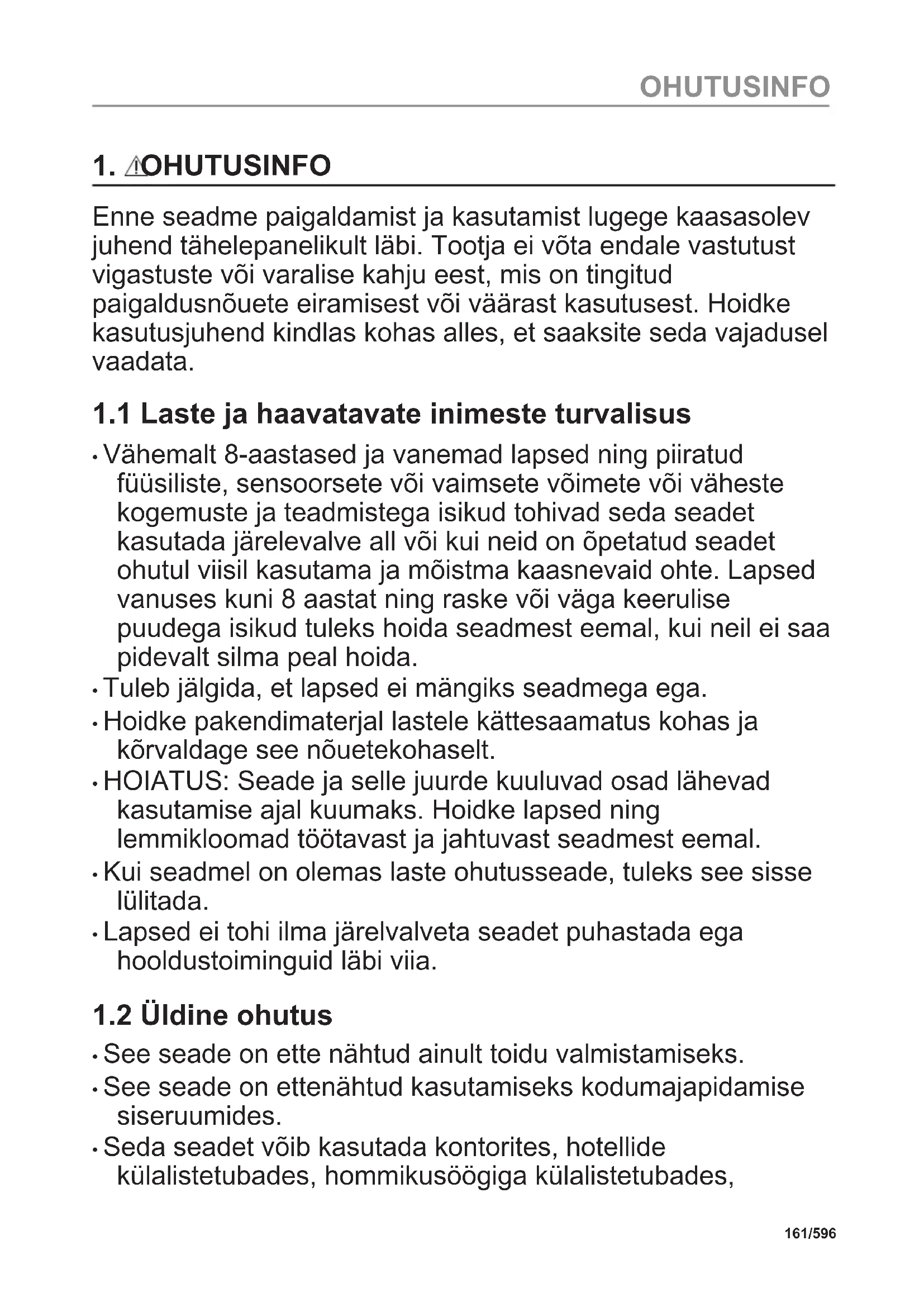 160/596 SISUKORD1. OHUTUSINFO Enne seadme paigaldamist ja kasutamist lugege kaasasolev juhend tähelepanelikult läbi. Tootja ei võta endale vastutust vigastuste või varalise kahju eest, mis on tingitud paigaldusnõuete eiramisest või väärast kasutusest. Hoidke kasutusjuhend kindlas kohas alles, et saaksite seda vajadusel vaadata.