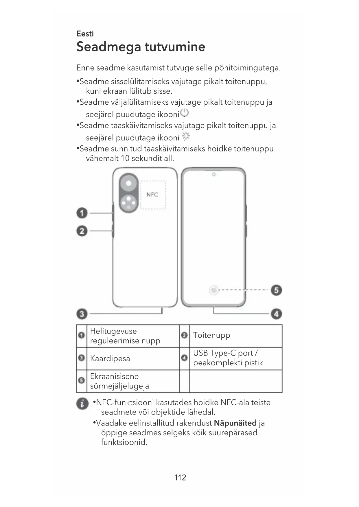 - Seadme sunnitud taaskäivitamiseks hoidke toitenuppu vähemalt 10 sekundit all. Helitugevuse reguleerimise nupp Toitenupp Kaardipesa USB Type-C port / peakomplekti pistik Ekraanisisene sõrmejäljelugeja