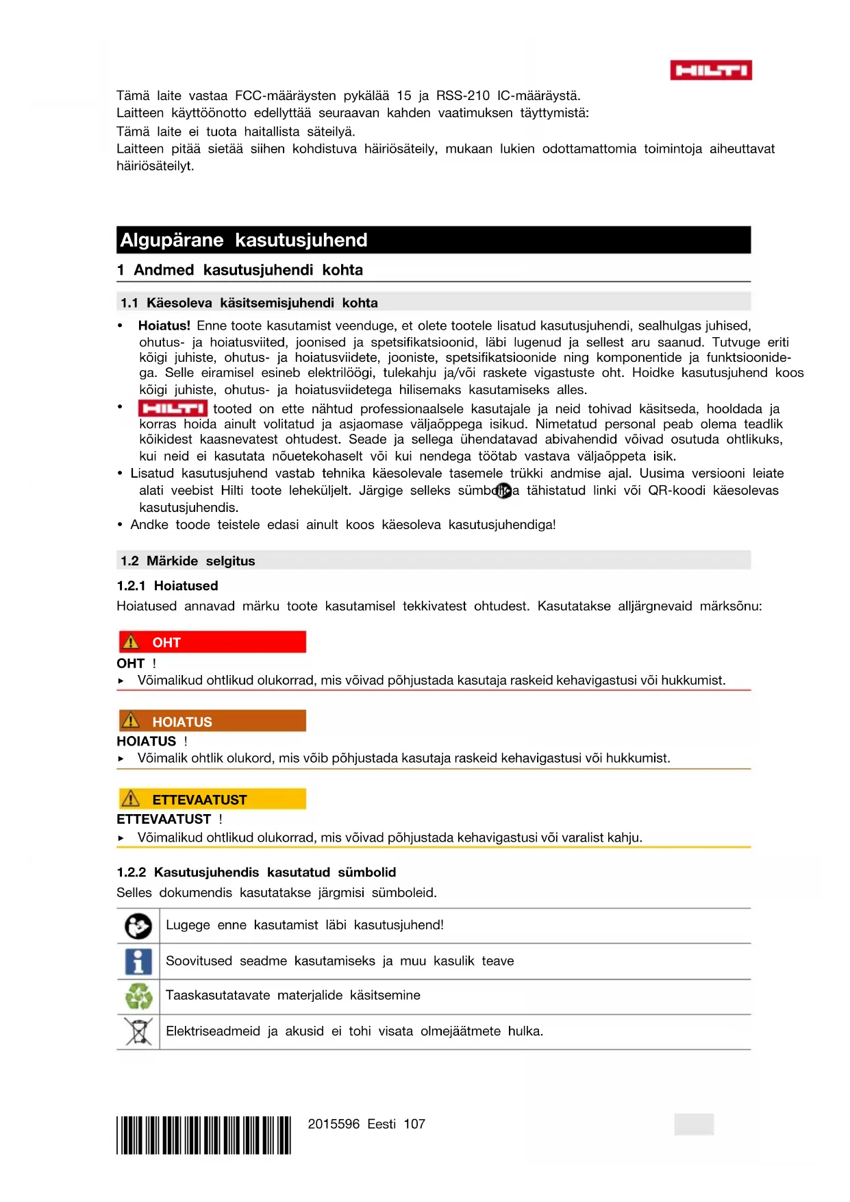 - Lisatud kasutusjuhend vastab tehnika käesolevale tasemele trükki andmise ajal. Uusima versiooni leiate alati veebist Hilti toote leheküljelt. Järgige selleks sümboliga tähistatud linki või QR-koodi käesolevas kasutusjuhendis.