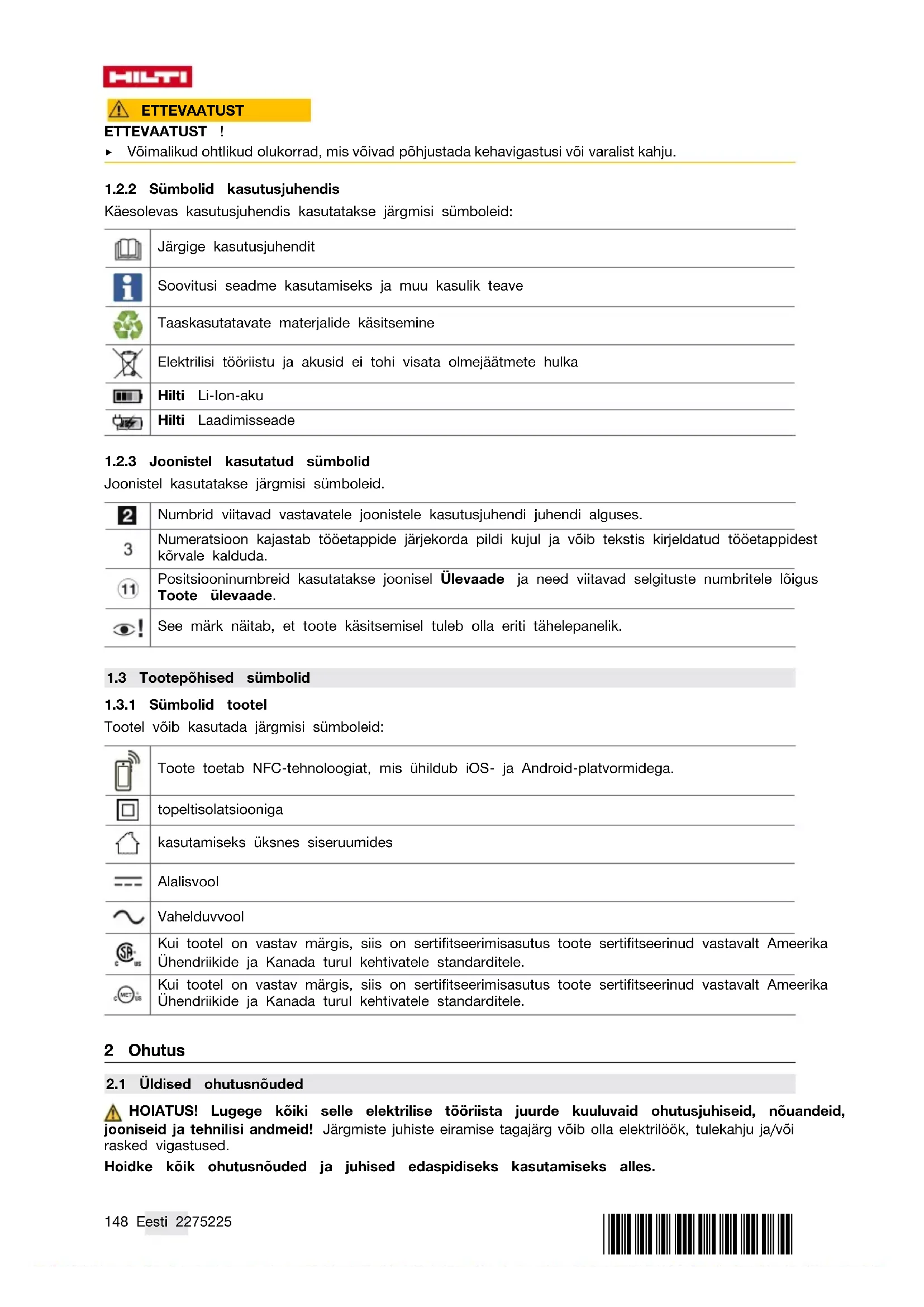 Käesolevas kasutusjuhendis kasutatakse järgmisi sümboleid: Järgige kasutusjuhendit Soovitusi seadme kasutamiseks ja muu kasulik teave Taaskasutatavate materjalide käsitsemine Elektrilisi tööriistu ja akusid ei tohi visata olmejäätmete hulka Hilti Li-Ion-aku Hilti Laadimisseade