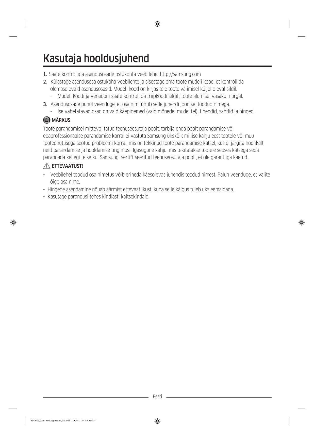 - Ise vahetatavad osad on vaid käepidemed (vaid mõnedel mudelitel), tihendid, sahtlid ja hinged. MÄRKUS Toote parandamisel mittevolitatud teenuseosutaja poolt, tarbija enda poolt parandamise või ebaprofessionaalse parandamise korral ei vastuta Samsung ükskõik millise kahju eest tootele või muu tooteohutusega seotud probleemi korral, mis on tekkinud toote parandamise katsel, kus ei järgita hoolikalt neid parandamise ja hooldamise tingimusi. Igasugune kahju, mis tekitatakse tootele seoses katsega seda parandada kellegi teise kui Samsungi sertitseeritud teenuseosutaja poolt, ei ole garantiiga kaetud. ETTEVAATUST!