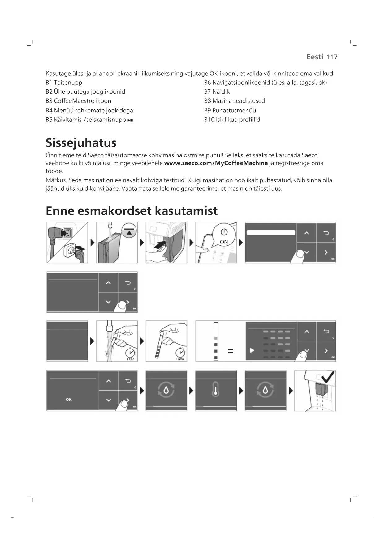 Eesti Sisukord Masina ülevaade (joonis A) _________________________________________________________________ 116 Juhtpaneel _______________________________________________________________________________ 116 Sissejuhatus _____________________________________________________________________________ 117 Enne esmakordset kasutamist ______________________________________________________________ 117 Erifunktsioonid ___________________________________________________________________________ 118 Jookide valmistamine______________________________________________________________________ 118 Jookide oma maitsele kohandamine_________________________________________________________ 120 Masina seadistuste reguleerimine ___________________________________________________________ 121 AquaClean-veefilter _______________________________________________________________________ 122 Kohvimooduli eemaldamine ja tagasipanemine_______________________________________________ 123 Puhastamine ja hooldus ___________________________________________________________________ 124 Katlakivi eemaldamise protseduur __________________________________________________________ 126 Veakoodid _______________________________________________________________________________ 127 Tarvikute tellimine ________________________________________________________________________ 128 Veaotsing________________________________________________________________________________ 128 Tehnilised andmed________________________________________________________________________ 133 Masina ülevaade (joonis A) A1 Juhtpaneel A2 Eeljahvatatud kohvi lahtri kaas A3 Oamahuti kaas A4 Juhtme pesa A5 Tilgakandik A6 Tilgakandiku vabastusnupp A7 Reguleeritav eemaldatav kohvi ja piima väljutamise tila A8 HygieSteami salv A9 HygieSteami kate piimatoru hoidikuga A10 Sisemine cappuccinatore A11 Pistikuga toitekaabel A12 Kohvijahvatuse seadistusnupp A13 Oamahuti A14 Kohvimoodul A15 Hooldusluuk A16 Veepaak A17 Kohvipaksu sahtel A18 Kohvipaksu sahtli esipaneel A19 Tilgakandiku kate A20 Tilgakandiku täituvuse näidik Tarvikud A21 Piimaanum A22 Piimatoru A23 Puhastushari A24 Määrdetuub A25 AquaClean-filter A26 Mõõtelusikas A27 Vee kareduse testriba Juhtpaneel Saadaval on kaks espressomasina versiooni. Nende juhtpaneelid näevad välja erinevad, kuid kõik nupud ja ikoonid toimivad sarnaselt. Vt joonisest B kõikide nuppude ja ikoonide ülevaadet. Allpool on toodud nende kirjeldused.117 Eesti Kasutage üles- ja allanooli ekraanil liikumiseks ning vajutage OK-ikooni, et valida või kinnitada oma valikud. B1 Toitenupp B2 Ühe puutega joogiikoonid B3 CoffeeMaestro ikoon B4 Menüü rohkemate jookidega B5 Käivitamis-/seiskamisnupp B6 Navigatsiooniikoonid (üles, alla, tagasi, ok) B7 Näidik B8 Masina seadistused B9 Puhastusmenüü B10 Isiklikud profiilid Sissejuhatus Õnnitleme teid Saeco täisautomaatse kohvimasina ostmise puhul! Selleks, et saaksite kasutada Saeco veebitoe kõiki võimalusi, minge veebilehele www.saeco.com/MyCoffeeMachine ja registreerige oma toode. Märkus. Seda masinat on eelnevalt kohviga testitud. Kuigi masinat on hoolikalt puhastatud, võib sinna olla jäänud üksikuid kohvijääke. Vaatamata sellele me garanteerime, et masin on täiesti uus. Enne esmakordset kasutamist