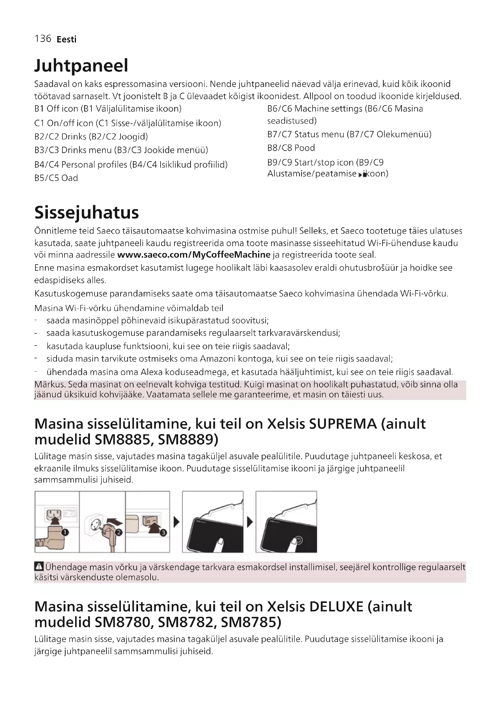 ühendada masina oma Alexa koduseadmega, et kasutada hääljuhtimist, kui see on teie riigis saadaval. Märkus. Seda masinat on eelnevalt kohviga testitud. Kuigi masinat on hoolikalt puhastatud, võib sinna olla jäänud üksikuid kohvijääke. Vaatamata sellele me garanteerime, et masin on täiesti uus. Masina sisselülitamine, kui teil on Xelsis SUPREMA (ainult mudelid SM8885, SM8889) Lülitage masin sisse, vajutades masina tagaküljel asuvale pealülitile. Puudutage juhtpaneeli keskosa, et ekraanile ilmuks sisselülitamise ikoon. Puudutage sisselülitamise ikooni ja järgige juhtpaneelil sammsammulisi juhiseid. Ühendage masin võrku ja värskendage tarkvara esmakordsel installimisel, seejärel kontrollige regulaarselt käsitsi värskenduste olemasolu. Masina sisselülitamine, kui teil on Xelsis DELUXE (ainult mudelid SM8780, SM8782, SM8785) Lülitage masin sisse, vajutades masina tagaküljel asuvale pealülitile. Puudutage sisselülitamise ikooni ja järgige juhtpaneelil sammsammulisi juhiseid.137 Eesti Ühendage masin võrku ja värskendage tarkvara esmakordsel installimisel, seejärel kontrollige regulaarselt käsitsi värskenduste olemasolu. Ühendamine Wi-Fi-ga Ühendage kohvimasin kodu 2,4GHz 802,11 b/g/n Wi-Fi-võrguga. Kohvimasina ühendamine kodu Wi-Fi-võrguga võimaldab paremat kasutuskogemust. Veenduge, et kohvimasin ja Wi-Fi-ruuter asuksid üksteise levialas. Kohvimasina Wi-Fi-võrguga ühendamiseks toimige järgmiselt. 1 Vajutage seadistuste ikooni ja tõmmake sõrmega vasakult paremale, et leida Wi-Fi ikoon. 2 Vajutage Wi-Fi ikooni. 3 Masina ühendamiseks Wi-Fi-võrguga järgige ekraanil kuvatavaid juhiseid. Nüüd olete valmis alustama ühendatud kogemust. Masin teostab automaatse loputustsükli, kui masin hääljuhtimise abil sisse ja välja lülitatakse ning kui masin on mõnda aega tegevusetult olnud ja välja lülitub. Veenduge, et masin oleks ohutus kohas. Erifunktsioonid Erifunktsioon Otstarve Funktsiooni BeanMaestro abil saate valida ubade tüübi ja rösti. Seejärel optimeerib masin kohvi valmistamise seadistused automaatselt, et saada kohviubadest kätte parim võimalik maitse. Funktsioon HygieSteam puhastab automaatselt piimasüsteemi, eemaldades mikroorganismid. Kasutage seda pärast cappuccino või muude piimapõhiste jookide valmistamist.138 Eesti Vastupidav veski on valmistatud 100% keraamilisest materjalist, et see oleks erakordselt tugev ja täpne. Veskil on 12 jahvatusastet, et saaksite selle reguleerida oma maitsele. Hoolduse juhtpaneel näitab informatiivset ülevaadet ja annab teile olekuteavet; näiteks veetaseme kohta või ütleb, et AquaClean-filtri kasutusaeg on lõppemas. Jookide valmistamine Üldised sammud Joogi valmistamiseks peate järgima mõnda lihtsat sammu. 1 Täitke veepaak kraaniveega ja oamahuti ubadega. 2 Asetage üks või kaks tassi reguleeritava kõrgusega väljavoolutila alla. Väljavoolutila kõrguse reguleerimiseks vastavalt kasutatava tassi või klaasi suurusele nihutage tila üles või alla. 3 Jookide menüüsse minemiseks vajutage jookide ikooni . Tõmmake sõrmega vasakult paremale, et valida jook, vajutades sellele.