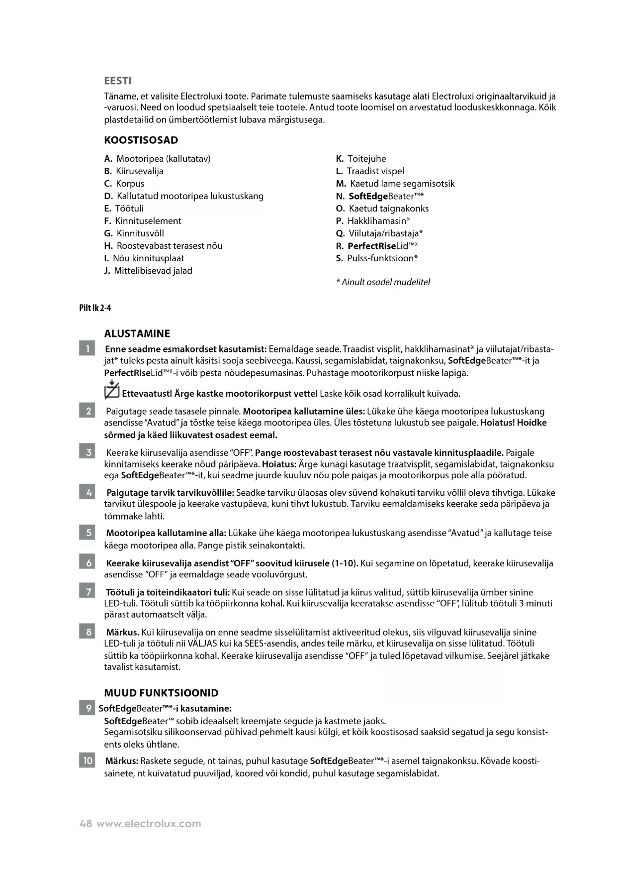 22 Lahutage seade vooluvõrgust. Soovitame traatvisplit, lihahakkurit* ja viilutus-/riivkettaid pesta käsitsi sooja seebiveega. Kaussi, segamislabidat, taignakonksu, SoftEdgeBeater™*-it ja PerfectRiseLid™*-i võib pesta nõudepesumasi- nas. Hoiatus! Ärge pange korpust, pistikut ega toitejuhet vette ega mõnda teise vedelikku. Kuivatage iga osa enne kasutamist põhjalikult. 23 Ärge kasutage seadme puhastamiseks abrasiivseid vahendeid ega küürimisšvamme. Tundke rõõmu oma uuest Electroluxi tootest!50 www.electrolux.com OHUTUSSOOVITUSED Enne seadme esmakordset kasutamist lugege järgmised juhised hoolikalt läbi.