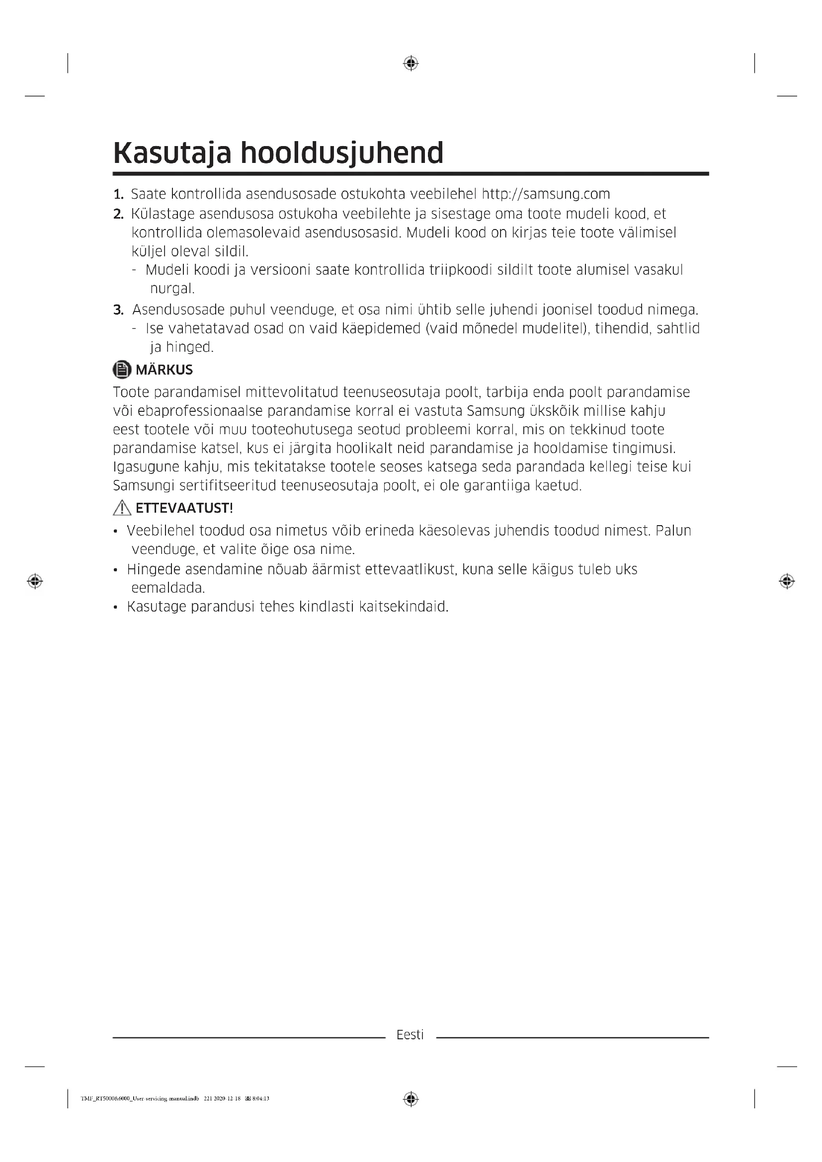 - Ise vahetatavad osad on vaid käepidemed (vaid mõnedel mudelitel), tihendid, sahtlid ja hinged. MÄRKUS Toote parandamisel mittevolitatud teenuseosutaja poolt, tarbija enda poolt parandamise või ebaprofessionaalse parandamise korral ei vastuta Samsung ükskõik millise kahju eest tootele või muu tooteohutusega seotud probleemi korral, mis on tekkinud toote parandamise katsel, kus ei järgita hoolikalt neid parandamise ja hooldamise tingimusi. Igasugune kahju, mis tekitatakse tootele seoses katsega seda parandada kellegi teise kui Samsungi sertifitseeritud teenuseosutaja poolt, ei ole garantiiga kaetud. ETTEVAATUST!