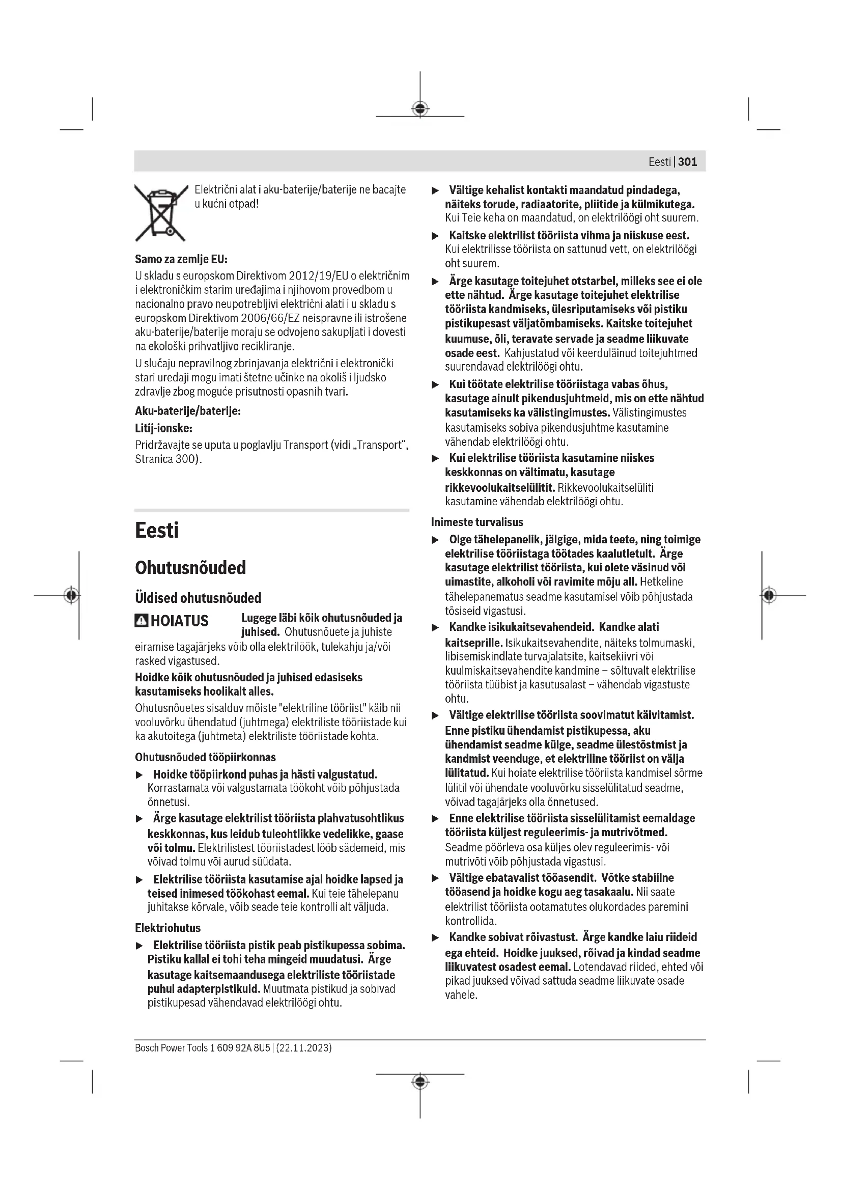 1,5 1,5 1,5 Selles juhendis toodud vibratsioonitaseme ja mürapäästu väärtused on mõõdetud standardset mõõtemeetodit kasutades ja neid saab kasutada elektriliste tööriistade omavaheliseks võrdlemiseks. Need sobivad ka vibratsioonitaseme ja mürapäästu esialgseks hindamiseks. Toodud vibratsioonitaseme ja mürapäästu väärtused on iseloomulikud elektrilise tööriista põhiliste rakenduste korral. Kui aga elektrilist tööriista kasutatakse muudes rakendustes, muude vahetatavate tööriistadega või ebapiisavalt hooldades, võivad vibratsioonitaseme ja mürapäästu väärtused nendest erinevad olla. See võib kogu tööaja vibratsioonitaset ja mürapäästu tunduvalt suurendada. Vibratsioonitaseme ja mürapäästu täpseks hindamiseks tuleb arvesse võtta ka aega, mil seade on välja lülitatud või mil seade on küll sisse lülitatud, kuid tegelikult tööle rakendamata. See võib kogu tööaja vibratsioonitaset ja mürapäästu tunduvalt vähendada. Rakendage kasutaja kaitsmiseks vibratsiooni mõju eest täiendavaid kaitsemeetmeid, nagu näiteks: elektrilise tööriista ja vahetatavate tööriistade hooldus, kätesoojendus, töökorraldus. Aku u Eemaldage aku seadmest enne mis tahes töid seadme kallal (nt hooldus, tarvikute vahetus jmt), samuti enne seadme transportimist ja hoiulepanekut. Lüliti (sisse/ välja) juhuslik käsitsemine toob kaasa vigastuste ohu. Bosch müüb ka juhtmeta elektrilisi tööriistu ilma akuta. Pakendilt näete, kas aku kuulub teie elektrilise tööriista tarnekomplekti. Aku laadimine u Kasutage üksnes tehnilistes andmetes loetletud laadimisseadmeid. Vaid need laadimisseadmed on ette nähtud elektrilises tööriistas kasutatud liitium-ioonaku laadimiseks. Juhis: liitiumioonakud tarnitakse tehasest rahvusvaheliste transpordieeskirjade põhjal osaliselt laetutena. Selleks et aku täielikku võimsust tagada, laadige aku enne esimest kasutamist täielikult täis. Aku paigaldamine Lükake laetud aku akuhoidikusse nii, et see tuntavalt fikseeruks. Aku eemaldamine Aku eemaldamiseks vajutage lukustuse vabastamise nuppe ja tõmmake aku välja. Ärge rakendage seejuures jõudu. Akulon kakslukustusastet, mis takistavad aku väljakukkumist aku lukustuse vabastamisnupu kogemata vajutamisel. Elektritööriista paigaldatud akut hoiab õiges asendis vedru. Aku laetuse taseme näidik Märkus: kõikidel akutüüpidel ei ole laetuse taseme indikaatorit. Rohelised LEDid aku laetuse taseme näidikul näitavad aku laetuse taset. Ohutuse huvides saab aku laetuse taset vaadata ainult väljalülitatud elektrilisel tööriistal. Laetuse taseme vaatamiseks vajutage laetuse taseme näidiku nuppu või . See on võimalik ka väljavõetud aku korral. Kui laetuse taseme näidiku nupuvajutamisel ei sütti ükski LED, on aku defektne ja tuleb välja vahetada. Suunis: aku laetuse taset näidatakse ka kasutajaliideses(vaadake „Oleku näidud“, Lehekülg307). Aku tüüp GBA 18V... LED Mahtuvus Pidev tuli 3× roheline 60–100% Pidev tuli 2× roheline 30–60% Pidev tuli 1× roheline 5–30% Vilkuv tuli 1× roheline 0–5% Aku tüüp ProCORE18V... LED Mahtuvus Pidev tuli 5× roheline 80–100% Pidev tuli 4× roheline 60–80% Pidev tuli 3× roheline 40–60% Pidev tuli 2× roheline 20–40% Pidev tuli 1× roheline 5–20% Vilkuv tuli 1× roheline 0–5% Juhised aku käsitsemiseks Kaitske akut niiskuse ja vee eest. Hoidke aku temperatuuril –20 °C kuni 50 °C. Ärge jätke akut suvel autosse. Puhastage aku ventilatsiooniavasid pehme, puhta ja kuiva pintsliga. Oluliselt lühenenud kasutusaeg pärast laadimist näitab, et aku on muutunud kasutuskõlbmatuks ja tuleb välja vahetada. Järgige ringlussevõtu juhiseid. Paigaldamine u Eemaldage aku seadmest enne mis tahes töid seadme kallal (nt hooldus, tarvikute vahetus jmt), samuti enne Bosch Power Tools 1 609 92A 8U5 | (22.11.2023)306 | Eesti seadme transportimist ja hoiulepanekut. Lüliti (sisse/ välja) juhuslik käsitsemine toob kaasa vigastuste ohu. Salve täitmine (vtjooniseid A1−A4) u Enne tööriista seadistamist, tarvikute vahetamist või seadme ärapanekut eemaldage aku. See ettevaatusabinõu hoiab ära elektrilise tööriista soovimatu käivitumise. Kasutage ainultBosch i originaaltarvikuid. Elektrilise tööriista täppisosad, nagu salv, suue ja lasukanal, on ette nähtud kasutamiseksBosch klambrite, naelte ja tihvtidega. Teised tootjad kasutavad teistsuguse kvaliteediga terast ja teiste mõõtmetega klambreid/naelu. Suunis: Kasutage ainult sissesurutavaid esemeid, mis on spetsifitseeritud tabelis „Tehnilised andmed“. Mittelubatud sisselöödavate kinnitusvahendite kasutamine võib kahjustada elektrilist tööriista ja põhjustada vigastusi. Hoidke elektrilist tööriista salve täitmise ajal nii, et suue (18) ei oleks suunatud ei Teie enda ega teiste inimeste keha poole. – Vajadusel puhastage salveliugur (15) ja veenduge, et salv (14) ei oleks määrdunud. – Lükake sobiv naelalint (20) salve otsas olevasse T-pilusse (14). – Lükake naelalint salves ette nii kaugele, kuni viimane nael jääb salvevedru (21) vastu. Suunis: Elektrooniline seire tuvastab, kas naelad on magasinis. Kui käivitamiskaitse surutakse tühja magasini korral alla, ei käivitu sissesurumistoiming. Sellega välditakse tühilaskusid. – Suruge eelpinguldatud naelaveduk (16) salveliuguri (15) vastu ja samaaegselt tõmmake salveliugur täiesti salve lõppu (14). Suunis: Magasini siibrit peab saama ilma suuremat jõudu rakendamata (ainult sõrmejõuga) tagasi lükata. Kinnikiilutud magasinisiibril on järgmised mõjud: Naela ei tulistata välja, nael jääb lasukanalisse (vaata kinnikiilumist) või nael tulistatakse välja vale nurga all. – Viige salveliugur (15) koos sissevajutatud naelavedukiga (16) ettevaatlikult ette, kuni naelaveduk on üle viimase naela lükatud ja lükake sellega naelalint salves täiesti ette. Juhis: Ärge laske salveliugurit juhitamatult tagasi hüpata. Salveliugur võib seejuures kahjustuda ja on oht, et teie 