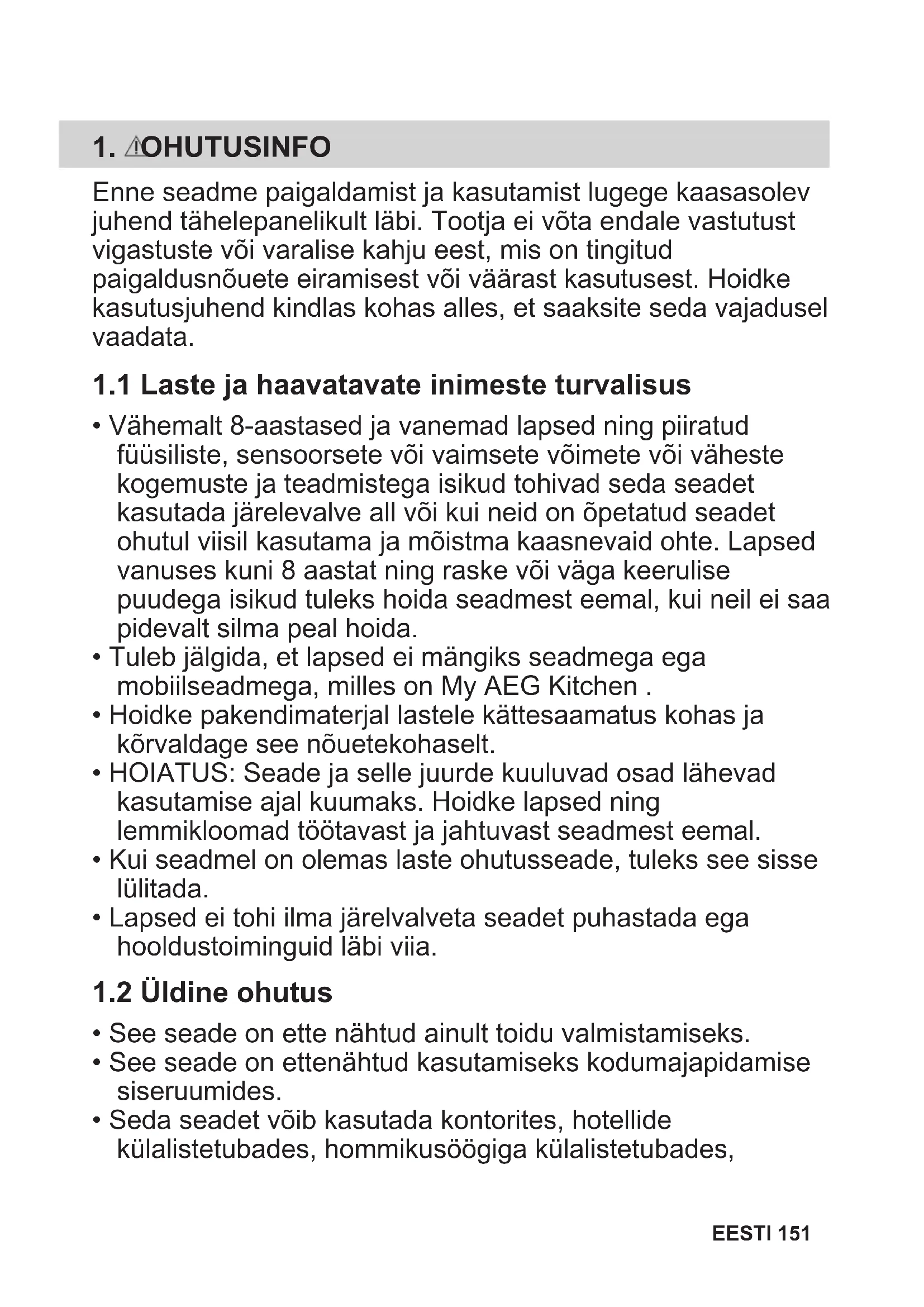 EESTI 149My AEG Kitchen app 150 EESTI1. OHUTUSINFO Enne seadme paigaldamist ja kasutamist lugege kaasasolev juhend tähelepanelikult läbi. Tootja ei võta endale vastutust vigastuste või varalise kahju eest, mis on tingitud paigaldusnõuete eiramisest või väärast kasutusest. Hoidke kasutusjuhend kindlas kohas alles, et saaksite seda vajadusel vaadata.