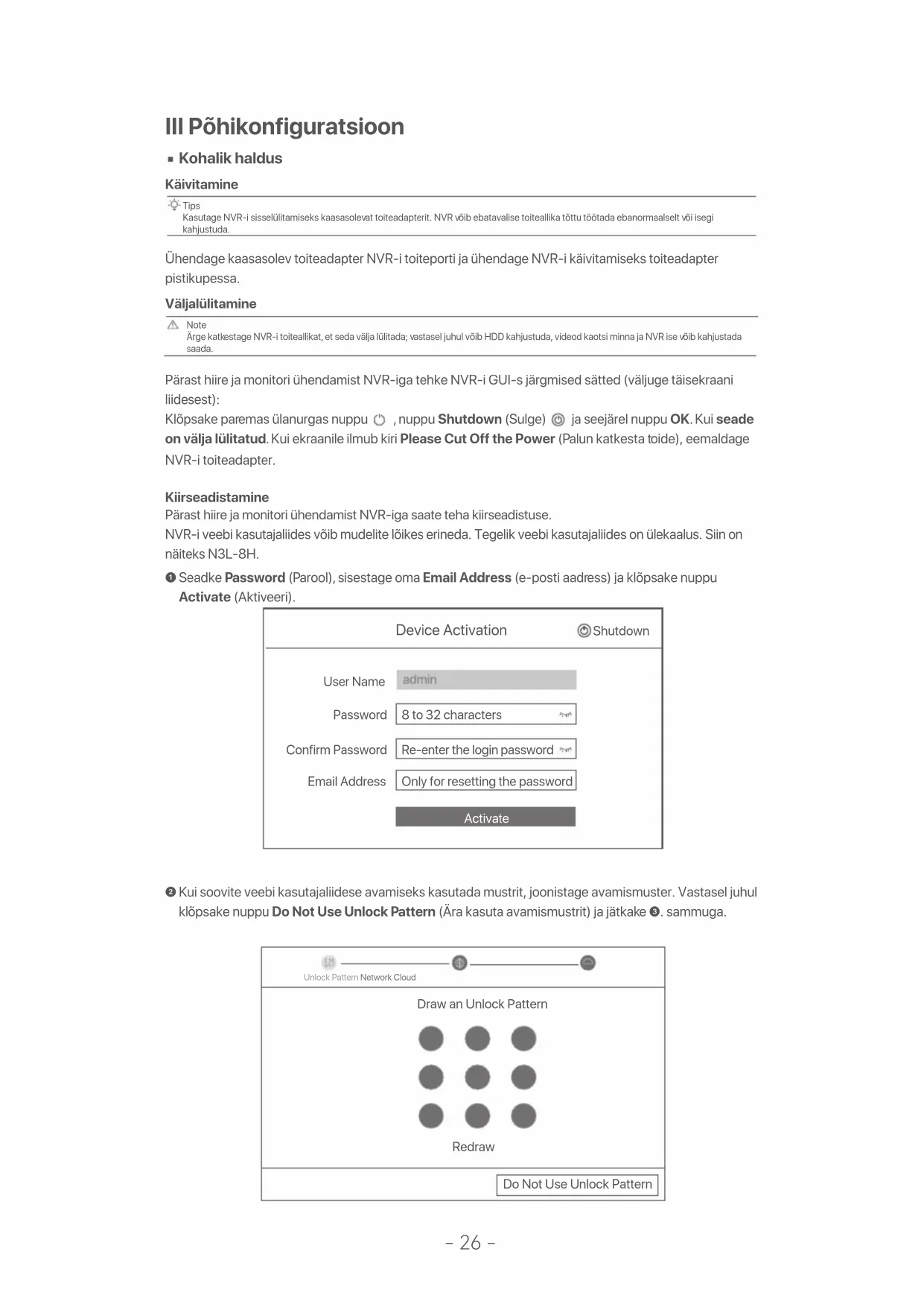 Pärast hiire ja monitori ühendamist NVR-iga saate teha kiirseadistuse. NVR-i veebi kasutajaliides võib mudelite lõikes erineda. Tegelik veebi kasutajaliides on ülekaalus. Siin on näiteks N3L-8H. Seadke Password (Parool), sisestage oma Email Address (e-posti aadress) ja klõpsake nuppu Activate (Aktiveeri). Pärast hiire ja monitori ühendamist NVR-iga tehke NVR-i GUI-s järgmised sätted (väljuge täisekraani liidesest): Klõpsake paremas ülanurgas nuppu , nuppu Shutdown (Sulge) ja seejärel nuppu OK. Kui seade on välja lülitatud. Kui ekraanile ilmub kiri Please Cut Off the Power (Palun katkesta toide), eemaldage NVR-i toiteadapter. Käivitamine Kohalik haldus Ühendage kaasasolev toiteadapter NVR-i toiteporti ja ühendage NVR-i käivitamiseks toiteadapter pistikupessa. Kasutage NVR-i sisselülitamiseks kaasasolevat toiteadapterit. NVR võib ebatavalise toiteallika tõttu töötada ebanormaalselt või isegi kahjustuda. Väljalülitamine Note Tips Ärge katkestage NVR-i toiteallikat, et seda välja lülitada; vastasel juhul võib HDD kahjustuda, videod kaotsi minna ja NVR ise võib kahjustada saada. Device Activation 8 to 32 charactersRe-enter the login passwordOnly for resetting the passwordUser NamePasswordConfirm PasswordEmail AddressActivate admin ShutdownUnlock Pattern Network CloudDraw an Unlock PatternRedrawDo Not Use Unlock Pattern