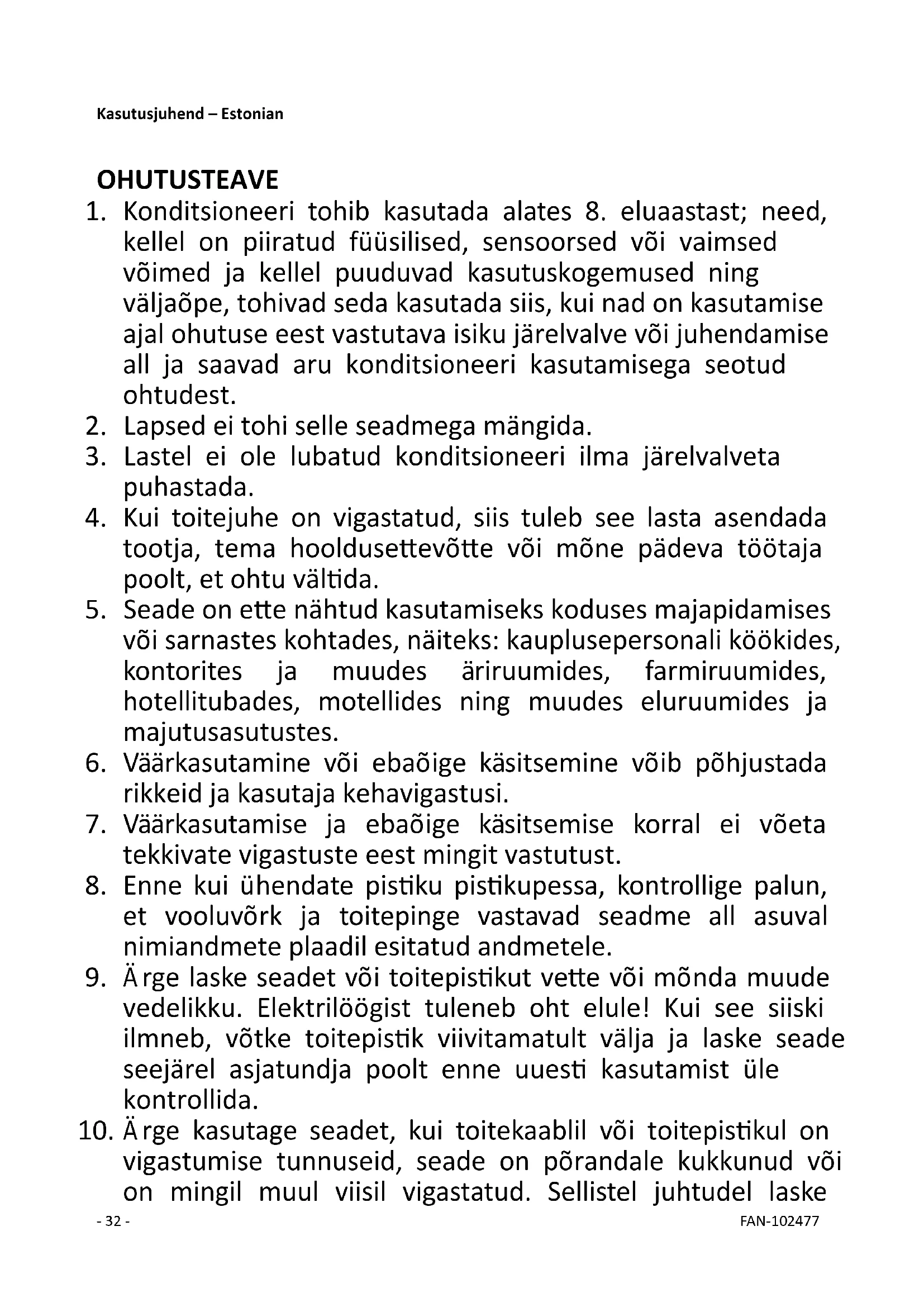 1. Konditsioneeri tohib kasutada alates 8. eluaastast; need,