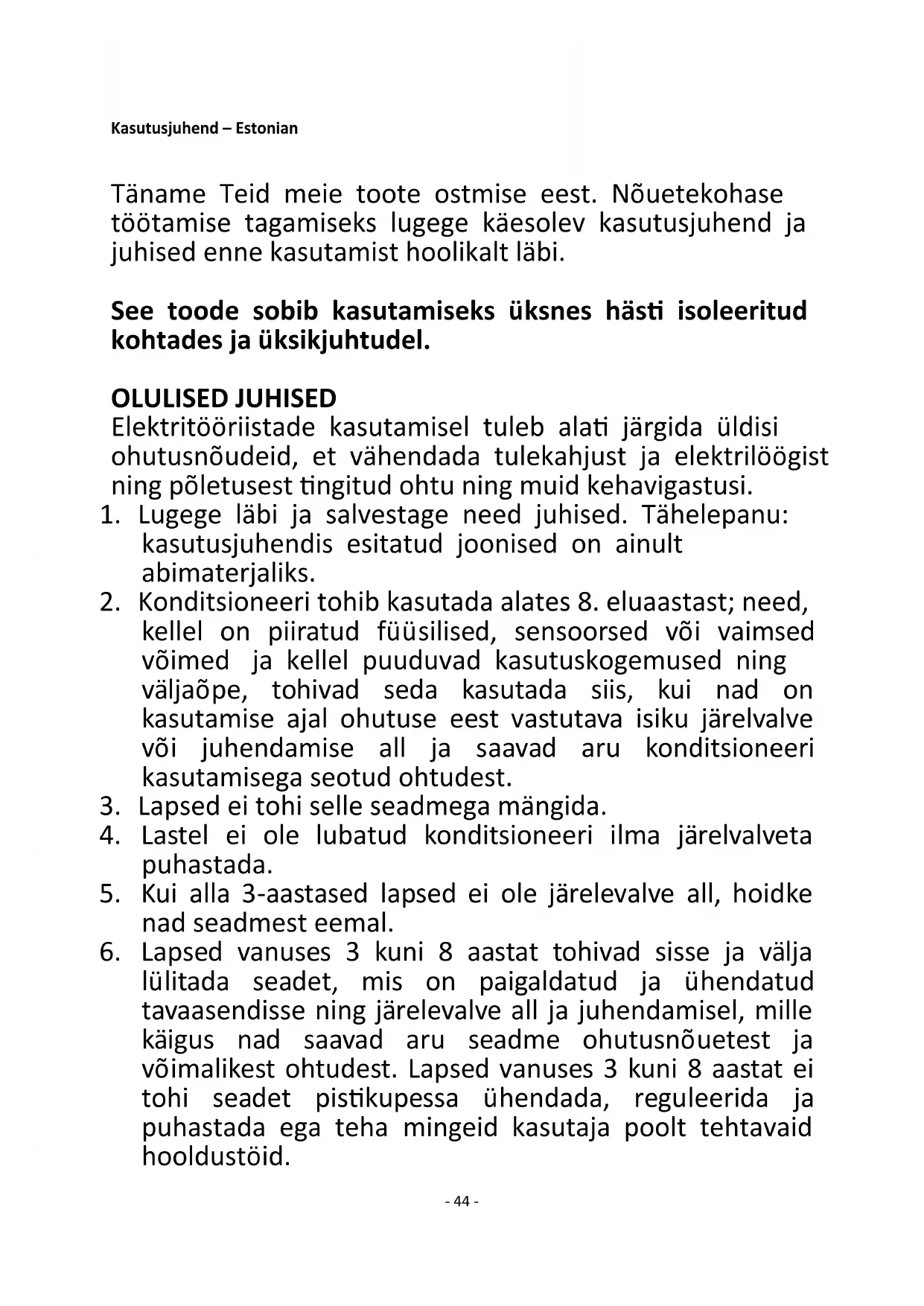 2. Konditsioneeri tohib kasutada alates 8. eluaastast; need,