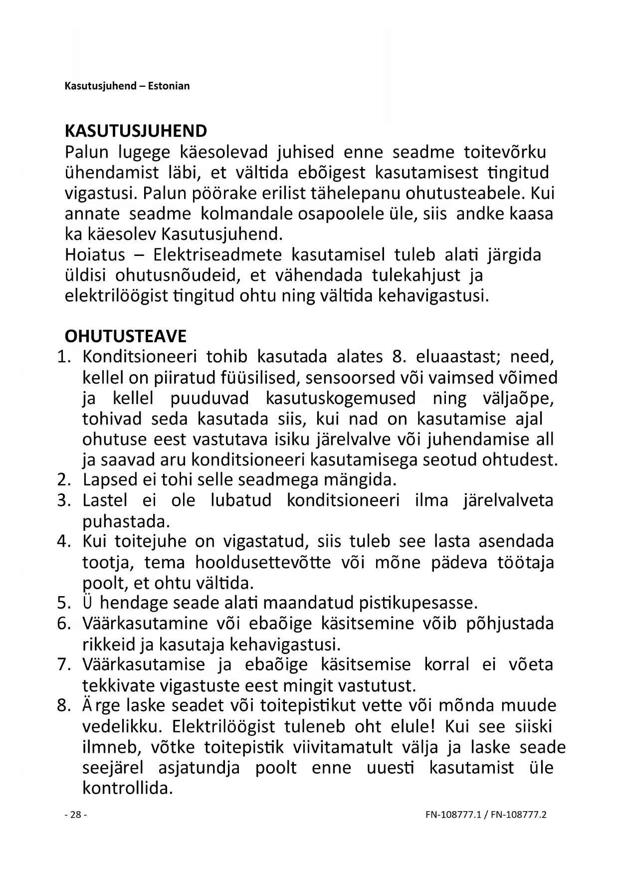 1. Konditsioneeri tohib kasutada alates 8. eluaastast; need,
