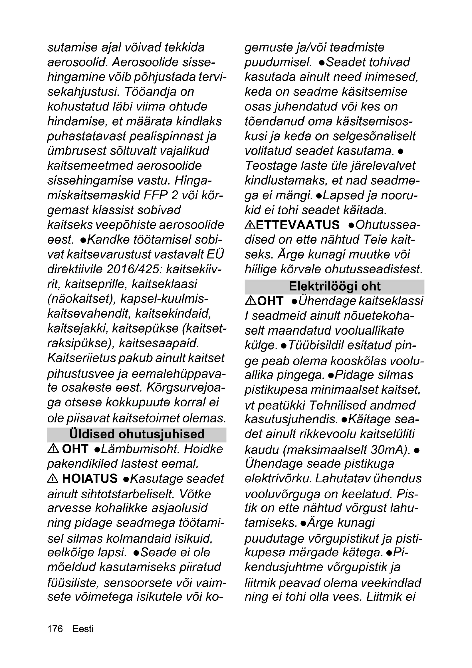 Ohutusjuhised Maksimaalsurvepesur Enne seadme esmast kasutamist lugege need ohutusjuhised ja originaal- kasutusjuhend läbi. Toimige nei- le vastavalt. Hoidke mõlemad brošüürid hilisemaks kasutami- seks või järgmise omaniku tar- beks alles. Lisaks kasutusjuhendis esita- tud juhistele peate Te arvesse võtma ka seadusandja üldisi ohutusalaseid ja õnnetusjuh- tumite vältimise eeskirju. Seadmele paigaldatud hoia- tussildid ja osutavad sildid an- navad olulisi juhiseid ohutuks käituseks. Ohuastmed OHT Viide vahetult ähvardavale ohu- le, mis võib põhjustada raskeid kehavigastusi või lõppeda sur- maga. 몇 HOIATUS Viide võimalikule ohtlikule olu- korrale, mis võib põhjustada ras- keid kehavigastusi või lõppeda surmaga. 몇 ETTEVAATUS Viide võimalikule ohtlikule olu- korrale, mis võib põhjustada ker- geid vigastusi. TÄHELEPANU Viide võimalikule ohtlikule olu- korrale, mis võib põhjustada va- rakahjusid. Isiklik kaitsevarustus 몇 ETTEVAATUS Kandke seadmega töötamisel sobivaid kindaid. Kõrgsurvepesurite ka-176 Eesti sutamise ajal võivad tekkida aerosoolid. Aerosoolide sisse- hingamine võib põhjustada tervi- sekahjustusi. Tööandja on kohustatud läbi viima ohtude hindamise, et määrata kindlaks puhastatavast pealispinnast ja ümbrusest sõltuvalt vajalikud kaitsemeetmed aerosoolide sissehingamise vastu. Hinga- miskaitsemaskid FFP 2 või kõr- gemast klassist sobivad kaitseks veepõhiste aerosoolide eest. Kandke töötamisel sobi- vat kaitsevarustust vastavalt EÜ direktiivile 2016/425: kaitsekiiv- rit, kaitseprille, kaitseklaasi (näokaitset), kapsel-kuulmis- kaitsevahendit, kaitsekindaid, kaitsejakki, kaitsepükse (kaitset- raksipükse), kaitsesaapaid. Kaitseriietus pakub ainult kaitset pihustusvee ja eemalehüppava- te osakeste eest. Kõrgsurvejoa- ga otsese kokkupuute korral ei ole piisavat kaitsetoimet olemas. Üldised ohutusjuhised OHT Lämbumisoht. Hoidke pakendikiled lastest eemal. 몇 HOIATUS Kasutage seadet ainult sihtotstarbeliselt. Võtke arvesse kohalikke asjaolusid ning pidage seadmega töötami- sel silmas kolmandaid isikuid, eelkõige lapsi. Seade ei ole mõeldud kasutamiseks piiratud füüsiliste, sensoorsete või vaim- sete võimetega isikutele või ko- gemuste ja/või teadmiste puudumisel. Seadet tohivad kasutada ainult need inimesed, keda on seadme käsitsemise osas juhendatud või kes on tõendanud oma käsitsemisos- kusi ja keda on selgesõnaliselt volitatud seadet kasutama. Teostage laste üle järelevalvet kindlustamaks, et nad seadme- ga ei mängi. Lapsed ja nooru- kid ei tohi seadet käitada. 몇 ETTEVAATUS Ohutussea- dised on ette nähtud Teie kait- seks. Ärge kunagi muutke või hiilige kõrvale ohutusseadistest. Elektrilöögi oht OHT Ühendage kaitseklassi I seadmeid ainult nõuetekoha- selt maandatud vooluallikate külge. Tüübisildil esitatud pin- ge peab olema kooskõlas voolu- allika pingega. Pidage silmas pistikupesa minimaalset kaitset, vt peatükki Tehnilised andmed kasutusjuhendis. Käitage sea- det ainult rikkevoolu kaitselüliti kaudu (maksimaalselt 30mA). Ühendage seade pistikuga elektrivõrku. Lahutatav ühendus vooluvõrguga on keelatud. Pis- tik on ette nähtud võrgust lahu- tamiseks. Ärge kunagi puudutage võrgupistikut ja pisti- kupesa märgade kätega. Pi- kendusjuhtme võrgupistik ja liitmik peavad olema veekindlad ning ei tohi olla vees. Liitmik eiEesti 177 tohi asuda maapinnal. Kasutage kaablitrumleid, mis tagavad, et pistikupesad asuvad vähemalt 60 mm maapinna kohal. Kõik voolu juhtivad osad tööpiirkon- nas peavad olema veejoa eest kaitstud. Kasutage ainult veepritsmete eest kaitstud pi- kenduskaableid kasutusjuhen- dis esitatud vähima ristlõikega. Hoidke ära ühenduse asumine vees. Ärge puhastage seadet kõrgsurve- või madalsurve-vee- joaga. 몇 HOIATUS Ühendage seade ainult elektrilise ühenduse kül- ge, mis on teostatud elektrispet- sialisti poolt IEC 60364-1 kohaselt. Kontrollige võrgupis- tikuga võrguühendusjuhet enne iga käitamist kahjustuste suhtes. Ärge võtke kahjustatud võrgu- ühendusega seadet käiku. Las- ke kahjustatud võrguühendusjuhe viivitamatult volitatud klienditeenindusel / elektrispetsialistil välja vaheta- da. Ärge vigastage või kahjus- tage võrguühendus- ja pikendusjuhet ülesõitmise, mul- jumise, tirimise või sellesarna- sega. Kaitske võrguühendusjuhet kuumuse, õli ja teravate servade eest. Kasutage ainult tootja poolt ette- kirjutatud toitejuhet, see kehtib ka juhtme asenduse korral. Telli- misnr ja tüüpi vt kasutusjuhen- dist. Ebasobivad elektrilised pikendusjuhtmed võivad olla ohtlikud. Kasutage välitingimus- tes ainult selleks lubatud ja vas- tavalt tähistatud elektrilisi pikendusjuhtmeid piisava juht- me ristlõikega. lAsendage võr- guühendus- või pikendusjuhtme liitmikud ainult sama veepidavu- se ja sama mehaanilise vastupi- davusega liitmikega. 몇 ETTEVAATUS Lülitage pi- kematel käituspausidel ja vasta- valt vajadusele seade pealülitist / seadmelülitist välja ja tõmmake võrgupistik pistikupesast välja. TÄHELEPANU Sisselülitus- protsessid põhjustavad lühiajali- si pingelangusi. Ebasoodsate võrgutingimuste korral võivad tekkida teiste seadmete kahjus- tused. Võrgu impendatsi korral alla 0,15 oomi ei ole rikkeid oo- data. Veeühendus 몇 HOIATUS Kõigi ühendus- voolikute keermesliide peab ole- ma tihe. Ärge ületage lubatud vee pealevoolu temperatuuri. Paigaldage voolikjuhtmed kind- lalt. TÄHELEPANU Kasutage ai- nult voolikjuhtmeid, mis vasta- vad töörõhu nõuetele, mehaanilisele ja keemilisele koormusele. Ärge ületage voo- likjuhtmete vähimat lubatud painderaadiust allapoole. Va- hetage voolikjuhtmeid asjako-178 Eesti haste ajavahemike tagant ka siis, kui puudusi pole näha. Voo- likjuhtmetel on piiratud eluiga.