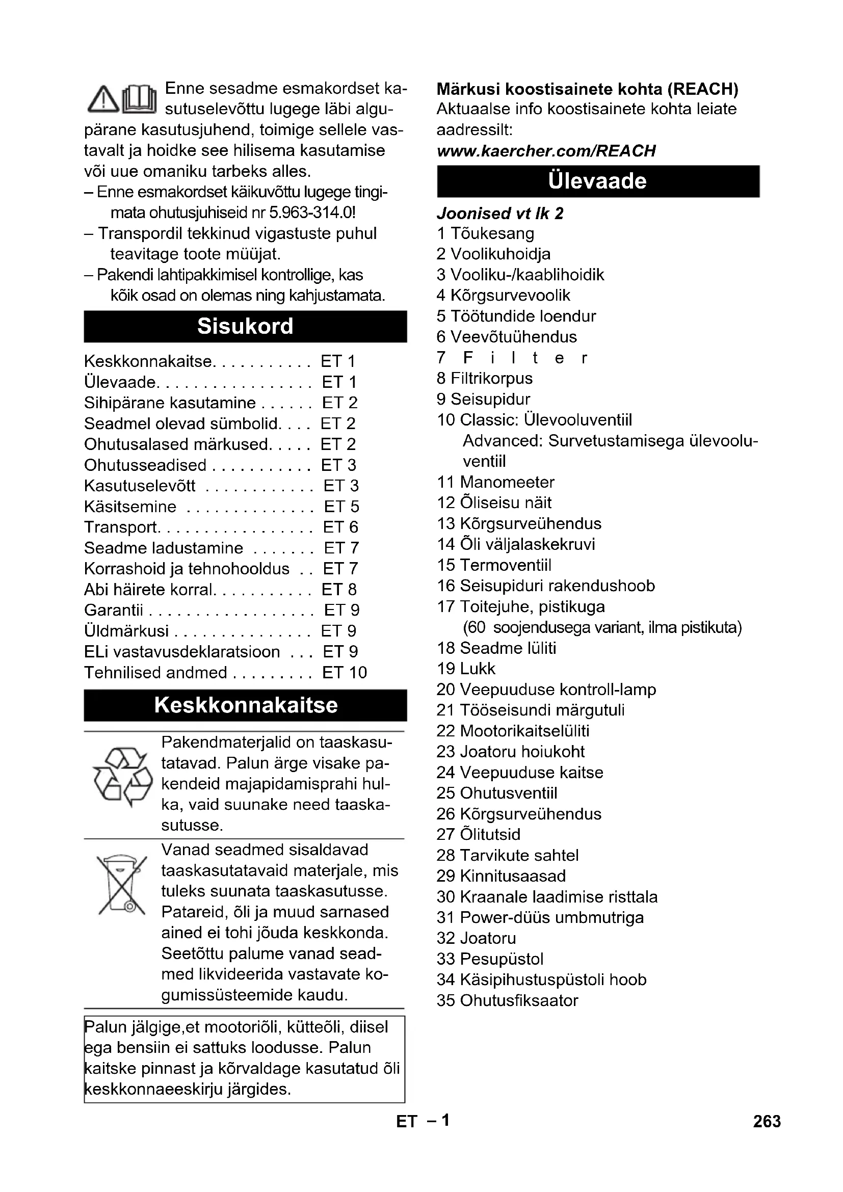 dB(A) 101 Основание за освобождаване съгласно Регламент (ЕС) 2019/1781, приложение I, раздел 2 (12): j) 262 BG– 1 Enne sesadme esmakordset ka- sutuselevõttu lugege läbi algu- pärane kasutusjuhend, toimige sellele vas- tavalt ja hoidke see hilisema kasutamise või uue omaniku tarbeks alles. – Enne esmakordset käikuvõttu lugege tingi- mata ohutusjuhiseid nr 5.963-314.0! – Transpordil tekkinud vigastuste puhul teavitage toote müüjat. – Pakendi lahtipakkimisel kontrollige, kas kõik osad on olemas ning kahjustamata. Märkusi koostisainete kohta (REACH) Aktuaalse info koostisainete kohta leiate aadressilt: www.kaercher.com/REACH Joonised vt lk 2 1 Tõukesang 2 Voolikuhoidja 3 Vooliku-/kaablihoidik 4 Kõrgsurvevoolik 5 Töötundide loendur 6 Veevõtuühendus 7Filter 8 Filtrikorpus 9 Seisupidur 10 Classic: Ülevooluventiil Advanced: Survetustamisega ülevoolu- ventiil 11 Manomeeter 12 Õliseisu näit 13 Kõrgsurveühendus 14 Õli väljalaskekruvi 15 Termoventiil 16 Seisupiduri rakendushoob 17 Toitejuhe, pistikuga (60 soojendusega variant, ilma pistikuta) 18 Seadme lüliti 19 Lukk 20 Veepuuduse kontroll-lamp 21 Tööseisundi märgutuli 22 Mootorikaitselüliti 23 Joatoru hoiukoht 24 Veepuuduse kaitse 25 Ohutusventiil 26 Kõrgsurveühendus 27 Õlitutsid 28 Tarvikute sahtel 29 Kinnitusaasad 30 Kraanale laadimise risttala 31 Power-düüs umbmutriga 32 Joatoru 33 Pesupüstol 34 Käsipihustuspüstoli hoob 35 Ohutusfiksaator Sisukord Keskkonnakaitse. . . . . . . . . . . ET 1 Ülevaade. . . . . . . . . . . . . . . . . ET 1 Sihipärane kasutamine . . . . . . ET 2 Seadmel olevad sümbolid. . . . ET 2 Ohutusalased märkused. . . . . ET 2 Ohutusseadised . . . . . . . . . . . ET 3 Kasutuselevõtt . . . . . . . . . . . . ET 3 Käsitsemine . . . . . . . . . . . . . . ET 5 Transport. . . . . . . . . . . . . . . . . ET 6 Seadme ladustamine . . . . . . . ET 7 Korrashoid ja tehnohooldus . . ET 7 Abi häirete korral. . . . . . . . . . . ET 8 Garantii . . . . . . . . . . . . . . . . . . ET 9 Üldmärkusi . . . . . . . . . . . . . . . ET 9 ELi vastavusdeklaratsioon . . . ET 9 Tehnilised andmed . . . . . . . . . ET 10 Keskkonnakaitse Pakendmaterjalid on taaskasu- tatavad. Palun ärge visake pa- kendeid majapidamisprahi hul- ka, vaid suunake need taaska- sutusse. Vanad seadmed sisaldavad taaskasutatavaid materjale, mis tuleks suunata taaskasutusse. Patareid, õli ja muud sarnased ained ei tohi jõuda keskkonda. Seetõttu palume vanad sead- med likvideerida vastavate ko- gumissüsteemide kaudu. Palun jälgige,et mootoriõli, kütteõli, diisel ega bensiin ei sattuks loodusse. Palun kaitske pinnast ja kõrvaldage kasutatud õli keskkonnaeeskirju järgides. Ülevaade 263ET– 2 – Puhastusprotsessi juhtelemendid on kollased. – Hoolduse ja teeninduse juhtelemendid on helehallid. Seda kõrgsurvepesurit tohib kasutada ai- nult: – masinate, sõidukite, ehitiste, tööriistade puhastamiseks. – koos Kärcheri poolt kasutamiseks luba- tud tarvikute ja varuosadega. 몇 HOIATUS Jälgige veevarustusettevõtte eeskirju. Vastavalt kehtivatele eeskirjadele ei tohi seadet kunagi kasutada ilma joogiveevõrgu juurde paigal- datud süsteemieraldajata. Kasuta- da tuleb firma KÄRCHER sobivat süstee- mieraldajat või alternatiivina standardile EN 12729 tüüp BA vastavat süsteemieraldajat. Läbi süsteemieraldaja voolanud vesi ei ole joogikõlbulik. 몇 ETTEVAATUS Ühendage tagasivoolutakisti alati veevarus- tusega, mitte kunagi vahetult seadmega. OHT Osutab vahetult ähvardavale ohule, mis võib põhjustada tõsiseid kehavigastusi või lõppeda surmaga. 몇 HOIATUS Osutab võimalikule ohtlikule olukorrale, mis võib põhjustada tõsiseid kehavigastusi või lõppeda surmaga. 몇 ETTEVAATUS Viide võimalikule ohtlikule olukorrale, mis võib põhjustada kergeid vigastusi. TÄHELEPANU Viide võimalikule ohtlikule olukorrale, mis võib põhjustada materiaalset kahju. OHT Vigastusoht! – Kasutage ainult originaal-kõrgsurve- voolikuid. – Kõrgsurvevoolik ja pritsimisseadis pea- vad sobima tehnilistes andmetes too- dud maksimaalse tööülerõhuga. – Vältige kokkupuudet kemikaalidega. – Kontrollige kõrgsurvevoolikut iga päev. Ärge jätkake murdunud voolikute kasu- tamist. Kui välimine traadikiht on nähtav, ei tohi kõrgsurvevoolikut enam kasutada. – Vigastatud keermetega kõrgsurvevooli- kut ei tohi enam kasutada. Värvitde tähendus Sihipärane kasutamine Seadmel olevad sümbolid Kõrgsurveline veejuga võib mittesihipärasel ka- sutamisel ohtlik olla. Vee- juga ei tohi suunata ini- mestele, loomadele, pin- gestatud elektriseadme- tele ega seadmele endale. Vigastusoht külmuva vee tõttu! Hoidke seadet tal- vel köetud ruumis või tüh- jendage. Kuulmiskahjustuste oht. Kandke seadmega tööta- misel tingimata sobilikku kuulmiskaitsevahendit. Vigastusoht! Kandke kaitseprille. Tulistest pindadest läh- tuv põletusoht! Hoiatus ohtliku elektripin- ge eest! Ohutusalased märkused Ohuastmed Kõrgsurvevoolik 264 ET– 3 – Asetage kõrgsurvevoolik nii, et sellest ei oleks võimalik üle sõita. – Ärge jätkake vooliku kasutamist, millest on üle sõidetud, mida on murtud või mis on talunud lööke - ka siis mitte, kui näh- tavad vigastused puuduvad. – Ladustage kõrgsurvevoolikut nii, et oleks välditud mehaaniline koormus. – Kõrgsurvevooliku ühenduse keerme- muhvide maksimaalne pingutusmo- ment 20 Nm. Ohutusmeetmed seadmel kaitsevad kasu- tajat ja neid ei tohi välja lülitada ega nende funktsioone takistada. See lüliti takistab seadme kogemata käivi- tamist. Lülitage välja, kui töös on vaheaeg või kui lõpetate töö. Käsipihustuspüstoli fikseerimisaste hoiab ära käsipihustuspüstoli tahtmatu vallanda- mise. – ainult Classic-variandil – Kui pesupüstol suletakse, avaneb üle- vooluventiil ja kogu vesi voolab tagasi pumba imipoolele. Ülevooluventiil on tehasepoolselt seadista- tud ja plommitud. Seadistamine ainult klienditeeni