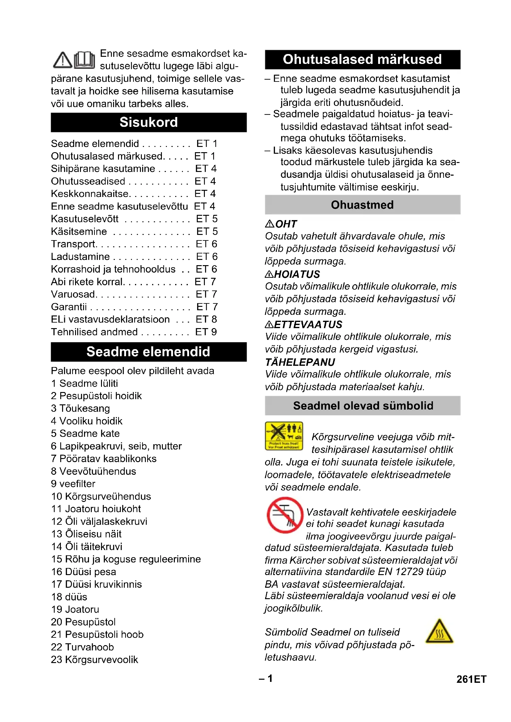 dB(A) 95 93 Горивни материали Количество на маслото л 0,4 Вид масло -- 15W40 Мерки и тегла Дължина мм 700 Широчина мм 455 Височина мм 1010 Тегло кг 55,4 60,9 Основание за освобождаване съгласно Регламент (ЕС) 2019/1781, приложение I, раздел 2 (12): j) 260 BG– 1 Enne sesadme esmakordset ka- sutuselevõttu lugege läbi algu- pärane kasutusjuhend, toimige sellele vas- tavalt ja hoidke see hilisema kasutamise või uue omaniku tarbeks alles. Palume eespool olev pildileht avada 1 Seadme lüliti 2 Pesupüstoli hoidik 3 Tõukesang 4 Vooliku hoidik 5 Seadme kate 6 Lapikpeakruvi, seib, mutter 7 Pööratav kaablikonks 8 Veevõtuühendus 9 veefilter 10 Kõrgsurveühendus 11 Joatoru hoiukoht 12 Õli väljalaskekruvi 13 Õliseisu näit 14 Õli täitekruvi 15 Rõhu ja koguse reguleerimine 16 Düüsi pesa 17 Düüsi kruvikinnis 18 düüs 19 Joatoru 20 Pesupüstol 21 Pesupüstoli hoob 22 Turvahoob 23 Kõrgsurvevoolik – Enne seadme esmakordset kasutamist tuleb lugeda seadme kasutusjuhendit ja järgida eriti ohutusnõudeid. – Seadmele paigaldatud hoiatus- ja teavi- tussildid edastavad tähtsat infot sead- mega ohutuks töötamiseks. – Lisaks käesolevas kasutusjuhendis toodud märkustele tuleb järgida ka sea- dusandja üldisi ohutusalaseid ja õnne- tusjuhtumite vältimise eeskirju. OHT Osutab vahetult ähvardavale ohule, mis võib põhjustada tõsiseid kehavigastusi või lõppeda surmaga. 몇 HOIATUS Osutab võimalikule ohtlikule olukorrale, mis võib põhjustada tõsiseid kehavigastusi või lõppeda surmaga. 몇 ETTEVAATUS Viide võimalikule ohtlikule olukorrale, mis võib põhjustada kergeid vigastusi. TÄHELEPANU Viide võimalikule ohtlikule olukorrale, mis võib põhjustada materiaalset kahju. Kõrgsurveline veejuga võib mit- tesihipärasel kasutamisel ohtlik olla. Juga ei tohi suunata teistele isikutele, loomadele, töötavatele elektriseadmetele või seadmele endale. Vastavalt kehtivatele eeskirjadele ei tohi seadet kunagi kasutada ilma joogiveevõrgu juurde paigal- datud süsteemieraldajata. Kasutada tuleb firma Kärcher sobivat süsteemieraldajat või alternatiivina standardile EN 12729 tüüp BA vastavat süsteemieraldajat. Läbi süsteemieraldaja voolanud vesi ei ole joogikõlbulik. Sümbolid Seadmel on tuliseid pindu, mis võivad põhjustada põ- letushaavu. Sisukord Seadme elemendid . . . . . . . . . ET 1 Ohutusalased märkused. . . . . ET 1 Sihipärane kasutamine . . . . . . ET 4 Ohutusseadised . . . . . . . . . . . ET 4 Keskkonnakaitse. . . . . . . . . . . ET 4 Enne seadme kasutuselevõttu ET 4 Kasutuselevõtt . . . . . . . . . . . . ET 5 Käsitsemine . . . . . . . . . . . . . . ET 5 Transport. . . . . . . . . . . . . . . . . ET 6 Ladustamine . . . . . . . . . . . . . . ET 6 Korrashoid ja tehnohooldus . . ET 6 Abi rikete korral. . . . . . . . . . . . ET 7 Varuosad. . . . . . . . . . . . . . . . . ET 7 Garantii . . . . . . . . . . . . . . . . . . ET 7 ELi vastavusdeklaratsioon . . . ET 8 Tehnilised andmed . . . . . . . . . ET 9 Seadme elemendid Ohutusalased märkused Ohuastmed Seadmel olevad sümbolid 261ET– 2 Elektrilöögist lähtuv oht. Korpust tohivad avada ainult elektrikud. – Tüübisildil märgitud pinge peab vasta- ma vooluahela pingele. – Pistikupesa minimaalne kaitse (vt Teh- nilised andmed). – Ohutusklass I - Seadmeid tohib ühen- dada ainult nõuetekohaselt maandatud vooluallikatega. – Soovitatakse ühendada seade ainult sellisesse pistikupessa, mis on kaitstud 30 mA rikkevoolu-kaitselülitiga. – Tuleb kasutada tootja poolt ettenähtud toitekaablit, see kehtib ka kaabli vahe- tamise korral. Tellimisnr. ja tüüpi vt ka- sutusjuhendist. – Enne igakordset kasutamist tuleb kont- rollida, et võrgupistikuga toitejuhe oleks kahjustusteta. Kahjustatud toitejuhe lasta viivitamatult volitatud hooldustöö- kojal/elektrikul välja vahetada. – Seadet tohib ühendada ainult pistikupessa, mis on elektrimontööri poolt paigaldatud vastavalt standardile IEC 60364-1. – Sisselülitamise ajal tekkib lühiajaline pingelangus. – Kui võrgutingimused on ebasoodsad, võib see teisi seadmeid negatiivselt mõ- jutada. – Ärge kunagi puudutage võrgupistikut märgade kätega. – Jälgige, et toitejuhet või pikendusjuhet ei kahjustataks sellest ülesõitmisega, muljumisega, rebimisega ega muul vii- sil. Kaitske kaablit kuumuse, õli ja tera- vate servade eest. – Pikenduskaablil peab olema kasutusju- hendis toodud ristlõige ja kaabel peab olema kaitstud veepritsmete eest. Ühenduskoht ei tohi olla vees. – Pikenduskaabli toitepistik ja pistmik peavad olema veekindlad ning ei tohi paikneda vees. Pistmik ei tohi ka põrandal olla. Soo- vitame kasutada kaablitrumleid, mis taga- vad, et pistikupesad on vähemalt 60 mm põrandast kõrgemal. – Mittesobivad elektrilised pikendusjuht- med võivad olla ohtlikud. Välistingimus- tes võib kasutada ainult väljas kasuta- miseks lubatud ja vastavalt tähistatud piisava ristlõikepinnaga elektrilisi piken- dusjuhtmeid: – Kontrollige toitekaablit regulaarsete ajavahemike tagant vigastuste osas, nt rebenenud kohad või vananemine. Kui teete kindlaks kahjustuste olemasolu, tuleb juhe välja vahetada, enne kui jät- kate masina kasutamist. – Võrgu- või pikenduskaabli konnektorite väljavahetamise korral peab olema ta- gatud kaitstus veepritsmete vastu ning mehhaaniline stabiilsus. – Masinat ei tohi puhastada voolikust tu- leva või kõrgsurvejoaga (lühiste või muude kahjustuste oht). – Ärge kasutage seadet temperatuuridel alla 0 °C. – Järgige oma veevarustusettevõtte ees- kirju. – Ühendusvoolikute keermesühendused ei tohi lekkida. – Kõrgsurvevoolik peab olema terve. De- fektne kõrgsurvevoolik tuleb viivitama- tult välja vahetada. Kasutada tohib ai- nult tootja poolt soovitatud voolikuid ja ühendusi. Tellimisnr. vt kasutusjuhen- dist. – Enne kasutamist tul