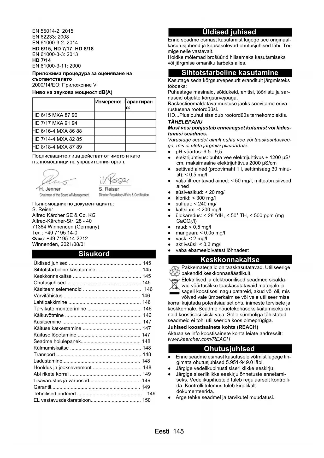 2,5 2,5 2,5 2,5 2,5 2,5 2,5 Veevõtuühendus Juurdevoolurõhk (maks.) MPa1111111150 Eesti Erandi põhjus vastavalt määrusele (EL) 2019/1781 lisa I peatükile 2 (12): j) Õigus tehnilisteks muudatusteks. EL vastavusdeklaratsioon Käesolevaga deklareerime, et alljärgnevalt nimetatud masin vastab oma kontseptsiooni ja koosteliigi põhjal ning meie poolt turule viidud teostuses EL direktiivide asjaomastele põhilistele ohutus- ja tervisenõuetele. Ma- sinal meiega kooskõlastamata muudatuste teostamisel kaotab käesolev deklaratsioon kehtivuse. Toode: Kõrgsurvepesur Typ: 1.150-xxx Typ: 1.151-xxx Typ: 1.524-xxx Asjaomased EL direktiivid 2000/14/EÜ 2006/42/EÜ (+2009/127/EÜ) 2011/65/EL 2014/30/EL 2009/125/EÜ Kohaldatud määrus(ed) (EL) 2009/1781 Kohaldatud ühtlustatud normid EN 60335-1 EN 60335-2-79 EN IEC 63000: 2018 EN 55014-1: 2017 + A11: 2020 EN 55014-2: 2015 EN 62233: 2008 EN 61000-3-2: 2014 HD 6/15, HD 7/17, HD 8/18 EN 61000-3-3: 2013 HD 7/14 EN 61000-3-11: 2000 Kohandatud vastavushindamismenetlus 2000/14/EÜ: Lisa V Helivõimsustase dB(A) Allakirjutanud tegutsevad juhatuse ülesandel ja volitu- sega. Dokumentatsioonivolinik: S. Reiser Alfred Kärcher SE & Co. KG Alfred-Kärcher-Str. 28 - 40 Juurdevoolu temperatuur (maks.) °C 60 60 60 60 60 60 60 Juurdevoolu kogus (min.) l/min 13 13 15 13 15 15 16 Sissevõtu kõrgus (maks.) m 0,5 0,5 0,5 0,5 0,5 0,5 0,5 Seadme võimsusandmed Standarddüüsi suurus 033 038 040 034 043 042 042 Töörõhk MPa 15 12 17 16 14 16 18 Töö ülerõhk (maks.) MPa 22,5 18 25,5 24 21 24 27 Juurdevoolu kogus, vesi l/min 9,3 9,6 11,6 9,9 11,5 11,6 12,5 Kõrgsurvepüstoli tagasilöögijõud N 28,6 28,6 35,5 30 32,2 34,5 41,8 Mõõtmed ja kaalud Tüüpiline töökaal kg 37373945464648 Pikkus mm 455 455 455 455 455 455 455 Laius mm 400 400 400 400 400 400 400 Kõrgus, tõukesang all, (üleval) mm 890 (970)
