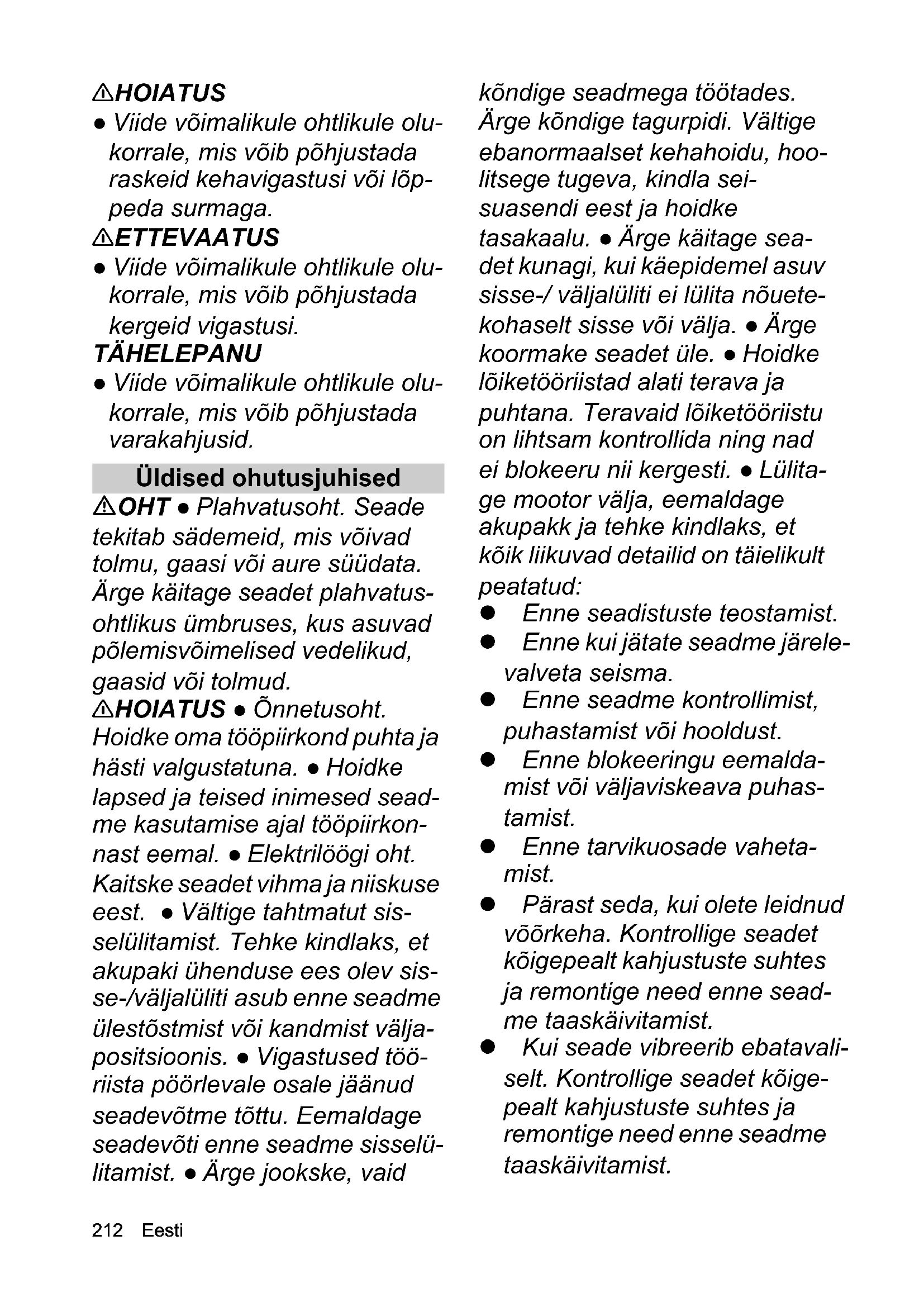 - EL vastavusdeklaratsioon 12 Eesti 몇 HOIATUS ● Viide võimalikule ohtlikule olu- korrale, mis võib põhjustada raskeid kehavigastusi või lõp- peda surmaga. 몇 ETTEVAATUS ● Viide võimalikule ohtlikule olu- korrale, mis võib põhjustada kergeid vigastusi. TÄHELEPANU ● Viide võimalikule ohtlikule olu- korrale, mis võib põhjustada varakahjusid. Üldised ohutusjuhised OHT ● Plahvatusoht. Seade tekitab sädemeid, mis võivad tolmu, gaasi või aure süüdata. Ärge käitage seadet plahvatus- ohtlikus ümbruses, kus asuvad põlemisvõimelised vedelikud, gaasid või tolmud. 몇 HOIATUS ● Õnnetusoht. Hoidke oma tööpiirkond puhta ja hästi valgustatuna. ● Hoidke lapsed ja teised inimesed sead- me kasutamise ajal tööpiirkon- nast eemal. ● Elektrilöögi oht. Kaitske seadet vihma ja niiskuse eest. ● Vältige tahtmatut sis- selülitamist. Tehke kindlaks, et akupaki ühenduse ees olev sis- se-/väljalüliti asub enne seadme ülestõstmist või kandmist välja- positsioonis. ● Vigastused töö- riista pöörlevale osale jäänud seadevõtme tõttu. Eemaldage seadevõti enne seadme sisselü- litamist. ● Ärge jookske, vaid kõndige seadmega töötades. Ärge kõndige tagurpidi. Vältige ebanormaalset kehahoidu, hoo- litsege tugeva, kindla sei- suasendi eest ja hoidke tasakaalu. ● Ärge käitage sea- det kunagi, kui käepidemel asuv sisse-/ väljalüliti ei lülita nõuete- kohaselt sisse või välja. ● Ärge koormake seadet üle. ● Hoidke lõiketööriistad alati terava ja puhtana. Teravaid lõiketööriistu on lihtsam kontrollida ning nad ei blokeeru nii kergesti. ● Lülita- ge mootor välja, eemaldage akupakk ja tehke kindlaks, et kõik liikuvad detailid on täielikult peatatud: Enne seadistuste teostamist. Enne kui jätate seadme järele- valveta seisma. Enne seadme kontrollimist, puhastamist või hooldust. Enne blokeeringu eemalda- mist või väljaviskeava puhas- tamist. Enne tarvikuosade vaheta- mist. Pärast seda, kui olete leidnud võõrkeha. Kontrollige seadet kõigepealt kahjustuste suhtes ja remontige need enne sead- me taaskäivitamist. Kui seade vibreerib ebatavali- selt. Kontrollige seadet kõige- pealt kahjustuste suhtes ja remontige need enne seadme taaskäivitamist.Eesti 213 몇 ETTEVAATUS ● Te ei tohi seadet käitada, kui olete ravimi- te või uimastite mõju all, mis pii- ravad reaktsioonivõimet. Käitage seadet ainult puhanud ja terves seisundis. ● Kandke seadmega töötamisel sobivat kaitsevarustust. Kaitsevarustus nagu tolmumaskid, libisemis- kindlad kingad, kaitsekiiver või kuulmiskaitsevahend vähenda- vad vigastusohtu. ● Kandke täielikku silma- ja kuulmiskaitse- vahendit. ● Kuulmiskaitseva- hend võib piirata Teie võimet kuulda hoiatushelisid, seetõttu pöörake tähelepanu võimalikele ohtudele läheduses ja tööpiir- konnas. ● Töötades piirkonda- des, kus esineb allakukkuvate esemete oht, kandke peakait- set.HOIATUS ● Kandke sead- mega töötamisel pikki raskeid pükse, pikkade varrukatega rii- deid ja libisemiskindlaid saa- paid. Ärge töötage paljajalu. Ärge kandke sandaale ega lühi- kesi pükse. Vältige lõdvalt istu- vat riietust või nööride ja paeltega riietust.ETTEVAATUS ● Vigastusoht, kui seadme liiku- ad osad haaravad kinni lõdvalt istuvast riietusest, juustest või ehetest. Hoidke riietus ja ehte masina liikuvatest osadest ee- mal. Siduge pikad juuksed kinni. ● Kasutage seadet ja selle tarvi- kuid ainult vastavalt käesoleva- tele korraldustele, võtke arvesse töötingimusi ja tehtavat tööd, et ohtlikke olukordi vältida. Ohutu käitamine OHT ● Rasked vigastused, kui lõikenuga paiskab esemeid üles või traat või nöör jääb lõike- tööriista kinni. Uurige tööala en- ne kasutamist põhjalikult esemete nagu kivide, pulkade, metalli, traadi, kontide või töö- riistade suhtes ning eemaldage need. 몇 HOIATUS ● Seade ei ole mõeldud kasutamiseks lastele või piiratud füüsiliste, sensoor- sete või vaimsete võimetega isi- kutele või antud korraldusi mittetundvatele isikutele. ● Ka- sutage seadet ainult päevaval- guse või hea kunstliku valgustuse korral. ● Ärge käita- ge seadet niiskel murul ega vih- ma käes. ● Pidage kinni minimaalsest vahekaugusest 15 m inimeste ja loomadeni. Peatage seade, kui keegi astub sellesse piirkonda. ● Hoidke lõi- keotsakut puusakõrgusest all- pool. ● Ärge kasutage seadet kunagi kahjustatud või paigalda- mata kaitseseadistega. ● Ärge kasutage kunagi metallist lõike- jõhve. ● Kasutage seadet ainult välispiirkonnas. ● Hoidke käed ja jalad lõiketööpinnast eemal, eelkõige mootori sisselülitami- sel. ● Vigastusoht, lõiketööriis- tad pöörlevad pärast mootori214 Eesti väljalülitamist veel edasi. ● Vi- gastusoht. Kaitsekattel olev nu- ga lõikejõhvi lühendamiseks on väga terav, vältige iga kokku- puudet, eelkõige puhastamisel. ● Tehke kindlaks, et õhutusavad on ladestistest vabad. ● Kontrol- lige seadet enne iga kasutamist ja pärast iga lööki kahjustuste suhtes. Kahjustatud osad, nt lü- liti, tuleb volitatud klienditeenin- dusel remontida või välja vahetada. ● Tehke kindlaks, et ajamipea pealis on nõuetekoha- selt monteeritud ja kinnitatud. ● Tehke kindlaks, et kõik kaitse- seadised, eemalesuunajad ja käepidemed on nõuetekohaselt ja kindlalt kinnitatud. ● Tehke enne iga kasutamist kindlaks, et jõhvilõikur on õigesti positsio- neeritud ja kindlustatud. ● Kasu- tage ainult tootja asendus- lõikejõhvi. Ärge kasutage ühtegi teist lõikeotsakut. ● Vigastusoht. Ärge tehke muudatusi seadmel. Märkus ● Mõningates piirkon- dades võivad eeskirjad piirata antud seadme kasutamist. Las- ke end nõustada oma kohalikul ametiasutusel. Ohutu hooldus ja jooksevremont 몇 HOIATUS ● Viige seade pä- rast uue jõhvi väljanihutamist kõigepealt normaalsesse käitus- positsiooni, enne kui seadme sisse lülitate. ● Tehke kindlaks, et seade on ohutus seisundis, kontrollides regulaarsete ajav