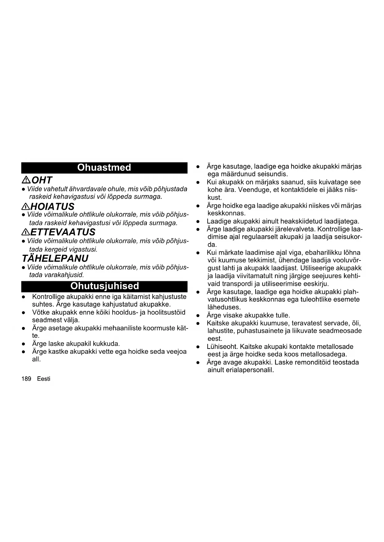 Battery Power + Battery Power + Battery Power + Battery Power + Тип акумулираща батерия Li-ION Li-ION Li-ION Li-ION Номинален капацитет (съгласно IEC/ EN 61960) Ah 2,5 5,0 2,5 5,0 Номинална енергия Wh 45 90 90 180 Макс. ток на зареждане A 3,5 7,5 3,5 7,5 Размери и тегла Тегло kg 0,5 0,8 0,9 1,5 Работна температура °C -20 - 40 -20 - 40 -20 - 40 -20 - 40 Температура на зареждане °C 4 - 40 4 - 40 4 - 40 4 - 40 Температура на съхранение °C -20 - 60 -20 - 60 -20 - 60 -20 - 60 Дължина x широчина x височина mm 133 x 88 x 50 133 x 88 x 72 133 x 88 x 72 133 x 88 x 117,5 18/25 18/50 36/25 36/50189 Eesti Ohuastmed OHT ● Viide vahetult ähvardavale ohule, mis võib põhjustada raskeid kehavigastusi või lõppeda surmaga. 몇 HOIATUS ● Viide võimalikule ohtlikule olukorrale, mis võib põhjus- tada raskeid kehavigastusi või lõppeda surmaga. 몇 ETTEVAATUS ● Viide võimalikule ohtlikule olukorrale, mis võib põhjus- tada kergeid vigastusi. TÄHELEPANU ● Viide võimalikule ohtlikule olukorrale, mis võib põhjus- tada varakahjusid. Ohutusjuhised ● Kontrollige akupakki enne iga käitamist kahjustuste suhtes. Ärge kasutage kahjustatud akupakke. ● Võtke akupakk enne kõiki hooldus- ja hoolitsustöid seadmest välja. ● Ärge asetage akupakki mehaaniliste koormuste kät- te. ● Ärge laske akupakil kukkuda. ● Ärge kastke akupakki vette ega hoidke seda veejoa all. ● Ärge kasutage, laadige ega hoidke akupakki märjas ega määrdunud seisundis. ● Kui akupakk on märjaks saanud, siis kuivatage see kohe ära. Veenduge, et kontaktidele ei jääks niis- kust. ● Ärge hoidke ega laadige akupakki niiskes või märjas keskkonnas. ● Laadige akupakki ainult heakskiidetud laadijatega. ● Ärge laadige akupakki järelevalveta. Kontrollige laa- dimise ajal regulaarselt akupaki ja laadija seisukor- da. ● Kui märkate laadimise ajal viga, ebaharilikku lõhna või kuumuse tekkimist, ühendage laadija vooluvõr- gust lahti ja akupakk laadijast. Utiliseerige akupakk ja laadija viivitamatult ning järgige seejuures kehti- vaid transpordi ja utiliseerimise eeskirju. ● Ärge kasutage, laadige ega hoidke akupakki plah- vatusohtlikus keskkonnas ega tuleohtlike esemete läheduses. ● Ärge visake akupakke tulle. ● Kaitske akupakki kuumuse, teravatest servade, õli, lahustite, puhastusainete ja liikuvate seadmeosade eest. ● Lühiseoht. Kaitske akupaki kontakte metallosade eest ja ärge hoidke seda koos metallosadega. ● Ärge avage akupakki. Laske remonditöid teostada ainult erialapersonalil.Eesti 190 ● Vältige kokkupuudet defektsetest akudest väljatun- giva vedelikuga. Kokkupuute korral loputage vedelik kohe veega maha ja silmadega kokkupuute korral konsulteerige lisaks arstiga. ● Utiliseerige akupakk pärast selle kasutusea lõppe- mist vastavalt kehtivatele eeskirjadele. Ohutusjuhised transportimiseks Liitiumioonaku suhtes kehtivad ohtlike kaupade seadu- se nõuded. Kasutaja võib kahjustamata ja talitlusvõimelist akupakki transportida avalikus liiklusruumis lisapiiranguteta. Saatmiseks kolmandaid isikuid (transpordiettevõtteid) kasutades järgige eelkõige pakendamise ja tähistamise erinõudeid. Transportige akupakki üksnes juhul, kui korpus on kah- justamata. Kleepige avatud kontaktid kinni. Pakendage aku tugevalt ja kindlalt. Akupakk ei tohi pa- kendis liikuda. OHT ● Defektset või mittetalitlusvõimelist akupakki ei tohi saata ja see tuleb utiliseerida kohapeal vastavalt keh- tivatele eeskirjadele. Järgige riiklikke eeskirju. Nõuetekohane kasutamine 몇 ETTEVAATUS Plahvatusoht! Vigastused ja kahjustused plahvatava akupaki tõttu. Laadige, kasutage ja hoidke ainult kahjustamata ja täie- likult talitlusvõimelisi akupakke. Ümberehitused ja tootja poolt volitamata muudatused on keelatud. Iga muu kasutamine on lubamatu. Lubamatu kasutami- se tõttu tekkivate ohtude eest vastutab kasutaja. Laadige ja kasutage akupakke ainult KÄRCHER 18 V / 36 V Battery Power / Battery Power+ Systemsi seadme- tega. TÄHELEPANU Akupakke saab kasutada ainult sama pingetüübiga (18 V või 36 V) seadmetega! Ärge kasutage ega laadi- ge akupakke koos muu pingetüübiga seadmetega. Kontrollige enne kasutamist akupaki ja seadme pinge- tüübi (18 V /36 V) kokkulangevust. Teavet pinge kohta leiate seadmelt, akupakilt ja nende tüübisiltidelt. Keskkonnakaitse Pakkematerjalid on taaskasutatavad. Palun ärge visake pakendeid olmeprügi hulka, vaid juhtige need taaskasutusse.191 Eesti Elektroonikaromud sisaldavad väärtuslikke taas- kasutatavaid materjale, mis tuleks ringlusse võt- ta. Akud ja akupakid sisaldavad aineid, mis ei tohi sattuda keskkonda. Palun utiliseerige elektrooni- karomud, akud ja akupakid sobivate kogumissüsteemi- de kaudu. Järgige seadusandja soovitusi liitium-ioon-akudega ümberkäimisel. Utiliseerige äratarvitatud ja defektsed akupakid vastavalt kehtivatele eeskirjadele. Juhised koostisainete kohta (REACH) Aktuaalse info koostisainete kohta leiate aadressilt: www.kaercher.de/REACH Garantii Igas riigis kehtivad meie volitatud müügiesindaja antud garantiitingimused. Seadmel esinevad mistahes rikked kõrvaldame garantiiajal tasuta, kui põhjuseks on mater- jali- või tootmisviga. Garantiijuhtumil pöörduge ostu tõendava dokumendiga oma edasimüüja või lähima vo- litatud klienditeeninduse poole. Need leiate veebilehelt www.kaercher.com Seadmel olevad sümbolid Jooniseid vt graafika leheküljelt Käsitsemine Displei Akupakk on varustatud displeiga. Displeilt saab lugeda järgmist: ● laadimisseisund ● jääktööaeg ● Ülejäänud laadimisaeg ● Veateated Märkus Tööaja kohandamine tekitatakse võimsuse ümberlülita- mise kaudu! Joonis 1 Ärge kastke akupakki vette. Joonis 2 Ärge visake akupakki tulle. Joonis 3 Laadige akupakki ainult laadimiseks heaks- kiidetud laa