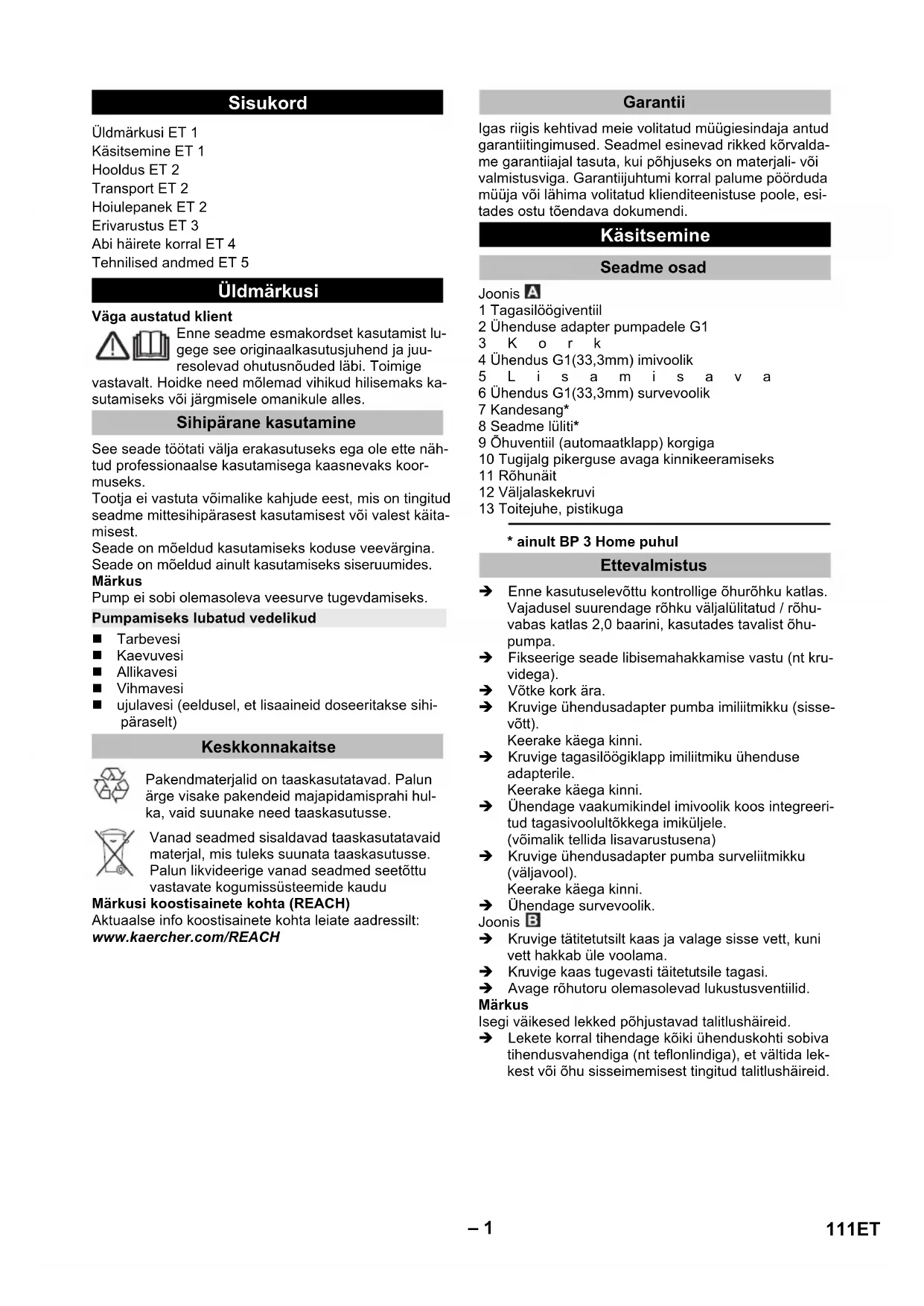 BP 3 Home - Pump Kärcher - Tasuta kasutusjuhend