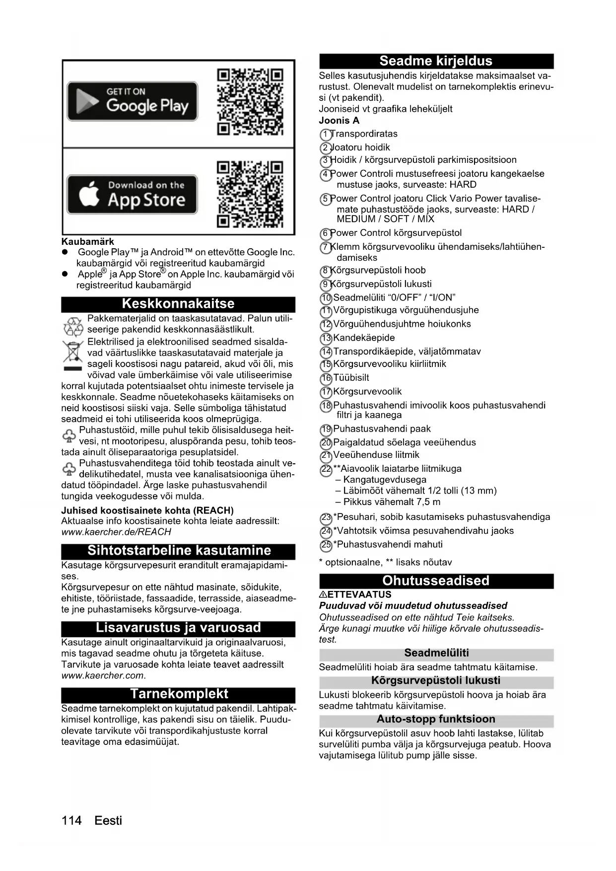 on Apple Inc. kaubamärgid või registreeritud kaubamärgid Keskkonnakaitse Pakkematerjalid on taaskasutatavad. Palun utili- seerige pakendid keskkonnasäästlikult. Elektrilised ja elektroonilised seadmed sisalda- vad väärtuslikke taaskasutatavaid materjale ja sageli koostisosi nagu patareid, akud või õli, mis võivad vale ümberkäimise või vale utiliseerimise korral kujutada potentsiaalset ohtu inimeste tervisele ja keskkonnale. Seadme nõuetekohaseks käitamiseks on neid koostisosi siiski vaja. Selle sümboliga tähistatud seadmeid ei tohi utiliseerida koos olmeprügiga. Puhastustöid, mille puhul tekib õlisisaldusega heit- vesi, nt mootoripesu, aluspõranda pesu, tohib teos- tada ainult õliseparaatoriga pesuplatsidel. Puhastusvahenditega töid tohib teostada ainult ve- delikutihedatel, musta vee kanalisatsiooniga ühen- datud tööpindadel. Ärge laske puhastusvahendil tungida veekogudesse või mulda. Juhised koostisainete kohta (REACH) Aktuaalse info koostisainete kohta leiate aadressilt: www.kaercher.de/REACH Sihtotstarbeline kasutamine Kasutage kõrgsurvepesurit eranditult eramajapidami- ses. Kõrgsurvepesur on ette nähtud masinate, sõidukite, ehitiste, tööriistade, fassaadide, terrasside, aiaseadme- te jne puhastamiseks kõrgsurve-veejoaga. Lisavarustus ja varuosad Kasutage ainult originaaltarvikuid ja originaalvaruosi, mis tagavad seadme ohutu ja tõrgeteta käituse. Tarvikute ja varuosade kohta leiate teavet aadressilt www.kaercher.com. Tarnekomplekt Seadme tarnekomplekt on kujutatud pakendil. Lahtipak- kimisel kontrollige, kas pakendi sisu on täielik. Puudu- olevate tarvikute või transpordikahjustuste korral teavitage oma edasimüüjat. Seadme kirjeldus Selles kasutusjuhendis kirjeldatakse maksimaalset va- rustust. Olenevalt mudelist on tarnekomplektis erinevu- si (vt pakendit). Jooniseid vt graafika leheküljelt Joonis A 1 Transpordiratas 2 Joatoru hoidik 3 Hoidik / kõrgsurvepüstoli parkimispositsioon 4 Power Controli mustusefreesi joatoru kangekaelse mustuse jaoks, surveaste: HARD 5 Power Control joatoru Click Vario Power tavalise- mate puhastustööde jaoks, surveaste: HARD /