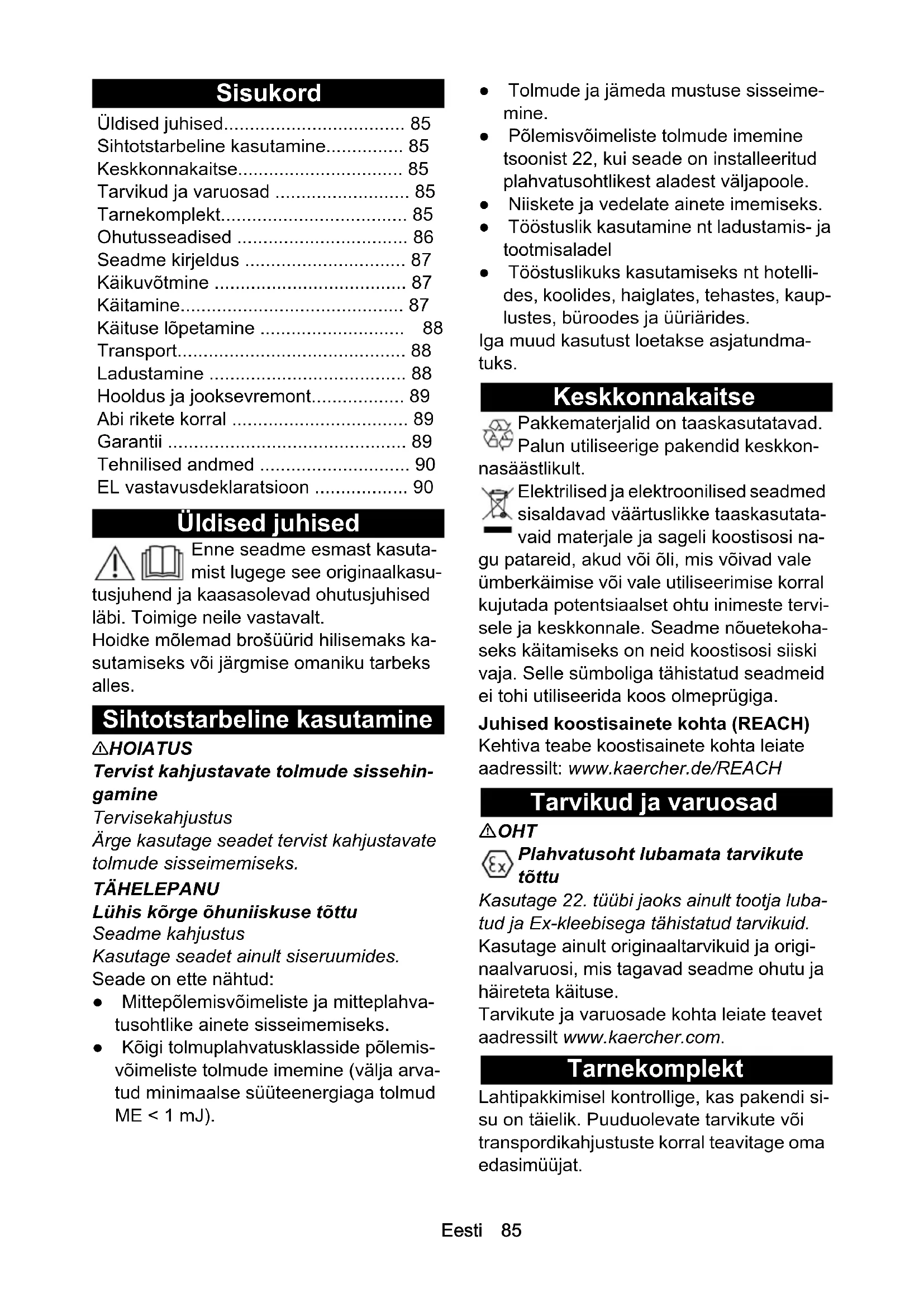 • 3 x 1,5 Delnummer (EU) 9.988-393.0 Kabellængde m 10 IVR 100/24-2 ScEesti 85 Sisukord Üldised juhised Enne seadme esmast kasuta- mist lugege see originaalkasu- tusjuhend ja kaasasolevad ohutusjuhised läbi. Toimige neile vastavalt. Hoidke mõlemad brošüürid hilisemaks ka- sutamiseks või järgmise omaniku tarbeks alles. Sihtotstarbeline kasutamine 몇 HOIATUS Tervist kahjustavate tolmude sissehin- gamine Tervisekahjustus Ärge kasutage seadet tervist kahjustavate tolmude sisseimemiseks. TÄHELEPANU Lühis kõrge õhuniiskuse tõttu Seadme kahjustus Kasutage seadet ainult siseruumides. Seade on ette nähtud: ● Mittepõlemisvõimeliste ja mitteplahva- tusohtlike ainete sisseimemiseks. ● Kõigi tolmuplahvatusklasside põlemis- võimeliste tolmude imemine (välja arva- tud minimaalse süüteenergiaga tolmud ME < 1 mJ). ● Tolmude ja jämeda mustuse sisseime- mine. ● Põlemisvõimeliste tolmude imemine tsoonist 22, kui seade on installeeritud plahvatusohtlikest aladest väljapoole. ● Niiskete ja vedelate ainete imemiseks. ● Tööstuslik kasutamine nt ladustamis- ja tootmisaladel ● Tööstuslikuks kasutamiseks nt hotelli- des, koolides, haiglates, tehastes, kaup- lustes, büroodes ja üüriärides. Iga muud kasutust loetakse asjatundma- tuks. Keskkonnakaitse Pakkematerjalid on taaskasutatavad. Palun utiliseerige pakendid keskkon- nasäästlikult. Elektrilised ja elektroonilised seadmed sisaldavad väärtuslikke taaskasutata- vaid materjale ja sageli koostisosi na- gu patareid, akud või õli, mis võivad vale ümberkäimise või vale utiliseerimise korral kujutada potentsiaalset ohtu inimeste tervi- sele ja keskkonnale. Seadme nõuetekoha- seks käitamiseks on neid koostisosi siiski vaja. Selle sümboliga tähistatud seadmeid ei tohi utiliseerida koos olmeprügiga. Juhised koostisainete kohta (REACH) Kehtiva teabe koostisainete kohta leiate aadressilt: www.kaercher.de/REACH Tarvikud ja varuosad OHT Plahvatusoht lubamata tarvikute tõttu Kasutage 22. tüübi jaoks ainult tootja luba- tud ja Ex-kleebisega tähistatud tarvikuid. Kasutage ainult originaaltarvikuid ja origi- naalvaruosi, mis tagavad seadme ohutu ja häireteta käituse. Tarvikute ja varuosade kohta leiate teavet aadressilt www.kaercher.com. Tarnekomplekt Lahtipakkimisel kontrollige, kas pakendi si- su on täielik. Puuduolevate tarvikute või transpordikahjustuste korral teavitage oma edasimüüjat. Üldised juhised p. 85
