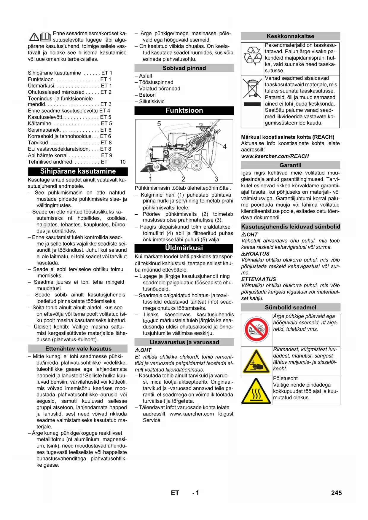 0,2 0,2 244 BG- 1 Enne sesadme esmakordset ka- sutuselevõttu lugege läbi algu- pärane kasutusjuhend, toimige sellele vas- tavalt ja hoidke see hilisema kasutamise või uue omaniku tarbeks alles. Kasutage antud seadet ainult vastavalt ka- sutusjuhendi andmetele. – See pühkimismasin on ette nähtud mustade pindade pühkimiseks sise- ja välitingimustes. – Seade on ette nähtud tööstuslikuks ka- sutamiseks nt hotellides, koolides, haiglates, tehastes, kauplustes, büroo- des ja üüriärides. – Enne kasutamist tuleb kontrollida sead- me ja selle tööks vajalikke seadiste sei- sundit ja töökindlust. Juhul kui seisund ei ole laitmatu, ei tohi seadet või tarvikut kasutada. – Seade ei sobi terviseloe ohtliku tolmu imemiseks. – Seadme juures ei tohi teha mingeid muudatusi. – Seade sobib ainult kasutusjuhendis loetletud pinnakatete töötlemiseks. – Sõita tohib ainult ainult aladel, kus see on ettevõtja või tema poolt volitatud isi- ku poolt masina kasutamiseks lubatud. – Üldiselt kehtib: Vältige masina sattu- mist kergestisüttivate materjalide lähe- dusse (plahvatus-/tuleoht). – Mitte kunagi ei tohi seadmesse pühki- da/imeda plahvatusohtlikke vedelikke, tuleohtlikke gaase ega lahjendamata happeid ja lahusteid! Selliste hulka kuu- luvad bensiin, värvilahustid või kütteõli, mis võivad imemisõhu keerises moo- dustada plahvatusohtlikke aurusid või segusid, samuti kuuluvad sellesse gruppi atsetoon, lahjendamata happed ja lahustid, sest need võivad rikkuda seadme valmistamiseks kasutatud ma- terjale. – Ärge kunagi pühkige/koguge reaktiivset metallitolmu (nt alumiinium, magneesi- um, tsink), need moodustavad ühendu- ses tugevasti leeliseliste või happeliste puhastusvahenditega plahvatusohtlik- ke gaase. – Ärge pühkige/imege masinasse põle- vaid ega hõõguvaid esemeid. – On keelatud viibida ohualas. On keela- tud kasutada seadet ruumides, kus võib esineda plahvatusohtu. – Asfalt – Tööstuspinnad – Valatud põrandad – Betoon – Sillutiskivid Pühkimismasin töötab üleheitepõhimõttel. – Külgmine hari (1) puhastab pühitava pinna nurki ja servi ning toimetab prahi pühkimisvaltsi teele. – Pöörlev pühkimisvalts (2) toimetab mustuses otse prahimahutisse (3). – Paagis ülepaiskunud tolm eraldatakse tolmufiltri (4) abil ja filtreeritud puhas õnk imetakse läbi puhuri (5) välja. Kui märkate toodet lahti pakkides transpor- dil tekkinud kahjustusi, teatage sellest kau- ba müünud ettevõttele. – Lugege ja järgige kasutusjuhendit ning seadmele paigaldatud tööseadiste ohu- tusnõudeid. – Seadmele paigaldatud hoiatus- ja teavi- tussildid edastavad tähtsat infot sead- mega ohutuks töötamiseks. – Lisaks käesolevas kasutusjuhendis tood ud märkustele tuleb järgida ka sea- dusandja üldisi ohutusalaseid ja õnne- tusjuhtumite vältimise eeskirju. OHT Et vältida ohtlikke olukordi, tohib remont- töid ja varuosade paigaldamist teostada ai- nult volitatud klienditeenindus. – Kasutada tohib ainult tarvikuid ja varuo- si, mida tootja aktsepteerib. Originaal- tarvikud ja -varuosad annavad teile ga- rantii, et seadmega on võimalik töötada turvaliselt ja tõrgeteta. – Täiendavat infot varuosade kohta leiate aadressilt www.kaercher.com lõigust Service. Märkusi koostisainete kohta (REACH) Aktuaalse info koostisainete kohta leiate aadressilt: www.kaercher.com/REACH Igas riigis kehtivad meie volitatud müü- giesindaja antud garantiitingimused. Tarvi- kutel esinevad rikked kõrvaldame garantii- ajal tasuta, kui põhjuseks on materjali- või valmistusviga. Garantiijuhtumi korral palu- me pöörduda müüja või lähima volitatud klienditeenistuse poole, esitades ostu tõen- dava dokumendi. OHT Vahetult ähvardava ohu puhul, mis toob kaasa raskeid kehavigastusi või surma. 몇 HOIATUS Võimaliku ohtliku olukorra puhul, mis võib põhjustada raskeid kehavigastusi või sur- ma. ETTEVAATUS Võimaliku ohtliku olukorra puhul, mis võib põhjustada kergeid vigastusi või materiaal- set kahju. Sihipärane kasutamine . . . . . . ET 1 Funktsioon. . . . . . . . . . . . . . . . ET 1 Üldmärkusi. . . . . . . . . . . . . . . . ET 1 Ohutusalased märkused . . . . . ET 2 Teenindus- ja funktsiooniele- mendid. . . . . . . . . . . . . . . . . . . ET 3 Enne seadme kasutuselevõttu ET 4 Kasutuselevõtt. . . . . . . . . . . . . ET 5 Käitamine. . . . . . . . . . . . . . . . . ET 5 Seismapanek. . . . . . . . . . . . . . ET 6 Korrashoid ja tehnohooldus. . . ET 6 Tarvikud. . . . . . . . . . . . . . . . . . ET 8 ELi vastavusdeklaratsioon. . . . ET 8 Abi häirete korral . . . . . . . . . . . ET 9 Tehnilised andmed . . . . . . . . . ET 10 Sihipärane kasutamine Ettenähtav vale kasutus Sobivad pinnad Funktsioon Üldmärkusi Lisavarustus ja varuosad Keskkonnakaitse Pakendmaterjalid on taaskasu- tatavad. Palun ärge visake pa- kendeid majapidamisprahi hul- ka, vaid suunake need taaska- sutusse. Vanad seadmed sisaldavad taaskasutatavaid materjale, mis tuleks suunata taaskasutusse. Patareid, õli ja muud sarnased ained ei tohi jõuda keskkonda. Seetõttu palume vanad sead- med likvideerida vastavate ko- gumissüsteemide kaudu. Garantii Kasutusjuhendis leiduvad sümbolid Sümbolid seadmel Ärge pühkige põlevaid ega hõõguvaid esemeid, nt siga- retid, tuletikud vms. Rihmadest, külgmistest luu- dadest, mahutist, sangast lähtuv muljumis- ja sisselõi- keoht. Põletusoht Vältige nende pindadega kokkupuudet töö ajal ja kuu- mutatud olekus. 245ET- 2 – Enne kasutamist tuleb kontrollida sead- me ja selle tööks vajalikke seadiste sei- sundit ja töökindlust. Juhul kui seisund ei ole laitmatu, ei tohi seadet või tarvikut kasutada. – Seadme kasutamisel ohtlikes piirkon- dades (nt tanklates) tuleb järgida asja- kohaseid ohutuseeskirju. On keelatud kasutada seadet ruumides, kus võib esineda plahvatusohtu. – Käitaja peab seadet kasutama sihipära- selt. Arvestama peab kohapeal valitse- vate oludega ning töötamisel seadme- ga tuleb silmas pidada 