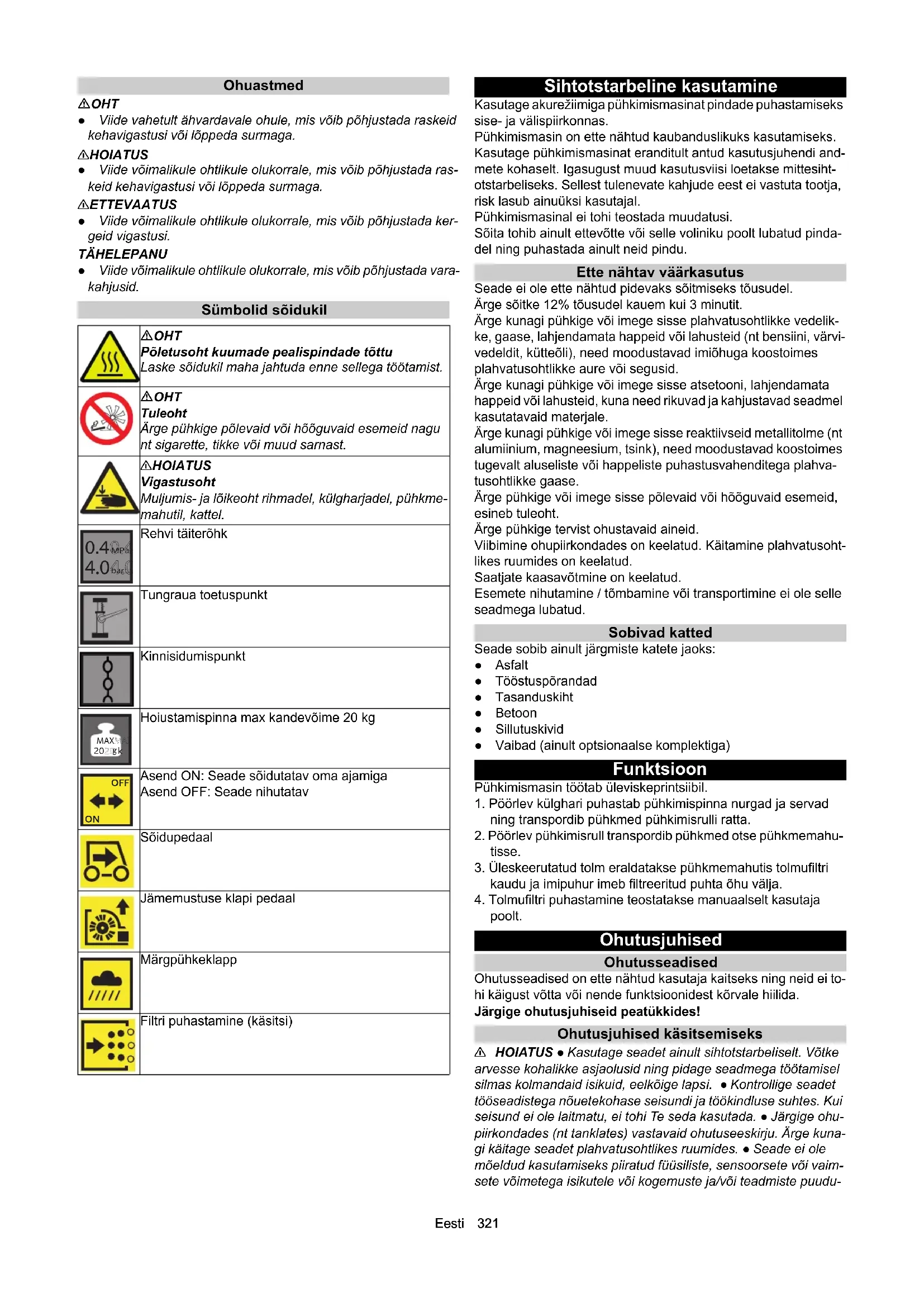 poolt. Ohutusjuhised Ohutusseadised Ohutusseadised on ette nähtud kasutaja kaitseks ning neid ei to- hi käigust võtta või nende funktsioonidest kõrvale hiilida. Järgige ohutusjuhiseid peatükkides! Ohutusjuhised käsitsemiseks 몇 HOIATUS ● Kasutage seadet ainult sihtotstarbeliselt. Võtke arvesse kohalikke asjaolusid ning pidage seadmega töötamisel silmas kolmandaid isikuid, eelkõige lapsi. ● Kontrollige seadet tööseadistega nõuetekohase seisundi ja töökindluse suhtes. Kui seisund ei ole laitmatu, ei tohi Te seda kasutada. ● Järgige ohu- piirkondades (nt tanklates) vastavaid ohutuseeskirju. Ärge kuna- gi käitage seadet plahvatusohtlikes ruumides. ● Seade ei ole mõeldud kasutamiseks piiratud füüsiliste, sensoorsete või vaim- sete võimetega isikutele või kogemuste ja/või teadmiste puudu- OHT Põletusoht kuumade pealispindade tõttu Laske sõidukil maha jahtuda enne sellega töötamist. OHT Tuleoht Ärge pühkige põlevaid või hõõguvaid esemeid nagu nt sigarette, tikke või muud sarnast. 몇 HOIATUS Vigastusoht Muljumis- ja lõikeoht rihmadel, külgharjadel, pühkme- mahutil, kattel. Rehvi täiterõhk Tungraua toetuspunkt Kinnisidumispunkt Hoiustamispinna max kandevõime 20 kg Asend ON: Seade sõidutatav oma ajamiga Asend OFF: Seade nihutatav Sõidupedaal Jämemustuse klapi pedaal Märgpühkeklapp Filtri puhastamine (käsitsi)