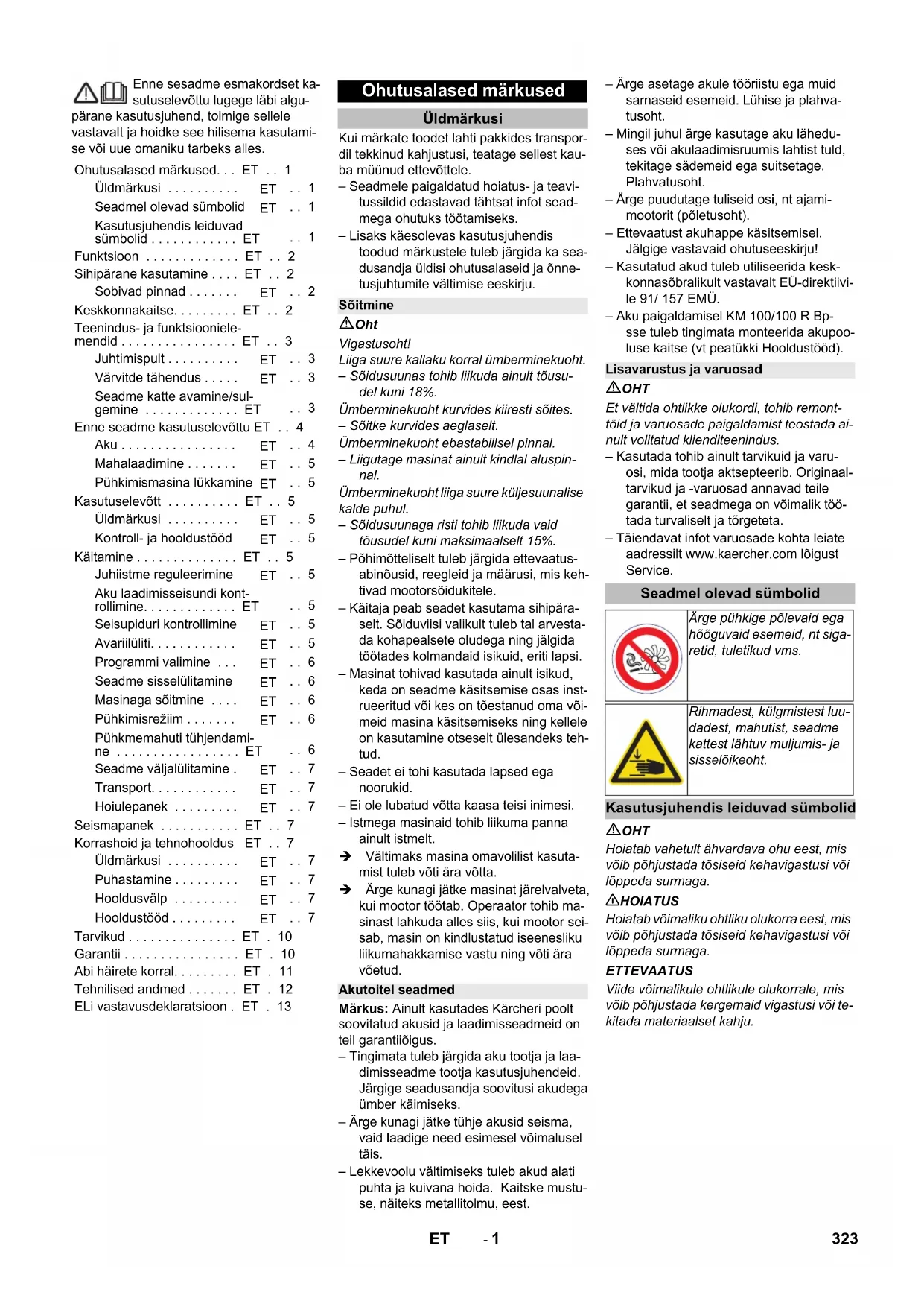 Chairman of the Board of Management Director Regulatory Affairs & Certification 322 BG- 1 Enne sesadme esmakordset ka- sutuselevõttu lugege läbi algu- pärane kasutusjuhend, toimige sellele vastavalt ja hoidke see hilisema kasutami- se või uue omaniku tarbeks alles. Kui märkate toodet lahti pakkides transpor- dil tekkinud kahjustusi, teatage sellest kau- ba müünud ettevõttele. – Seadmele paigaldatud hoiatus- ja teavi- tussildid edastavad tähtsat infot sead- mega ohutuks töötamiseks. – Lisaks käesolevas kasutusjuhendis toodud märkustele tuleb järgida ka sea- dusandja üldisi ohutusalaseid ja õnne- tusjuhtumite vältimise eeskirju. Oht Vigastusoht! Liiga suure kallaku korral ümberminekuoht. – Sõidusuunas tohib liikuda ainult tõusu- del kuni 18%. Ümberminekuoht kurvides kiiresti sõites. – Sõitke kurvides aeglaselt. Ümberminekuoht ebastabiilsel pinnal. – Liigutage masinat ainult kindlal aluspin- nal. Ümberminekuoht liiga suure küljesuunalise kalde puhul. – Sõidusuunaga risti tohib liikuda vaid tõusudel kuni maksimaalselt 15%. – Põhimõtteliselt tuleb järgida ettevaatus- abinõusid, reegleid ja määrusi, mis keh- tivad mootorsõidukitele. – Käitaja peab seadet kasutama sihipära- selt. Sõiduviisi valikult tuleb tal arvesta- da kohapealsete oludega ning jälgida töötades kolmandaid isikuid, eriti lapsi. – Masinat tohivad kasutada ainult isikud, keda on seadme käsitsemise osas inst- rueeritud või kes on tõestanud oma või- meid masina käsitsemiseks ning kellele on kasutamine otseselt ülesandeks teh- tud. – Seadet ei tohi kasutada lapsed ega noorukid. – Ei ole lubatud võtta kaasa teisi inimesi. – Istmega masinaid tohib liikuma panna ainult istmelt. Vältimaks masina omavolilist kasuta- mist tuleb võti ära võtta. Ärge kunagi jätke masinat järelvalveta, kui mootor töötab. Operaator tohib ma- sinast lahkuda alles siis, kui mootor sei- sab, masin on kindlustatud iseenesliku liikumahakkamise vastu ning võti ära võetud. Märkus: Ainult kasutades Kärcheri poolt soovitatud akusid ja laadimisseadmeid on teil garantiiõigus. – Tingimata tuleb järgida aku tootja ja laa- dimisseadme tootja kasutusjuhendeid. Järgige seadusandja soovitusi akudega ümber käimiseks. – Ärge kunagi jätke tühje akusid seisma, vaid laadige need esimesel võimalusel täis. – Lekkevoolu vältimiseks tuleb akud alati puhta ja kuivana hoida. Kaitske mustu- se, näiteks metallitolmu, eest. – Ärge asetage akule tööriistu ega muid sarnaseid esemeid. Lühise ja plahva- tusoht. – Mingil juhul ärge kasutage aku lähedu- ses või akulaadimisruumis lahtist tuld, tekitage sädemeid ega suitsetage. Plahvatusoht. – Ärge puudutage tuliseid osi, nt ajami- mootorit (põletusoht). – Ettevaatust akuhappe käsitsemisel. Jälgige vastavaid ohutuseeskirju! – Kasutatud akud tuleb utiliseerida kesk- konnasõbralikult vastavalt EÜ-direktiivi- le 91/ 157 EMÜ. – Aku paigaldamisel KM 100/100 R Bp- sse tuleb tingimata monteerida akupoo- luse kaitse (vt peatükki Hooldustööd). OHT Et vältida ohtlikke olukordi, tohib remont- töid ja varuosade paigaldamist teostada ai- nult volitatud klienditeenindus. – Kasutada tohib ainult tarvikuid ja varu- osi, mida tootja aktsepteerib. Originaal- tarvikud ja -varuosad annavad teile garantii, et seadmega on võimalik töö- tada turvaliselt ja tõrgeteta. – Täiendavat infot varuosade kohta leiate aadressilt www.kaercher.com lõigust Service. OHT Hoiatab vahetult ähvardava ohu eest, mis võib põhjustada tõsiseid kehavigastusi või lõppeda surmaga. 몇 HOIATUS Hoiatab võimaliku ohtliku olukorra eest, mis võib põhjustada tõsiseid kehavigastusi või lõppeda surmaga. ETTEVAATUS Viide võimalikule ohtlikule olukorrale, mis võib põhjustada kergemaid vigastusi või te- kitada materiaalset kahju. Ohutusalased märkused. . . ET . . 1 Üldmärkusi . . . . . . . . . .