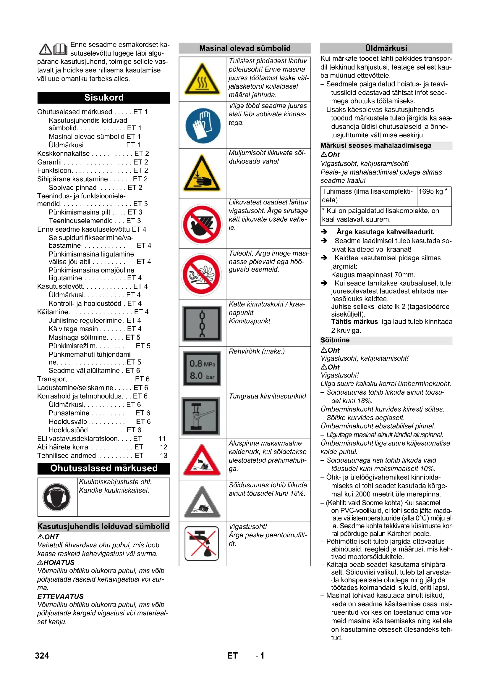 - Kui on paigaldatud lisakomplekte, on kaal vastavalt suurem. Sõitmine 324 ET- 2 – Seadet ei tohi kasutada lapsed ega noorukid. – Ei ole lubatud võtta kaasa teisi inimesi. – Istmega masinaid tohib liikuma panna ainult istmelt. Vältimaks masina omavolilist kasuta- mist tuleb süütevõti ära võtta. Ärge kunagi jätke masinat järelvalveta, kui mootor töötab. Operaator tohib ma- sinast lahkuda alles siis, kui mootor sei- sab, masin on kindlustatud iseenesliku liikumahakkamise vastu, vajadusel peale tõmmatud seisupidur ning süüte- võti ära võetud. Oht Vigastusoht! – Heitgaaside äratõmmet ei tohi sulgeda. – Ärge kummarduge heitgaaside ava koha- le ega sirutage sinna kätt (põletusoht). – Ärge puudutage ajamimootorit (põle- tusoht). – Heitgaasid on mürgised ja tervisele kahjulikud, neid ei tohi sisse hingata. – Mootor töötab pärast väljalülitamist inertsist veel ca. 3 - 4 sekundit. Sel ajal tuleb ajami piirkonnast tingimata eema- le hoida. – Avarii korral purustage klaasid avarii- haamriga. MÄRKUS Avariihaamer on jalaruumis juhiistme all. – Kasutada tohib ainult tarvikuid ja varu- osi, mida tootja aktsepteerib. Originaal- tarvikud ja -varuosad annavad teile ga- rantii, et seadmega on võimalik töötada turvaliselt ja tõrgeteta. – Täiendavat infot varuosade kohta leiate aadressilt www.kaercher.com lõigust Service. Märkusi koostisainete kohta (REACH) Aktuaalse info koostisainete kohta leiate aadressilt: www.kaercher.com/REACH Igas riigis kehtivad meie volitatud müü- giesindaja antud garantiitingimused. Sead- mel esinevad rikked kõrvaldame garan- tiiajal tasuta, kui põhjuseks on materjali- või valmistusviga. Garantiijuhtumi korral palu- me pöörduda müüja või lähima volitatud klienditeenistuse poole, esitades ostu tõen- dava dokumendi. Pühkimismasin töötab pühkimiskühvli põhi- mõttel. – Pöörlev pühkimisvalts toimetab mustu- se otse prahimahutisse. – Külgmine hari puhastab pühitava pinna nurki ja servi ning lükkab prahi pühki- misvaltsi teele. – Peentolm tõmmatakse üle tolmufiltri ja läbi puhuri. Kasutage seda pühkimismasinat ainult vastavalt kasutusjuhendi andmetele. Enne kasutamist tuleb kontrollida sead- me ja selle tööks vajalikke seadiste sei- sundit ja töökindlust. Juhul kui seisund ei ole laitmatu, ei tohi seadet või tarvikut kasutada. – See pühkimismasin on ette nähtud musta- de pindade pühkimiseks välitingimustes. – Seadet ei tohi kasutada suletud ruumides. – Istmega seadmeid, millel puudub sobiv varustus (tehasepoolne variant), ei ole lubatud kasutada avalikel teedel. – Avalikel teedel tohib seadet kasutada alles pärast iga üksiku seadme eelne- vat ülevaatust ARKi tehnoülevaatus- punktis. – Kõiki seadme kaasi tohib avada ainult vee eest kaitstud aladel. – Seade ei sobi terviseloe ohtliku tolmu imemiseks. – Seadme juures ei tohi teha mingeid muudatusi. – Mitte kunagi ei tohi seadmesse pühki- da/imeda plahvatusohtlikke vedelikke, tuleohtlikke gaase ega lahjendamata happeid ja lahusteid! Selliste hulka kuu- luvad bensiin, värvilahustid või kütteõli, mis võivad imemisõhu keerises moo- dustada plahvatusohtlikke aurusid või segusid, samuti kuuluvad sellesse gruppi atsetoon, lahjendamata happed ja lahustid, sest need võivad rikkuda seadme valmistamiseks kasutatud ma- terjale.