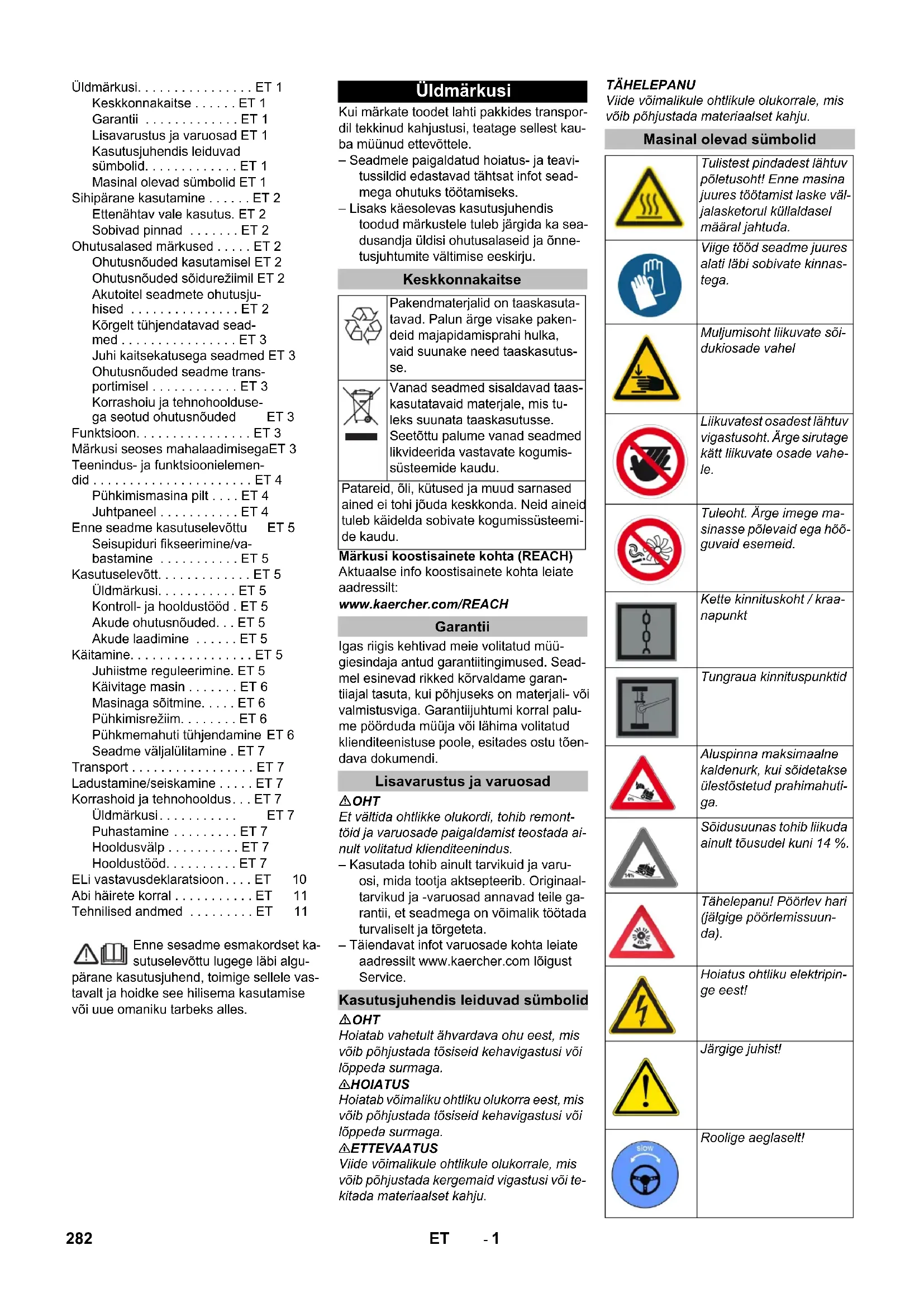0,1 0,1 Мерки и тегла Дължина x широчина x височина mm 2082x1250x1450 2082x1250x1450 Радиус на обръщане надясно mm 1350 1350 Радиус на обръщане наляво mm 1350 1350 Тегло без товар (с/без акумулатор) kg 750/1200 750/1200 Допустимо общо тегло kg 1620 1620 Допустимо натоварване на осите отпред kg 797 797 Допустимо натоварване на осите отзад kg 823 823 Запазваме си правото на технически изменения! 281BG- 1 Enne sesadme esmakordset ka- sutuselevõttu lugege läbi algu- pärane kasutusjuhend, toimige sellele vas- tavalt ja hoidke see hilisema kasutamise või uue omaniku tarbeks alles. Kui märkate toodet lahti pakkides transpor- dil tekkinud kahjustusi, teatage sellest kau- ba müünud ettevõttele. – Seadmele paigaldatud hoiatus- ja teavi- tussildid edastavad tähtsat infot sead- mega ohutuks töötamiseks. – Lisaks käesolevas kasutusjuhendis toodud märkustele tuleb järgida ka sea- dusandja üldisi ohutusalaseid ja õnne- tusjuhtumite vältimise eeskirju. Märkusi koostisainete kohta (REACH) Aktuaalse info koostisainete kohta leiate aadressilt: www.kaercher.com/REACH Igas riigis kehtivad meie volitatud müü- giesindaja antud garantiitingimused. Sead- mel esinevad rikked kõrvaldame garan- tiiajal tasuta, kui põhjuseks on materjali- või valmistusviga. Garantiijuhtumi korral palu- me pöörduda müüja või lähima volitatud klienditeenistuse poole, esitades ostu tõen- dava dokumendi. OHT Et vältida ohtlikke olukordi, tohib remont- töid ja varuosade paigaldamist teostada ai- nult volitatud klienditeenindus. – Kasutada tohib ainult tarvikuid ja varu- osi, mida tootja aktsepteerib. Originaal- tarvikud ja -varuosad annavad teile ga- rantii, et seadmega on võimalik töötada turvaliselt ja tõrgeteta. – Täiendavat infot varuosade kohta leiate aadressilt www.kaercher.com lõigust Service. OHT Hoiatab vahetult ähvardava ohu eest, mis võib põhjustada tõsiseid kehavigastusi või lõppeda surmaga. 몇 HOIATUS Hoiatab võimaliku ohtliku olukorra eest, mis võib põhjustada tõsiseid kehavigastusi või lõppeda surmaga. 몇 ETTEVAATUS Viide võimalikule ohtlikule olukorrale, mis võib põhjustada kergemaid vigastusi või te- kitada materiaalset kahju. TÄHELEPANU Viide võimalikule ohtlikule olukorrale, mis võib põhjustada materiaalset kahju. Üldmärkusi. . . . . . . . . . . . . . . . ET 1 Keskkonnakaitse . . . . . . ET 1 Garantii . . . . . . . . . . . . . ET 1 Lisavarustus ja varuosad ET 1 Kasutusjuhendis leiduvad sümbolid. . . . . . . . . . . . . ET 1 Masinal olevad sümbolid ET 1 Sihipärane kasutamine . . . . . . ET 2 Ettenähtav vale kasutus. ET 2 Sobivad pinnad . . . . . . . ET 2 Ohutusalased märkused . . . . . ET 2 Ohutusnõuded kasutamisel ET 2 Ohutusnõuded sõidurežiimil ET 2 Akutoitel seadmete ohutusju- hised . . . . . . . . . . . . . . . ET 2 Kõrgelt tühjendatavad sead- med . . . . . . . . . . . . . . . . ET 3 Juhi kaitsekatusega seadmed ET 3 Ohutusnõuded seadme trans- portimisel . . . . . . . . . . . . ET 3 Korrashoiu ja tehnohoolduse- ga seotud ohutusnõuded ET 3 Funktsioon. . . . . . . . . . . . . . . . ET 3 Märkusi seoses mahalaadimisegaET 3 Teenindus- ja funktsioonielemen- did . . . . . . . . . . . . . . . . . . . . . . ET 4 Pühkimismasina pilt . . . . ET 4 Juhtpaneel . . . . . . . . . . . ET 4 Enne seadme kasutuselevõttu ET 5 Seisupiduri fikseerimine/va- bastamine . . . . . . . . . . . ET 5 Kasutuselevõtt. . . . . . . . . . . . . ET 5 Üldmärkusi. . . . . . . . . . . ET 5 Kontroll- ja hooldustööd . ET 5 Akude ohutusnõuded. . . ET 5 Akude laadimine . . . . . . ET 5 Käitamine. . . . . . . . . . . . . . . . . ET 5 Juhiistme reguleerimine. ET 5 Käivitage masin . . . . . . . ET 6 Masinaga sõitmine. . . . . ET 6 Pühkimisrežiim. . . . . . . . ET 6 Pühkmemahuti tühjendamine ET 6 Seadme väljalülitamine . ET 7 Transport . . . . . . . . . . . . . . . . . ET 7 Ladustamine/seiskamine . . . . . ET 7 Korrashoid ja tehnohooldus. . . ET 7 Üldmärkusi. . . . . . . . . . . ET 7 Puhastamine . . . . . . . . . ET 7 Hooldusvälp . . . . . . . . . . ET 7 Hooldustööd. . . . . . . . . . ET 7 ELi vastavusdeklaratsioon. . . . ET 10 Abi häirete korral . . . . . . . . . . . ET 11 Tehnilised andmed . . . . . . . . . ET 11 Üldmärkusi Keskkonnakaitse Pakendmaterjalid on taaskasuta- tavad. Palun ärge visake paken- deid majapidamisprahi hulka, vaid suunake need taaskasutus- se. Vanad seadmed sisaldavad taas- kasutatavaid materjale, mis tu- leks suunata taaskasutusse. Seetõttu palume vanad seadmed likvideerida vastavate kogumis- süsteemide kaudu. Patareid, õli, kütused ja muud sarnased ained ei tohi jõuda keskkonda. Neid aineid tuleb käidelda sobivate kogumissüsteemi- de kaudu. Garantii Lisavarustus ja varuosad Kasutusjuhendis leiduvad sümbolid Masinal olevad sümbolid Tulistest pindadest lähtuv põletusoht! Enne masina juures töötamist laske väl- jalasketorul küllaldasel määral jahtuda. Viige tööd seadme juures alati läbi sobivate kinnas- tega. Muljumisoht liikuvate sõi- dukiosade vahel Liikuvatest osadest lähtuv vigastusoht. Ärge sirutage kätt liikuvate osade vahe- le. Tuleoht. Ärge imege ma- sinasse põlevaid ega hõõ- guvaid esemeid. Kette kinnituskoht / kraa- napunkt Tungraua kinnituspunktid Aluspinna maksimaalne kaldenurk, kui sõidetakse ülestõstetud prahimahuti- ga. Sõidusuunas tohib liikuda ainult tõusudel kuni 14 %. Tähelepanu! Pöörlev hari (jälgige pöörlemissuun- da). Hoiatus ohtliku elektripin- ge eest! Järgige juhist! Roolige aeglaselt! 282 ET- 2 Pühkimismasin on ette nähtud põrandapin- dade puhastamiseks kommertskasutuses nt järgmistes valdkondades: Parkimiskohad Tootmisrajatised Logistika-alad Hotell Jaekaubandus Laod Kõnniteed – See pühkimismasin on ette nähtud mustade pindade pühkimi