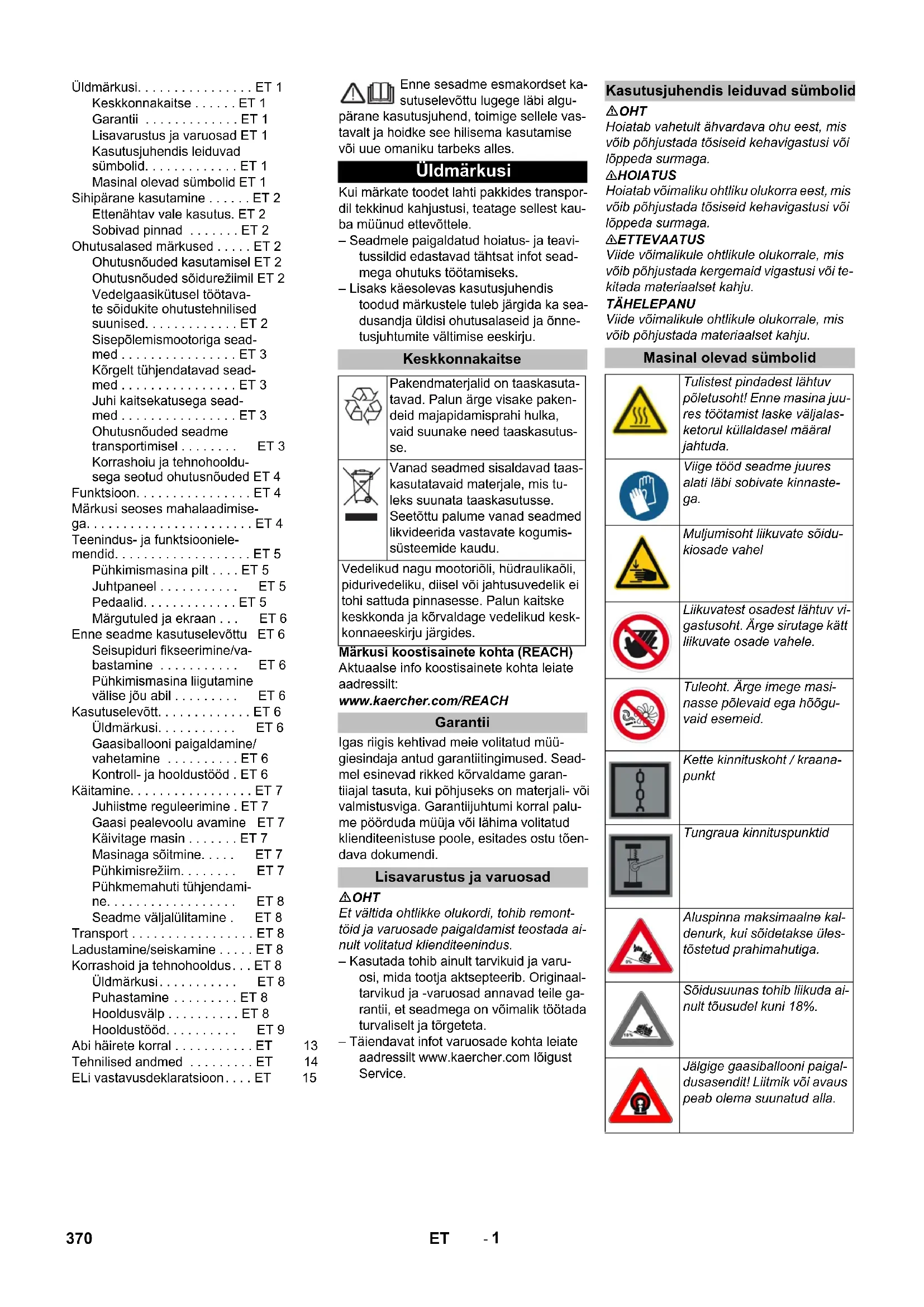 Chairman of the Board of Management Director Regulatory Affairs & Certification 369BG- 1 Enne sesadme esmakordset ka- sutuselevõttu lugege läbi algu- pärane kasutusjuhend, toimige sellele vas- tavalt ja hoidke see hilisema kasutamise või uue omaniku tarbeks alles. Kui märkate toodet lahti pakkides transpor- dil tekkinud kahjustusi, teatage sellest kau- ba müünud ettevõttele. – Seadmele paigaldatud hoiatus- ja teavi- tussildid edastavad tähtsat infot sead- mega ohutuks töötamiseks. – Lisaks käesolevas kasutusjuhendis toodud märkustele tuleb järgida ka sea- dusandja üldisi ohutusalaseid ja õnne- tusjuhtumite vältimise eeskirju. Märkusi koostisainete kohta (REACH) Aktuaalse info koostisainete kohta leiate aadressilt: www.kaercher.com/REACH Igas riigis kehtivad meie volitatud müü- giesindaja antud garantiitingimused. Sead- mel esinevad rikked kõrvaldame garan- tiiajal tasuta, kui põhjuseks on materjali- või valmistusviga. Garantiijuhtumi korral palu- me pöörduda müüja või lähima volitatud klienditeenistuse poole, esitades ostu tõen- dava dokumendi. OHT Et vältida ohtlikke olukordi, tohib remont- töid ja varuosade paigaldamist teostada ai- nult volitatud klienditeenindus. – Kasutada tohib ainult tarvikuid ja varu- osi, mida tootja aktsepteerib. Originaal- tarvikud ja -varuosad annavad teile ga- rantii, et seadmega on võimalik töötada turvaliselt ja tõrgeteta. – Täiendavat infot varuosade kohta leiate aadressilt www.kaercher.com lõigust Service. OHT Hoiatab vahetult ähvardava ohu eest, mis võib põhjustada tõsiseid kehavigastusi või lõppeda surmaga. 몇 HOIATUS Hoiatab võimaliku ohtliku olukorra eest, mis võib põhjustada tõsiseid kehavigastusi või lõppeda surmaga. 몇 ETTEVAATUS Viide võimalikule ohtlikule olukorrale, mis võib põhjustada kergemaid vigastusi või te- kitada materiaalset kahju. TÄHELEPANU Viide võimalikule ohtlikule olukorrale, mis võib põhjustada materiaalset kahju. Üldmärkusi. . . . . . . . . . . . . . . . ET 1 Keskkonnakaitse . . . . . . ET 1 Garantii . . . . . . . . . . . . . ET 1 Lisavarustus ja varuosad ET 1 Kasutusjuhendis leiduvad sümbolid. . . . . . . . . . . . . ET 1 Masinal olevad sümbolid ET 1 Sihipärane kasutamine . . . . . . ET 2 Ettenähtav vale kasutus. ET 2 Sobivad pinnad . . . . . . . ET 2 Ohutusalased märkused . . . . . ET 2 Ohutusnõuded kasutamisel ET 2 Ohutusnõuded sõidurežiimil ET 2 Vedelgaasikütusel töötava- te sõidukite ohutustehnilised suunised. . . . . . . . . . . . . ET 2 Sisepõlemismootoriga sead- med . . . . . . . . . . . . . . . . ET 3 Kõrgelt tühjendatavad sead- med . . . . . . . . . . . . . . . . ET 3 Juhi kaitsekatusega sead- med . . . . . . . . . . . . . . . . ET 3 Ohutusnõuded seadme transportimisel . . . . . . . . ET 3 Korrashoiu ja tehnohooldu- sega seotud ohutusnõuded ET 4 Funktsioon. . . . . . . . . . . . . . . . ET 4 Märkusi seoses mahalaadimise- ga. . . . . . . . . . . . . . . . . . . . . . . ET 4 Teenindus- ja funktsiooniele- mendid. . . . . . . . . . . . . . . . . . . ET 5 Pühkimismasina pilt . . . . ET 5 Juhtpaneel . . . . . . . . . . . ET 5 Pedaalid. . . . . . . . . . . . . ET 5 Märgutuled ja ekraan . . . ET 6 Enne seadme kasutuselevõttu ET 6 Seisupiduri fikseerimine/va- bastamine . . . . . . . . . . . ET 6 Pühkimismasina liigutamine välise jõu abil . . . . . . . . . ET 6 Kasutuselevõtt. . . . . . . . . . . . . ET 6 Üldmärkusi. . . . . . . . . . . ET 6 Gaasiballooni paigaldamine/ vahetamine . . . . . . . . . . ET 6 Kontroll- ja hooldustööd . ET 6 Käitamine. . . . . . . . . . . . . . . . . ET 7 Juhiistme reguleerimine . ET 7 Gaasi pealevoolu avamine ET 7 Käivitage masin . . . . . . . ET 7 Masinaga sõitmine. . . . . ET 7 Pühkimisrežiim. . . . . . . . ET 7 Pühkmemahuti tühjendami- ne. . . . . . . . . . . . . . . . . . ET 8 Seadme väljalülitamine . ET 8 Transport . . . . . . . . . . . . . . . . . ET 8 Ladustamine/seiskamine . . . . . ET 8 Korrashoid ja tehnohooldus. . . ET 8 Üldmärkusi. . . . . . . . . . . ET 8 Puhastamine . . . . . . . . . ET 8 Hooldusvälp . . . . . . . . . . ET 8 Hooldustööd. . . . . . . . . . ET 9 Abi häirete korral . . . . . . . . . . . ET 13 Tehnilised andmed . . . . . . . . . ET 14 ELi vastavusdeklaratsioon. . . . ET 15 Üldmärkusi Keskkonnakaitse Pakendmaterjalid on taaskasuta- tavad. Palun ärge visake paken- deid majapidamisprahi hulka, vaid suunake need taaskasutus- se. Vanad seadmed sisaldavad taas- kasutatavaid materjale, mis tu- leks suunata taaskasutusse. Seetõttu palume vanad seadmed likvideerida vastavate kogumis- süsteemide kaudu. Vedelikud nagu mootoriõli, hüdraulikaõli, pidurivedeliku, diisel või jahtusuvedelik ei tohi sattuda pinnasesse. Palun kaitske keskkonda ja kõrvaldage vedelikud kesk- konnaeeskirju järgides. Garantii Lisavarustus ja varuosad Kasutusjuhendis leiduvad sümbolid Masinal olevad sümbolid Tulistest pindadest lähtuv põletusoht! Enne masina juu- res töötamist laske väljalas- ketorul küllaldasel määral jahtuda. Viige tööd seadme juures alati läbi sobivate kinnaste- ga. Muljumisoht liikuvate sõidu- kiosade vahel Liikuvatest osadest lähtuv vi- gastusoht. Ärge sirutage kätt liikuvate osade vahele. Tuleoht. Ärge imege masi- nasse põlevaid ega hõõgu- vaid esemeid. Kette kinnituskoht / kraana- punkt Tungraua kinnituspunktid Aluspinna maksimaalne kal- denurk, kui sõidetakse üles- tõstetud prahimahutiga. Sõidusuunas tohib liikuda ai- nult tõusudel kuni 18%. Jälgige gaasiballooni paigal- dusasendit! Liitmik või avaus peab olema suunatud alla. 370 ET- 2 Kasutage seda pühkimismasinat ainult vastavalt kasutusjuhendi andmetele. – See pühkimismasin on ette nähtud mustade pindade pühkimiseks välitingi- mustes. – Masinaga ei tohi liikuda avalikel teedel. – Igasugust muud kasutusviisi loetakse mittesihipäraseks. Tootja ei vastuta sel- lest tulenevate kahjude eest; sellega seotud risk lasub ainuüksi kasutajal. – (Gaasimootor) Seadme käitamine on l