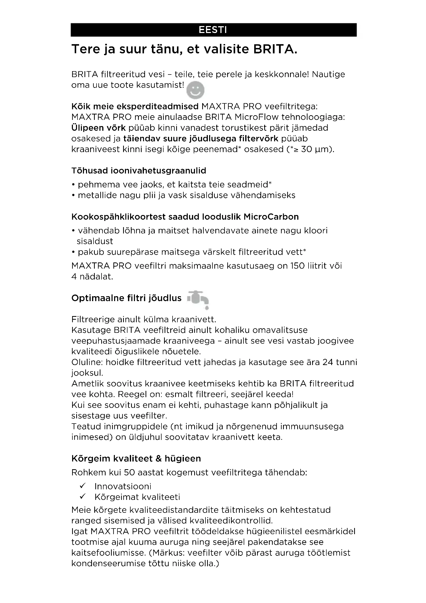 - pakub suurepärase maitsega värskelt filtreeritud vett* MAXTRA PRO veefiltri maksimaalne kasutusaeg on 150 liitrit või 4nädalat. Optimaalne filtri jõudlus Filtreerige ainult külma kraanivett. Kasutage BRITA veefiltreid ainult kohaliku omavalitsuse veepuhastusjaamade kraaniveega – ainult see vesi vastab joogivee kvaliteedi õiguslikele nõuetele. Oluline: hoidke filtreeritud vett jahedas ja kasutage see ära 24 tunni jooksul. Ametlik soovitus kraanivee keetmiseks kehtib ka BRITA filtreeritud vee kohta. Reegel on: esmalt filtreeri, seejärel keeda! Kui see soovitus enam ei kehti, puhastage kann põhjalikult ja sisestage uus veefilter. Teatud inimgruppidele (nt imikud ja nõrgenenud immuunsusega inimesed) on üldjuhul soovitatav kraanivett keeta. Kõrgeim kvaliteet & hügieen Rohkem kui 50 aastat kogemust veefiltritega tähendab: 9 Innovatsiooni 9 Kõrgeimat kvaliteeti Meie kõrgete kvaliteedistandardite täitmiseks on kehtestatud ranged sisemised ja välised kvaliteedikontrollid. Igat MAXTRA PRO veefiltrit töödeldakse hügieenilistel eesmärkidel tootmise ajal kuuma auruga ning seejärel pakendatakse see kaitsefooliumisse. (Märkus: veefilter võib pärast auruga töötlemist kondenseerumise tõttu niiske olla.)MAXTRA PRO veefiltri filtrimaterjal läbib hügieenilistel põhjustel spetsiaalse hõbedatöötluse. Vette võib sattuda väike kogus hõbedat. See on kooskõlas Maailma Terviseorganisatsiooni (WHO) soovitustega. BRITA soovitab veefiltrit regulaarselt vahetada. Järgige filtri ettevalmistamisel soovitatud puhastusprotseduure ja nõuandeid (peatükid 1–7). Kannu tuleb regulaarselt puhastada. Märkus. Kui kannu mõnda aega ei kasutata, eemaldage veefilter, tühjendage kann ning pange veefilter tühja lehtrisse lahtiselt tagasi. Vaadake 7. peatükki „MAXTRA PRO veefiltri vahetamine”. Kasutamine – väga lihtne