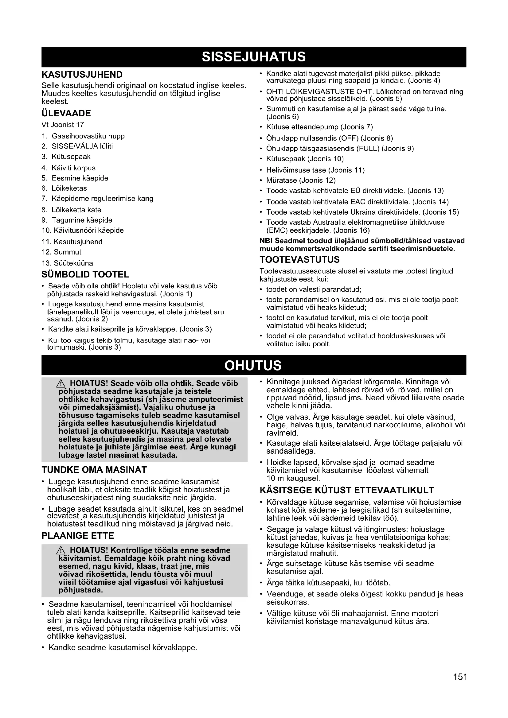 - Hoidke masinat kuivas kohas, mis pole lastele ligipääsetav. OHUTUSALANE MÄRKUS: Bensiinimootoriga tööriistade pikaajalisel kasutamisel võib vibratsioon põhjustada sõrmede, käte ja liigeste veresoonte või närvide kahjustusi inimestel, kes kannatavad vereringehäirete või liigeste tursumise all. Pikaajalist kasutamist külma ilmaga on seostatud veresoonte kahjustustega muidu tervetel inimestel. Kui ilmnevad sellised sümptomid nagu sõrmede, käte või liigeste tuimus, valulikkus, jõu kadumine, naha värvuse või tekstuuri muutumine või tunnetuse kadumine, tuleb kohe katkestada tööriista kasutamine ja pöörduda arsti poole. Vibratsioonivastane süsteem ei garanteeri nende probleemide vältimist. Kasutajad, kes töötavad elektritööriistadega regulaarselt, peavad oma tervislikku seisundit ja tööriista korrasolekut hoolikalt jälgima. KOKKUPANEK a HOIATUS! Kui toode saabub kokkupanduna, korrake kõiki samme ja veenduge, et see on õigesti kokku pandud ning kõik kinnitused on korralikult kinni. Järgige nii kasutusjuhendis kui ka seadmel esitatud ohutusteavet.