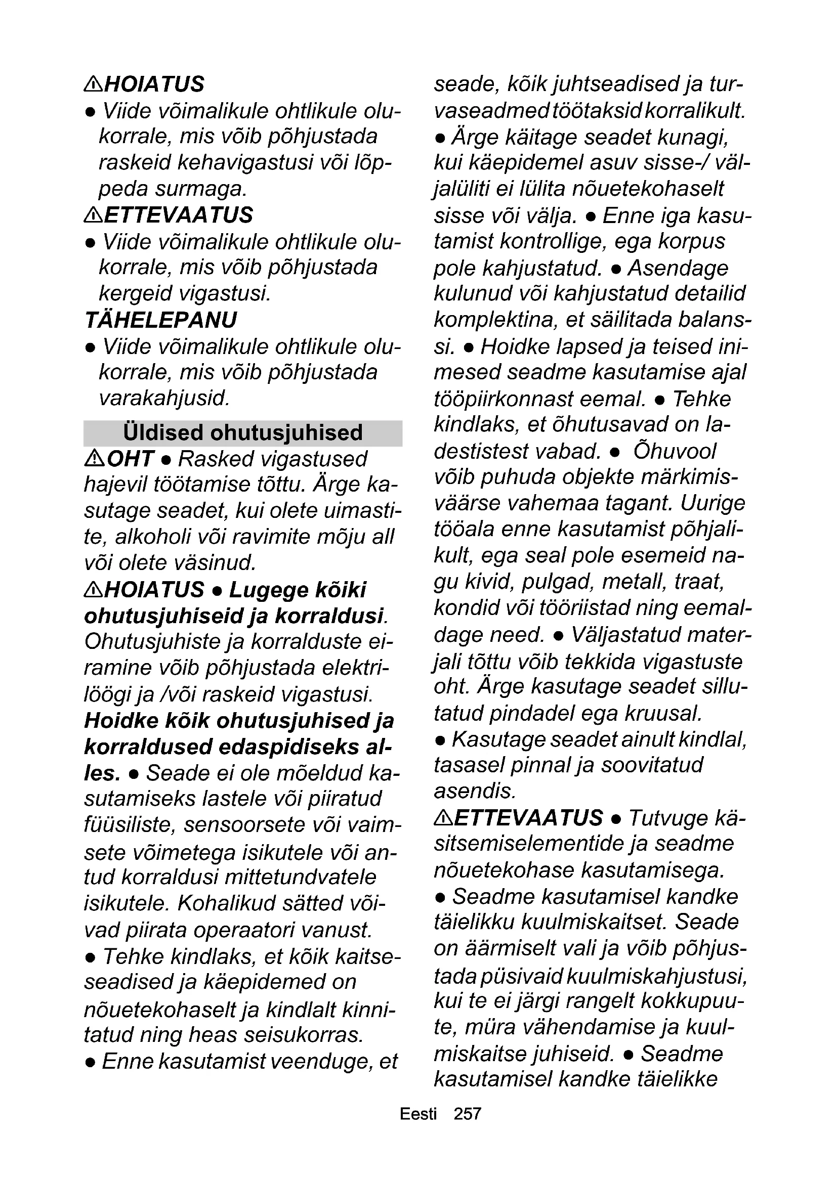 - EL vastavusdeklaratsioon Eesti 257 몇 HOIATUS ● Viide võimalikule ohtlikule olu- korrale, mis võib põhjustada raskeid kehavigastusi või lõp- peda surmaga. 몇 ETTEVAATUS ● Viide võimalikule ohtlikule olu- korrale, mis võib põhjustada kergeid vigastusi. TÄHELEPANU ● Viide võimalikule ohtlikule olu- korrale, mis võib põhjustada varakahjusid. Üldised ohutusjuhised OHT ● Rasked vigastused hajevil töötamise tõttu. Ärge ka- sutage seadet, kui olete uimasti- te, alkoholi või ravimite mõju all või olete väsinud. 몇 HOIATUS ● Lugege kõiki ohutusjuhiseid ja korraldusi. Ohutusjuhiste ja korralduste ei- ramine võib põhjustada elektri- löögi ja /või raskeid vigastusi. Hoidke kõik ohutusjuhised ja korraldused edaspidiseks al- les. ● Seade ei ole mõeldud ka- sutamiseks lastele või piiratud füüsiliste, sensoorsete või vaim- sete võimetega isikutele või an- tud korraldusi mittetundvatele isikutele. Kohalikud sätted või- vad piirata operaatori vanust. ● Tehke kindlaks, et kõik kaitse- seadised ja käepidemed on nõuetekohaselt ja kindlalt kinni- tatud ning heas seisukorras. ● Enne kasutamist veenduge, et seade, kõik juhtseadised ja tur- vaseadmed töötaksid korralikult. ● Ärge käitage seadet kunagi, kui käepidemel asuv sisse-/ väl- jalüliti ei lülita nõuetekohaselt sisse või välja. ● Enne iga kasu- tamist kontrollige, ega korpus pole kahjustatud. ● Asendage kulunud või kahjustatud detailid komplektina, et säilitada balans- si. ● Hoidke lapsed ja teised ini- mesed seadme kasutamise ajal tööpiirkonnast eemal. ● Tehke kindlaks, et õhutusavad on la- destistest vabad. ● Õhuvool võib puhuda objekte märkimis- väärse vahemaa tagant. Uurige tööala enne kasutamist põhjali- kult, ega seal pole esemeid na- gu kivid, pulgad, metall, traat, kondid või tööriistad ning eemal- dage need. ● Väljastatud mater- jali tõttu võib tekkida vigastuste oht. Ärge kasutage seadet sillu- tatud pindadel ega kruusal. ● Kasutage seadet ainult kindlal, tasasel pinnal ja soovitatud asendis. 몇 ETTEVAATUS ● Tutvuge kä- sitsemiselementide ja seadme nõuetekohase kasutamisega. ● Seadme kasutamisel kandke täielikku kuulmiskaitset. Seade on äärmiselt vali ja võib põhjus- tada püsivaid kuulmiskahjustusi, kui te ei järgi rangelt kokkupuu- te, müra vähendamise ja kuul- miskaitse juhiseid. ● Seadme kasutamisel kandke täielikke258 Eesti kaitseprille. Tootja soovitab tun- givalt kanda täismaski või täieli- kult suletud kaitseprille. Tavalised prillid või päikesepril- lid ei kaitse teid paiskunud ese- mete eest. ● Vigastusoht, kui lõdvalt istuv riietus, juuksed või ehted imatakse seadme õhusis- selaskeavasse. Siduge pikad juuksed õla kõrguselt kinni. ● Kandke seadmega töötamisel pikki raskeid pükse, tugevaid ja- latseid ja hästiistuvaid kindaid. Ärge töötage paljajalu. Ärge kandke ehteid, sandaale ega lü- hikesi pükse. TÄHELEPANU ● Seadme ope- raator vastutab teiste isikute või nende omandiga aset leidnud õnnetuste eest. Märkus ● Mõningates piirkon- dades võivad eeskirjad piirata antud seadme kasutamist. Las- ke end nõustada oma kohalikul ametiasutusel. ● Laske seadmel olevad kahjustatud või mitteloe- tavad hoiatussildid volitatud klienditeenindusel asendada. ● Enne akuga imipuhuri kasuta- mist vabastage mustus reha ja harjaga. Ohutu käitamine OHT ● Käitamine plahvatus- ohtlikes piirkondades on keela- tud. 몇 HOIATUS ● Pidage kinni mi- nimaalsest vahekaugusest 15 m inimeste ja loomadeni. Peatage seade, kui keegi astub sellesse piirkonda. ● Hoidke nägu ja ke- ha eemal etteandeavast. ● Enne masina käivitamist veenduge, et etteandekamber oleks tühi. ● Ärge hoidke oma käsi ega muid kehaosi etteandekambris, väljalaskerennis ega muude lii- kuvate osade lähedal. ● Ärge kasutage seadet pikselöögiohu korral. ● Teil on vaja takistama- tut vaadet tööpiirkonnale, et tu- vastada võimalikke ohte. Kasutage seadet ainult hea val- gustuse korral. ● Ärge jookske, vaid kõndige seadmega tööta- des. Ärge kõndige tagurpidi. Vältige ebanormaalset kehahoi- du, hoolitsege tugeva, kindla seisuasendi eest ja hoidke tasa- kaalu. ● Ärge kasutage seadet kunagi defektsete kaitseseadis- tega või ilma kaitseseadisteta nagu nt pühkmepüüdjata. ● Sei- sake seade viivitamatult ja kont- rollige võimalikke kahjustusi või tuvastage vibratsiooni põhjus, kui seade on maha kukkunud, löögi saanud või vibreerib eba- harilikult. Laske kahjustused vo- litatud teeninduses parandada või vahetage seade välja. ● Lüli- tage seade õnnetuse või rikke korral kohe välja ja eemaldage akupakk. Seadme tohib uuesti tööle panna alles siis, kui volita- tud klienditeenindus on seda kontrollinud. ● Vigastusoht pöör- levatel osadel. Lülitage mootorEesti 259 välja, eemaldage akupakk ja tehke kindlaks, et kõik liikuvad detailid on täielikult peatatud: Enne kui jätate seadme järele- valveta. Enne ummistuste eemalda- mist või toru puhastamist. Enne seadme kontrollimist pärast seda, kui seda on taba- nud võõrkeha. Enne seadme kontrollimist, hooldamist või sellel tööta- mist. 몇 ETTEVAATUS ● Sarnaste tööriistade kasutamine ümbrus- konnas suurendab kuulmiskah- justuste riski ja võimalike ohtude mittekuulmise tõenäosust, nagu nt inimesed, kes teie tööruumi sisenevad. ● Ärge muutke sea- det ja kasutage ainult tootja soo- vitatud tarvikuid ning varuosi. Märkus ● Käitage seadet ainult sobival ajal. Järgige ka kohalik- ke eeskirju ja määrusi. Vara- hommikul või hilisõhtul kasutamine võib teisi inimesi häirida. Akupuhuri ohutu töö 몇 ETTEVAATUS ● Oht tervise- le tolmu sissehingamise tõttu. Kandke seadmega töötamisel sobivat hingamismaski. ● Tolmu sisalduse vähendamiseks niisu- tage tolmuseid pindu. ● Ärge käitage seadet avatud akna lä- heduses. ● Ärge suunake puhu- riotsikut inimestele või loomadele. TÄHELEPANU ● Seadme kah- justused pühkme