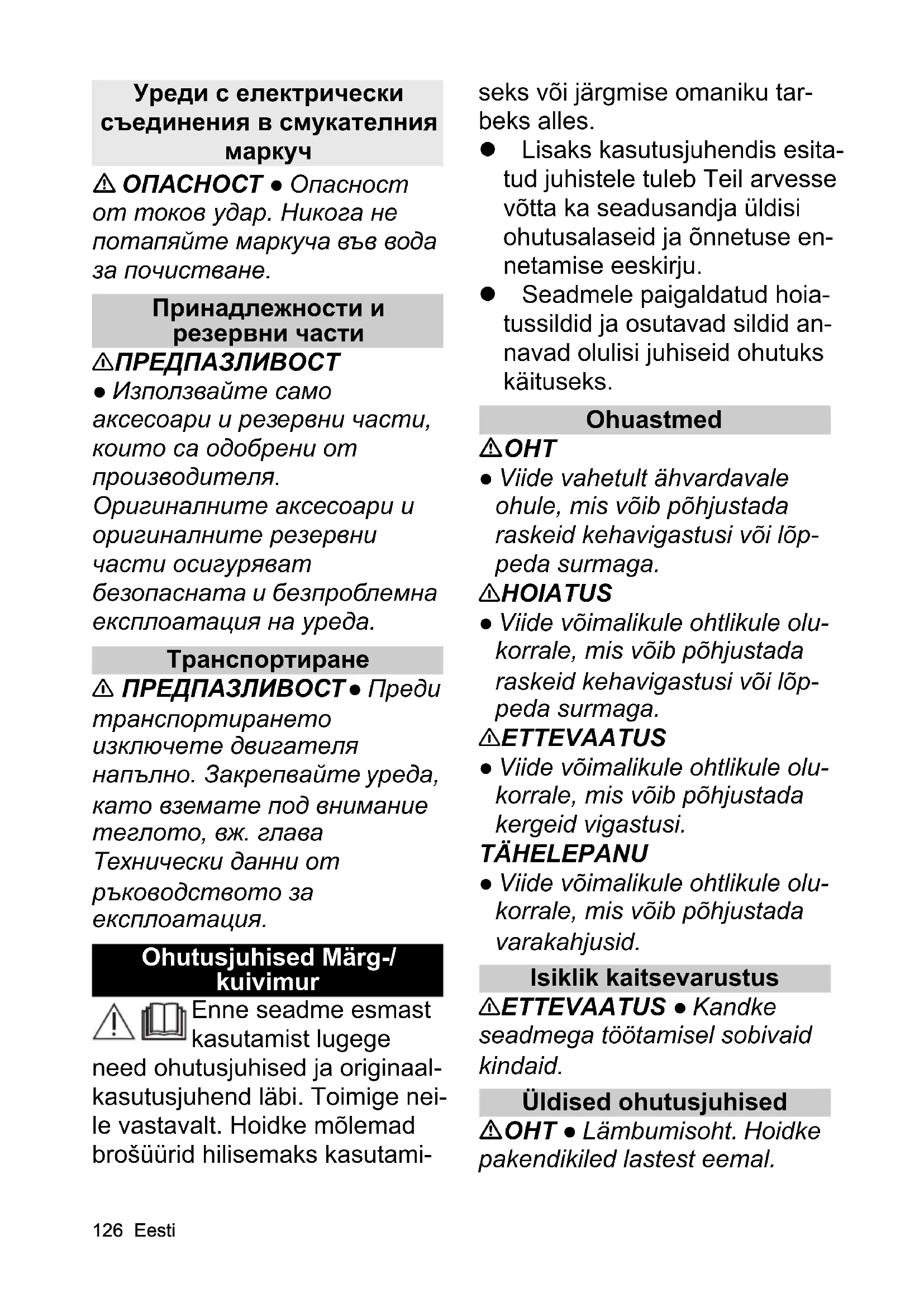 като вземате под внимание теглото, вж. глава Технически данни от ръководството за експлоатация. Ohutusjuhised Märg-/ kuivimur Enne seadme esmast kasutamist lugege need ohutusjuhised ja originaal- kasutusjuhend läbi. Toimige nei- le vastavalt. Hoidke mõlemad brošüürid hilisemaks kasutami- seks või järgmise omaniku tar- beks alles. Lisaks kasutusjuhendis esita- tud juhistele tuleb Teil arvesse võtta ka seadusandja üldisi ohutusalaseid ja õnnetuse en- netamise eeskirju. Seadmele paigaldatud hoia- tussildid ja osutavad sildid an- navad olulisi juhiseid ohutuks käituseks. Ohuastmed OHT ● Viide vahetult ähvardavale ohule, mis võib põhjustada raskeid kehavigastusi või lõp- peda surmaga. 몇 HOIATUS ● Viide võimalikule ohtlikule olu- korrale, mis võib põhjustada raskeid kehavigastusi või lõp- peda surmaga. 몇 ETTEVAATUS ● Viide võimalikule ohtlikule olu- korrale, mis võib põhjustada kergeid vigastusi. TÄHELEPANU ● Viide võimalikule ohtlikule olu- korrale, mis võib põhjustada varakahjusid. Isiklik kaitsevarustus 몇 ETTEVAATUS ● Kandke seadmega töötamisel sobivaid kindaid. Üldised ohutusjuhised OHT ● Lämbumisoht. Hoidke pakendikiled lastest eemal.Eesti 127 몇 HOIATUS ● Kasutage seadet ainult sihtotstarbeliselt. Võtke arvesse kohalikke asjaolusid ning pidage seadmega töötami- sel silmas kolmandaid isikuid, eelkõige lapsi. ● Seade ei ole mõeldud kasutamiseks piiratud füüsiliste, sensoorsete või vaim- sete võimetega isikutele või ko- gemuste ja/või teadmiste puudumisel. ● Seadet tohivad kasutada ainult need inimesed, keda on seadme käsitsemise osas juhendatud või kes on tõendanud oma käsitsemisos- kusi ja keda on selgesõnaliselt volitatud seadet kasutama. ● Lapsed ei tohi seadet käitada. ● Teostage laste üle järelevalvet kindlustamaks, et nad seadme- ga ei mängi. 몇 ETTEVAATUS ● Ohutussea- dised on ette nähtud Teie kait- seks. Ärge kunagi muutke või hiilige kõrvale ohutusseadistest. Elektrilöögi oht OHT ● Ühendage kaitseklas- si I seadmeid ainult nõuetekoha- selt maandatud vooluallikate külge. ● Tüübisildil esitatud pin- ge peab olema kooskõlas voolu- allika pingega. ● Ärge kunagi puudutage võrgupistikut ja pisti- kupesa märgade kätega. 몇 HOIATUS ● Ühendage seade ainult elektrilise ühenduse kül- ge, mis on teostatud elektrispet- sialisti poolt IEC 60364-1 kohaselt. ● Vahu tekke või vede- likulekke korral lülitage seade viivitamatult välja ja tõmmake pistik pesast välja või eemalda- ge aku. ● Tehke enne seadme iga kasutamist kindlaks, et võr- gupistikuga võrguühendusjuhe ei ole kahjustatud. Kui võrgu- ühendusjuhe on kahjustatud, tu- leb see viivitamatult tootja, volitatud klienditeeninduse või erialaspetsialisti poolt asenda- da, et vältida igasuguseid ohte. ● Ärge vigastage või kahjustage võrguühendus- ja pikendusjuhet ülesõitmise, muljumise, tirimise või sellesarnasega. Kaitske võr- guühendusjuhet kuumuse, õli ja teravate servade eest. ● Kasu- tage ainult tootja poolt ettekirju- tatud toitejuhet, see kehtib ka juhtme asenduse korral. Telli- misnr ja tüüpi vt kasutusjuhen- dist. ●  Asendage võrguühendus- või pikendus- juhtme liitmikke ainult sama pritsmekaitsme ja sama mehaa- nilise vastupidavusega liitmike- ga. TÄHELEPANU ● Sisselülitus- protsessid põhjustavad lühiajali- si pingelangusi. ● Ebasoodsate võrgutingimuste korral võivad tekkida teiste seadmete kahjus- tused. ● Võrgu impendatsi korral alla 0,15 oomi ei ole rikkeid oo- data.128 Eesti Käitamine OHT ● Järgige seadme kasu- tamisel ohualadel (nt tanklates) vastavaid ohutuseeskirju. ● Töötamine plahvatusohtlikus keskkonnas on keelatud, välja arvatud juhul, kui seade on sel- leks spetsiaalselt ette nähtud, vt kasutusjuhendi peatükki Sihipä- rane kasutamine. ● Plahvatus- oht. Teatud ained võivad imemisõhu turbulentsil moodus- tada plahvatusohtlikke aure või segusid ja rünnata seadmes ka- sutatavaid materjale. Ärge imege sisse tuleohtlikke gaase, vedelikke ega tolmu (reaktiivsed tolmud), välja ar- vatud juhul, kui seade on sel- leks spetsiaalselt ette nähtud, vt kasutusjuhendi peatükki Si- hipärane kasutamine. Ärge imege sisse reageerivat metallitolmu (nt alumiinium, magneesium, tsink) koos tu- gevalt aluseliste või happelis- te puhastusvahenditega. Ärge imege sisse lahjenda- mata aluseid või tolme. Ärge imege sisse orgaanilisi lahusteid (nt bensiini, värvi la- hustit, atsetooni, kütteõli). Ärge imege sisse põlevaid või hõõguvaid esemeid. 몇 HOIATUS ● Ärge image seadmega inimesi ega loomi. ● Kasutage seadet ainult siis, kui see on selgesõnaliselt mär- gitud tervistkahjustavate tolmu- de eraldamiseks. Järgige kasutusjuhendis toodud ohutus- nõudeid. 몇 ETTEVAATUS ● Kontrollige seadet ja tarvikuid, eelkõige võr- guühendusjuhte ja pikendus- juhtme nõuetekohast seisundit ja töökindlust enne iga käitamist. Kahjustuste korral tõmmake pis- tik välja ja ärge seda seadet ka- sutage. ● Ärge jätke seadet kunagi järelevalveta, kuni see ei ole välja lülitatud ning võrgupis- tik pole välja tõmmatud või aku eemaldatud. TÄHELEPANU ● Ärge käitage seadet temperatuuridel alla 0°C. ● Ärge kasutage seadet madalal temperatuuril. Kuivimur 몇 HOIATUS ● Seade on ette nähtud ainult kuivpuhastuseks. Kasutage seadet ainult siis, kui selgesõnalise märgistuse korral õues märgades oludes. Märgpuhastus 몇 ETTEVAATUS ● Imege ve- delaid aineid sisse ainult tempe- ratuurini 45 °C. TÄHELEPANU ● Kasutage sea- det jahutusvedelike ja määrde- ainete sisse imemiseks ainult koos sobivate varustusega. L, M ja H tolmuklassiga seadmed OHT ● Oht tervist kahjustava tolmu tõttu Kandke hooldustöö- del (nt filtri vahetamisel) hinga-Eesti 129 miskaitsemaski P2 või kõrgema väärtusega nin
