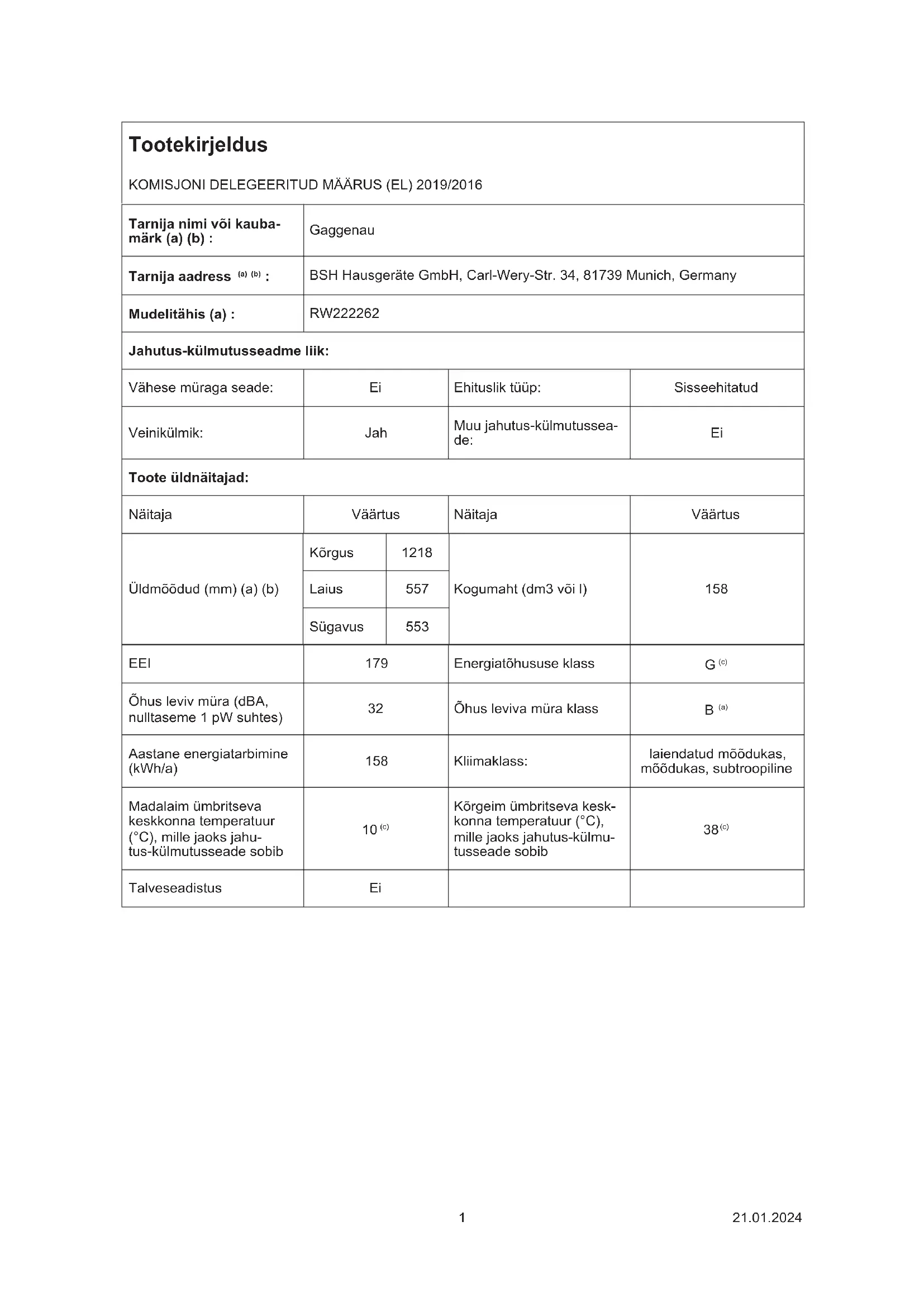 24 kuud Lisateave (a) (b) : Link tootja veebisaidile, kus on esitatud komisjoni määruse (EL) 2019/2019 II lisa punkti 4 kohane teave: www.gaggenau.com/energylabel (a) Seda elementi ei käsitata asjakohasena määruse (EL) 2017/1369 artikli 2 lõike 6 kohaldamisel. (b) Nende elementide muudatusi ei käsitata määruse (EL) 2017/1369 artikli 4 lõike 4 kohaldamisel asjako- hastena. (c) Kui toodete andmebaas tekitab selle lahtri lõpliku sisu automaatselt, ei pea tarnija neid andmeid sisesta- ma. (d) Nagu see on kindlaks määratud määruse (EL) 2019/2015 kohaselt.