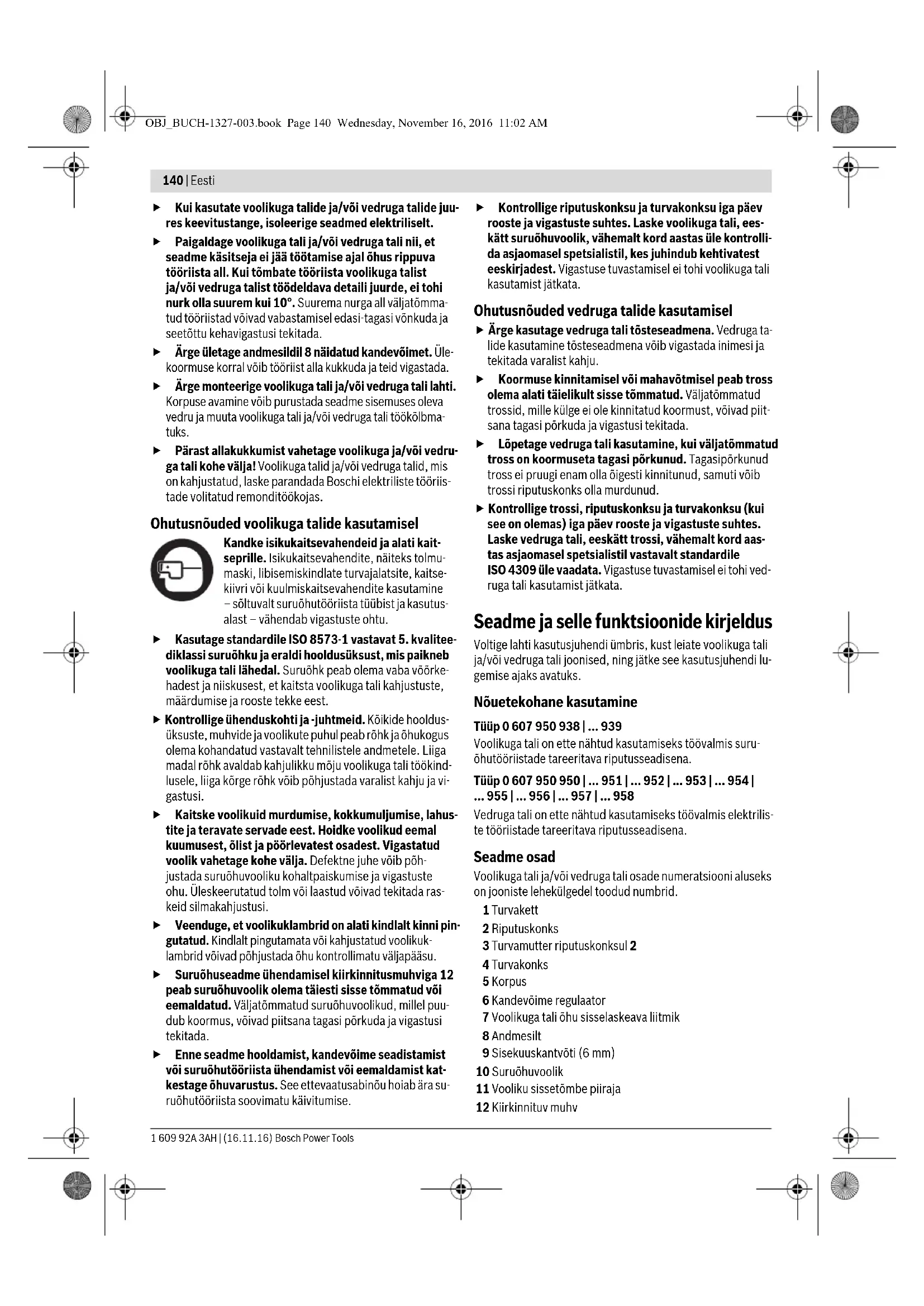 - Vedruga tali on ette nähtud kasutamiseks töövalmis elektrilis- te tööriistade tareeritava riputusseadisena. Seadme osad Voolikuga tali ja/või vedruga tali osade numeratsiooni aluseks on jooniste lehekülgedel toodud numbrid. 1 Turvakett 2 Riputuskonks 3 Turvamutter riputuskonksul 2 4 Turvakonks 5 Korpus 6 Kandevõime regulaator 7 Voolikuga tali õhu sisselaskeava liitmik 8 Andmesilt 9 Sisekuuskantvõti (6 mm) 10 Suruõhuvoolik 11 Vooliku sissetõmbe piiraja 12 Kiirkinnituv muhv OBJ_BUCH-1327-003.book Page 140 Wednesday, November 16, 2016 11:02 AMEesti | 141 Bosch Power Tools 1 609 92A 3AH | (16.11.16) 13 Voolikunippel koos voolikuhülsiga 14 Voolikunippel 15 Voolikuklamber 16 Juurdetuleva õhu voolik 17 Nippel (voolikunippel koos vooliku otsaga) 18 Voolikumuhv (väliskeermega muhv) 19 Hooldusüksuse õhu väljalaskeava 20 Keermega muhvinippel 21 Ühendustuts õhu sisselaskeava juures 22 Voolikunippel suruõhutööriista tarnekomplektis 23 Vooliku vahetükk koos voolikuklambritega 24 Käsiratas kandevõime reguleerimiseks 25 Tross 26 Elastne trossi sissetõmbe piiraja 27 Lastikonks 28 Sisekuuskantvõti (4 mm) 29 Kandevõime reguleerimise kruvi 30 Suruklemm trossi vaba otsa kinnitamiseks 31 Trossilukk trossi pikkuse reguleerimiseks 32 Trossi sissetõmbe piiraja klemm Tarnekomplekt ei sisalda kõiki kasutusjuhendis olevatel joonistel kujutatud või kasutusjuhendis nimetatud lisatarvikuid. Tehnilised andmed Montaaž Seadis, mille külge kinnitatakse voolikuga tali ja/või vedruga tali riputuskonks 2 ja turvakonks 4, peab vas- tama ohutusklassile 5. Selleks et voolikuga tali ja/või ved- ruga tali ohutult käsitseda, arvutage välja voolikuga tali ja/või vedruga tali omakaal (vt „Tehnilised andmed“), lisa- ge sellele maksimaalne kandevõime (selle külge kinnitatud tööriista kaal) ja korrutage summa 5-ga. Pärast allakukkumist vahetage voolikuga tali ja/või vedruga tali kohe välja! Voolikuga talid ja/või vedruga ta- lid, mis on kahjustatud, laske parandada Boschi elektriliste tööriistade volitatud remonditöökojas. Voolikuga tali (tagasitooja) Tootenumber 0 607 950 Kandevõime p. 938