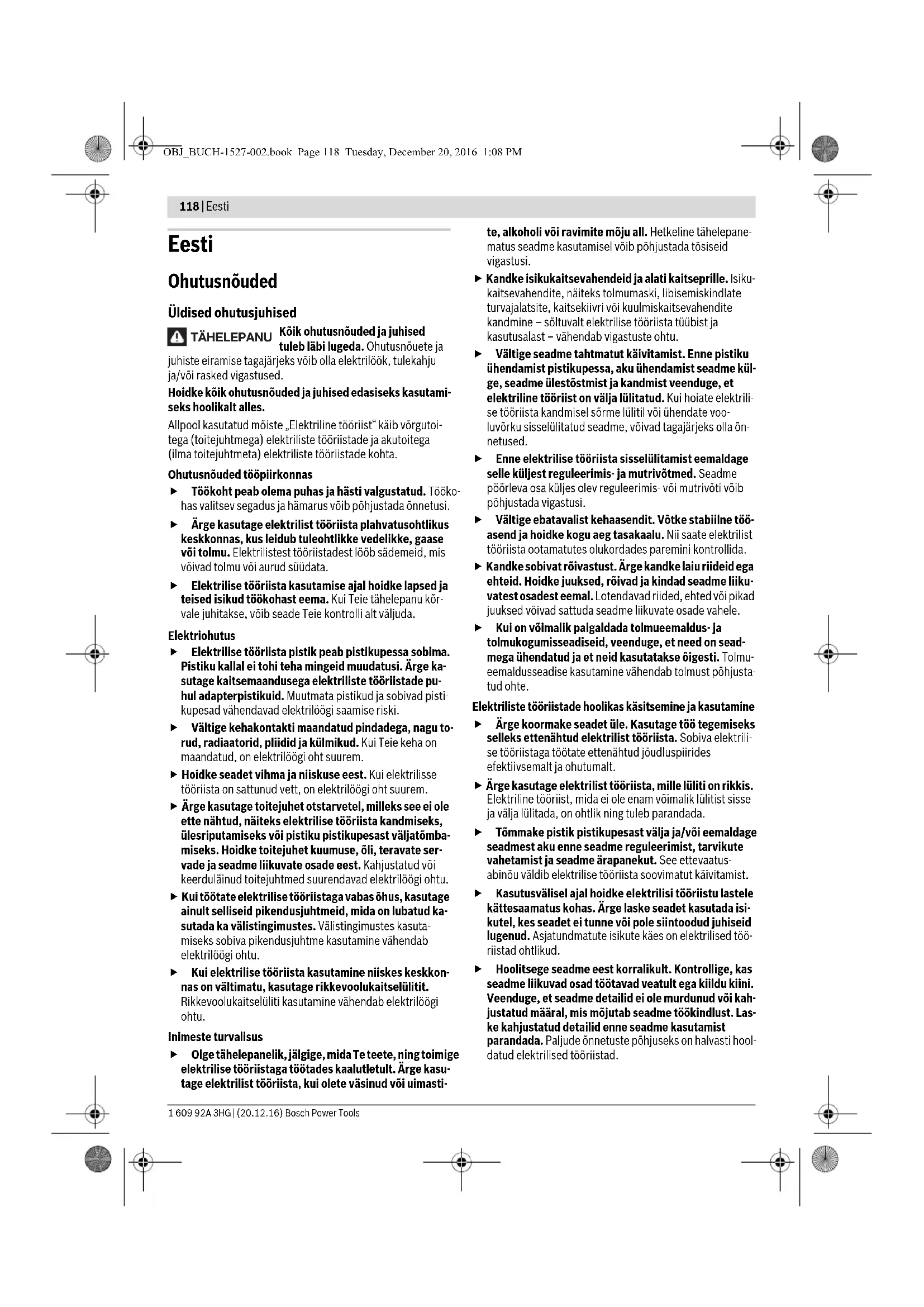 lbs 2,6 5,7 2,6 5,7 Klasa zaštite /I /I OBJ_BUCH-1527-002.book Page 116 Tuesday, December 20, 2016 1:08 PMHrvatski | 117 Bosch Power Tools 1 609 92A 3HG | (20.12.16) Rad Puštanje u rad Uključivanje/isključivanje mrežnog priključnog uređaja PUC-EXACT (vidjeti sliku C) Prije nego što uključite električni alat PUC-EXACT, najprije morate pustiti u rad mrežni priključni uređaj C-EXACT (vidjeti »Priključak na izvor struje«, stranica 116). Za uključivanje mrežnog priključnog uređaja prekidač za uključivanje/isključivanje 2 na mrežnom priključnom uređaju pritisnite u položaj 1. Zeleni svijetleći LED-pokazivač 3 pokazuje kada je mrežni pri- ključni uređaj spreman za rad. PUC-EXACT 1: Ako svijetli LED-pokazivač 4, onda postoji smetnja. Za isključivanje mrežnog priključnog uređaja, prekidač za uključivanje/isključivanje na mrežnom priključnom uređaju 2 pritisnite u položaj 0. Radi uštede energije uključite mrežni priključni uređaj tek on- da kada ga koristite. Uključivanje/isključivanje električnog alata Električni ravni odvijač s polužnim startom (vidjeti sliku D) Za uključivanje električnog alata pritisnite do graničnika pre- kidač za uključivanje/isključivanje 2. Električni alat će se automatski isključiti čim se dosegne na- mješteni zakretni moment. Kod prijevremenog otpuštanja prekidača za uključiva- nje/isključivanje 2, neće se doseći prethodno namje- šteni okretni moment. Električni ravni odvijač s potisnim startom Za uključivanje električnog alata, radni alat stavite na vijak i laganim pritiskom pritisnite aksijalno na vijak. Električni alat će se automatski isključiti čim se dosegne na- mješteni zakretni moment. Za slučaj prijevremenog rasterećenja odvijača, npr. ako bi radni alat odvijača kliznuo sa vijka, neće se posti- ći prethodno namješteni okretni moment. Upute za rad Pri radu pazite da se mrežni ispravljač nehotično ne povuče sa radne površine. Mrežni ispravljač ili sigurno pričvrstite na zid ili mrežni priključni kabel položite tako da se na njega ne mo- žete spotaknuti. Zaštita od preopterećenja (PUC-EXACT 1) U slučaju preopterećenja mrežnog ispravljača upalit će se LED pokazivač 4 i signalizirati smetnju u radu. Prekinite s radom. Isključite odvijač i mrežni ispravljač. Kontrolirajte odvijač i kabel uređaja. Zamijenite neispravni dio. Nakon toga ponovno pustite u rad mrežni ispravljač i odvijač. Ako još uvijek svijetli LED-pokazivač 4, znači da je mrežni ispravljač neispravan. Odnesite ga na popravak u ovlašteni servis za Bosch električne alate. Održavanje i servisiranje Održavanje i čišćenje Prije izvođenja radova čišćenja mrežni priključni ure- đaj PUC-EXACT odspojite sa električne mreže. Time će se izbjeći opasnost strujnog udara. Isključivanje mrežnog priključnog uređaja nije dovoljno. Mrežni ispravljač ne zahtjeva održavanje. Sam uređaj i njego- ve otvore za hlađenje uvijek održavajte slobodnim i čistim. Priključne utičnice, spojnice i utikač mrežnog ispravljača ods- pojenog sa električne mreže redovito čistite suhom krpom ko- ja ne ispušta niti, te odstranite prljavštinu i čestice prljavštine. Ako je potrebna zamjena priključnog kabela, tada je treba pro- vesti u Bosch servisu ili u ovlaštenom servisu za Bosch elek- trične alate, kako bi se izbjeglo ugrožavanje sigurnosti. Radove održavanja i popravaka prepustite samo kvali- ficiranom stručnom osoblju. Na taj će se način održati si- gurnost mrežnog ispravljača. Ovlašteni Bosch servis će ove radove izvesti brzo i pouzdano. Maziva i sredstva za čišćenje zbrinite na ekološki prihvat- ljiv način. Kod toga se pridržavajte zakonskih propisa. Pribor O kompletnom kvalitetnom programu pribora možete se in- formirati na Internetu na adresi www.bosch-pt.com i www.boschproductiontools.com ili kod vašeg spe- cijaliziranog trgovca. Servisiranje i savjetovanje o primjeni Ovlašteni servis će odgovoriti na vaša pitanja o popravcima i održavanju vašeg proizvoda te o rezervnim dijelovima. Pove- ćane crteže i informacije o rezervnim dijelovima možete naći na adresi: www.bosch-pt.com Bosch tim za savjetovanje o primjeni rado će vam pomoći od- govorom na pitanja o našim proizvodima i priboru. Za slučaj povratnih upita ili naručivanja rezervnih dijelova, molimo vas neizostavno navedite 10-znamenkasti kataloški broj sa tipske pločice proizvoda. Hrvatski Robert Bosch d.o.o Kneza Branimira 22 10040 Zagreb Tel.: (01) 2958051 Fax: (01) 2958050 Zbrinjavanje Mrežni ispravljači, pribor i ambalaža moraju se odvesti na eko- loški prihvatljivo recikliranje. Mrežne ispravljače ne bacajte u kućni otpad! Samo za zemlje EU: Prema Europskim smjernicama 2012/19/EU za električne i elektroničke stare uređaje, električni alati koji više nisu uporabivi moraju se odvojeno sakupiti i do- vesti na ekološki prihvatljivu ponovnu pri- mjenu. Zadržavamo pravo na promjene. OBJ_BUCH-1527-002.book Page 117 Tuesday, December 20, 2016 1:08 PM118 | Eesti 1 609 92A 3HG | (20.12.16) Bosch Power Tools Eesti Ohutusnõuded Üldised ohutusjuhised Kõik ohutusnõuded ja juhised tuleb läbi lugeda. Ohutusnõuete ja juhiste eiramise tagajärjeks võib olla elektrilöök, tulekahju ja/või rasked vigastused. Hoidke kõik ohutusnõuded ja juhised edasiseks kasutami- seks hoolikalt alles. Allpool kasutatud mõiste „Elektriline tööriist“ käib võrgutoi- tega (toitejuhtmega) elektriliste tööriistade ja akutoitega (ilma toitejuhtmeta) elektriliste tööriistade kohta. Ohutusnõuded tööpiirkonnas Töökoht peab olema puhas ja hästi valgustatud. Tööko- has valitsev segadus ja hämarus võib põhjustada õnnetusi. Ärge kasutage elektrilist tööriista plahvatusohtlikus keskkonnas, kus leidub tuleohtlikke vedelikke, gaase või tolmu. Elektrilistest tööriistadest lööb sädemeid, mis võivad tolmu või aurud süüdata. Elektrilise tööriista kasutamise ajal hoidke lapse