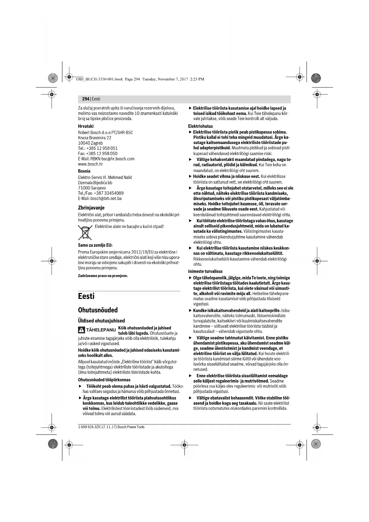 OBJ_BUCH-3330-001.book Page 292 Tuesday, November 7, 2017 2:23 PMHrvatski | 293 Bosch Power Tools 1 609 92A 3ZX | (7.11.17) Gruba obrada brušenjem Ne koristite nikada brusne ploče za rezanje za grubo brušenje. Sa postavnim kutom od 30° do 40° dobit ćete kod grubog brušenja najbolji radni rezultat. Električni alat pomičite uz umjereni pritisak amo-tamo. Na taj se način izradak neće za- grijati, neće promijeniti boju i neće na njemu ostati brazde. Lepezasta brusna ploča Sa lepezastom brusnom pločom (pribor) možete obrađivati i zaobljene površine i profile. Lepezaste brusne ploče imaju bitno dulji vijek trajanja, stvara- ju manju buku i manje se zagrijavaju kod brušenja, u odnosu na uobičajene brusne ploče. Rezanje metala Kod rezanja sa kompozitnim brusnim sredstvima za re- zanje koristite uvijek štitnik za rezanje 14. Kod rezanja brusnim pločama za rezanje treba raditi sa umje- renim posmakom prilagođenim materijalu. Ne djelujte nika- kvim pritiskom na brusnu ploču za rezanje niti oscilirajte. Brusnu ploču za rezanje koja se inercijski zaustavlja ne kočite bočnim pritiskom. Električni alat mora se uvijek voditi protuhod- no. Međutim postoji opasnost da se nekon- trolirano istisne iz reza. Kod rezanja profila i četverokutnih cijevi najbolje je da stavite na najmanji presjek. Rezanje kamena Kod rezanja kamena treba osigurati zadovoljavajuće odsisavanje prašine. Nosite zaštitnu masku protiv prašine. Električni alat se smije koristiti samo za suho reza- nje/suho brušenje. Za rezanje kamena najbolje je koristiti dijamantne ploče za re- zanje. Kod primjene usisne haube za rezanje sa vodilicama 21, mora se koristiti odobreni usisavač za usisavanje prašine kamena. Bosch za to nudi prikladne usisavače prašine. Uključite električni alat i stavite ga na izradak sa prednjim dijelom vodili- ca. Pomičite električni alat sa umjerenim po- smakom prilagođenim obrađivanom materija- lu. Kod rezanja posebno tvrdih materijala, npr. betona sa velikim sadržajem šljunka, dijamantna ploča za rezanje bi se mogla pregrijati i zbog toga oštetiti. Na to ukazuje vijenac iskri koji se okreće sa dijamantnom pločom za rezanje. U tom slučaju prekinite postupak rezanja i ostavite dijaman- tnu ploču za rezanje da u svrhu hlađenja kraće vrijeme radi pri praznom hodu kod maksimalnog broja okretaja. Osjetno slabljenje napredovanja rada i rotirajući vijenac iskri predstavljaju znak zatupljenja dijamantne ploče za rezanje. Ona se može ponovno naoštriti kratkim rezovima u abraziv- nom materijalu, npr. krečnopješčaniku. Napomene za statiku Prorezivanje nosivih zidovima podliježe normi DIN 1053 dio 1 ili važećim propisima dotične zemlje. Ovih se propisa treba neizostavno pridržavati. Prije početka rada savjetujte se sa odgovornim statičarom, arhitektima ili ovlaštenim rukovodstvom gradilišta. Održavanje i servisiranje Održavanje i čišćenje Prije svih radova na električnom alatu izvucite mrežni utikač iz utičnice. Električni alat i otvore za hlađenje održavajte čistim ka- ko bi se moglo dobro i sigurno raditi. Kod ekstremnih uvjeta primjene po mogućnosti uvijek treba koristiti usisni uređaj. Često ispuhavajte otvore za hlađenje i predspojite zaštitnu sklopku struje kvara (PRCD). Kod obrade metala vodljiva prašina se može na- kupiti unutar električnog alata. To može negativno utjecati na zaštitnu izolaciju električnog alata. Ako je potrebna zamjena priključnog kabela, tada je treba pro- vesti u Bosch servisu ili u ovlaštenom servisu za Bosch elek- trične alate, kako bi se izbjeglo ugrožavanje sigurnosti. Pažljivo uskladištite i postupajte sa priborom. Servisiranje i savjetovanje o primjeni Ovlašteni servis će odgovoriti na vaša pitanja o popravcima i održavanju vašeg proizvoda te o rezervnim dijelovima. Pove- ćane crteže i informacije o rezervnim dijelovima možete naći na adresi: www.bosch-pt.com Bosch tim za savjetovanje o primjeni rado će vam pomoći od- govorom na pitanja o našim proizvodima i priboru. OBJ_BUCH-3330-001.book Page 293 Tuesday, November 7, 2017 2:23 PM294 | Eesti 1 609 92A 3ZX | (7.11.17) Bosch Power Tools Za slučaj povratnih upita ili naručivanja rezervnih dijelova, molimo vas neizostavno navedite 10-znamenkasti kataloški broj sa tipske pločice proizvoda. Hrvatski Robert Bosch d.o.o PT/SHR-BSC Kneza Branimira 22 10040 Zagreb Tel.: +385 12 958 051 Fax: +385 12 958 050 E-Mail: RBKN-bsc@hr.bosch.com www.bosch.hr Bosnia Elektro-Servis Vl. Mehmed Nalić Dzemala Bijedića bb 71000 Sarajevo Tel./Fax: +387 33454089 E-Mail: bosch@bih.net.ba Zbrinjavanje Električni alat, pribor i ambalažu treba dovesti na ekološki pri- hvatljivu ponovnu primjenu. Električne alate ne bacajte u kućni otpad! Samo za zemlje EU: Prema Europskim smjernicama 2012/19/EU za električne i elektroničke stare uređaje, električni alati koji više nisu upora- bivi moraju se odvojeno sakupiti i dovesti na ekološki prihvat- ljivu ponovnu primjenu. Zadržavamo pravo na promjene. Eesti Ohutusnõuded Üldised ohutusjuhised Kõik ohutusnõuded ja juhised tuleb läbi lugeda. Ohutusnõuete ja juhiste eiramise tagajärjeks võib olla elektrilöök, tulekahju ja/või rasked vigastused. Hoidke kõik ohutusnõuded ja juhised edasiseks kasutami- seks hoolikalt alles. Allpool kasutatud mõiste „Elektriline tööriist“ käib võrgutoi- tega (toitejuhtmega) elektriliste tööriistade ja akutoitega (ilma toitejuhtmeta) elektriliste tööriistade kohta. Ohutusnõuded tööpiirkonnas Töökoht peab olema puhas ja hästi valgustatud. Tööko- has valitsev segadus ja hämarus võib põhjustada õnnetusi. Ärge kasutage elektrilist tööriista plahvatusohtlikus keskkonnas, kus leidub tuleohtlikke vedelikke, gaase või tolmu. Elektrilistest tööriistadest lööb sädemeid, mis võivad tolmu või aurud süüdata. Elektrilise tööriista kasutamise ajal hoidke lapsed ja teised isikud töökohast eema. Kui Teie tähelepanu kõr- vale juhitakse, võib