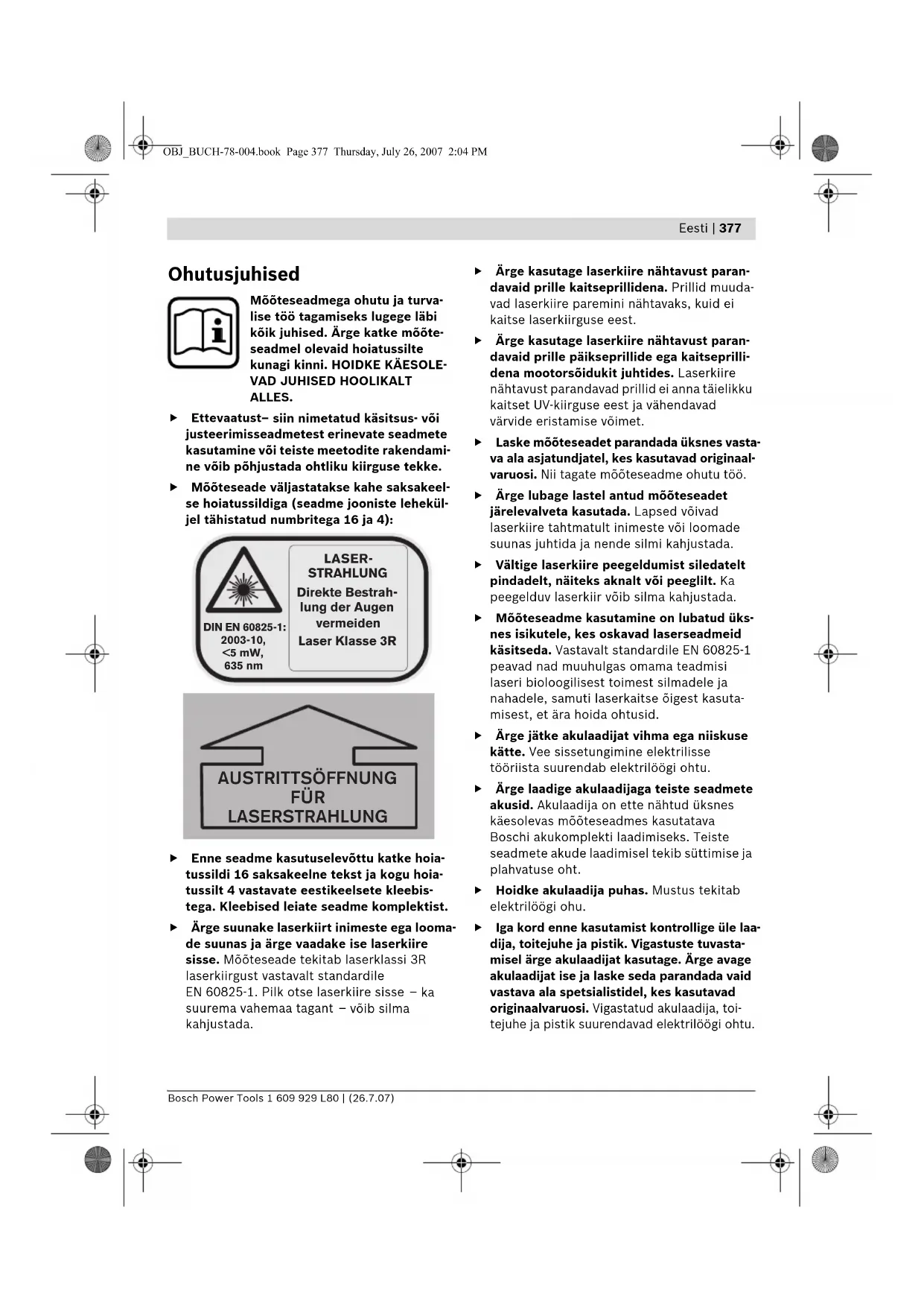ALLES. f Ettevaatust – siin nimetatud käsitsus- või justeerimisseadmetest erinevate seadmete kasutamine või teiste meetodite rakendami- ne võib põhjustada ohtliku kiirguse tekke. f Mõõteseade väljastatakse kahe saksakeel- se hoiatussildiga (seadme jooniste lehekül- jel tähistatud numbritega 16 ja 4): f Enne seadme kasutuselevõttu katke hoia- tussildi 16 saksakeelne tekst ja kogu hoia- tussilt 4 vastavate eestikeelsete kleebis- tega. Kleebised leiate seadme komplektist. f Ärge suunake laserkiirt inimeste ega looma- de suunas ja ärge vaadake ise laserkiire sisse. Mõõteseade tekitab laserklassi 3R laserkiirgust vastavalt standardile EN 60825-1. Pilk otse laserkiire sisse – ka suurema vahemaa tagant – võib silma kahjustada. f Ärge kasutage laserkiire nähtavust paran- davaid prille kaitseprillidena. Prillid muuda- vad laserkiire paremini nähtavaks, kuid ei kaitse laserkiirguse eest. f Ärge kasutage laserkiire nähtavust paran- davaid prille päikseprillide ega kaitseprilli- dena mootorsõidukit juhtides. Laserkiire nähtavust parandavad prillid ei anna täielikku kaitset UV-kiirguse eest ja vähendavad värvide eristamise võimet. f Laske mõõteseadet parandada üksnes vasta- va ala asjatundjatel, kes kasutavad originaal- varuosi. Nii tagate mõõteseadme ohutu töö. f Ärge lubage lastel antud mõõteseadet järelevalveta kasutada. Lapsed võivad laserkiire tahtmatult inimeste või loomade suunas juhtida ja nende silmi kahjustada. f Vältige laserkiire peegeldumist siledatelt pindadelt, näiteks aknalt või peeglilt. Ka peegelduv laserkiir võib silma kahjustada. f Mõõteseadme kasutamine on lubatud üks- nes isikutele, kes oskavad laserseadmeid käsitseda. Vastavalt standardile EN 60825-1 peavad nad muuhulgas omama teadmisi laseri bioloogilisest toimest silmadele ja nahadele, samuti laserkaitse õigest kasuta- misest, et ära hoida ohtusid. f Ärge jätke akulaadijat vihma ega niiskuse kätte. Vee sissetungimine elektrilisse tööriista suurendab elektrilöögi ohtu. f Ärge laadige akulaadijaga teiste seadmete akusid. Akulaadija on ette nähtud üksnes käesolevas mõõteseadmes kasutatava Boschi akukomplekti laadimiseks. Teiste seadmete akude laadimisel tekib süttimise ja plahvatuse oht. f Hoidke akulaadija puhas. Mustus tekitab elektrilöögi ohu. f Iga kord enne kasutamist kontrollige üle laa- dija, toitejuhe ja pistik. Vigastuste tuvasta- misel ärge akulaadijat kasutage. Ärge avage akulaadijat ise ja laske seda parandada vaid vastava ala spetsialistidel, kes kasutavad originaalvaruosi. Vigastatud akulaadija, toi- tejuhe ja pistik suurendavad elektrilöögi ohtu. DIN EN 60825-1:2003-10, <5 mW, 635 nm LASER- STRAHLUNG Direkte Bestrah- lung der Augen vermeiden Laser Klasse 3R AUSTRITTSÖFFNUNG FÜR LASERSTRAHLUNG OBJ_BUCH-78-004.book Page 377 Thursday, July 26, 2007 2:04 PM378 | Eesti 1 609 929 L80 | (26.7.07) Bosch Power Tools f Ärge kasutage akulaadijat kergestisüttival pinnal (nt paberil, tekstiilidel jmt) ja süttimisohtlikus keskkonnas. Akulaadija kuumeneb laadimisel, mistõttu tekkib tulekahjuoht. f Väärkasutuse korral võib akuvedelik välja voolata. Vältige sellega kokkupuudet. Juhusliku kokkupuute korral loputage kahjustatud kohta veega. Kui vedelik satub silma, pöörduge lisaks arsti poole. Väljavoolav akuvedelik võib põhjustada nahaärritusi või põletusi. Tööpõhimõtte kirjeldus Voltige lahti kasutusjuhendi ümbris seadme joonistega ja jätke see kasutusjuhendi lugemise ajaks avatuks. Nõuetekohane kasutus Mõõteseade on ette nähtud täpsete horisontaa- lide, vertikaalide, rihtjoonte ja loodipunktide kindlaksmääramiseks ja kontrollimiseks sise- ja välistingimustes. Seadme osad Seadme osade numeratsiooni aluseks on jooniste leheküljel toodud numbrid. 1 Libell 2 Kaugjuhtimispuldi signaali vastuvõtuväli 3 Laadija pistiku pesa 4 Laserkiire väljumisava hoiatussilt 5 Laserkiire väljumisava 6 Y-telje märgistus 7 X-telje märgistus 8 Loodikiir 9 Muutuv laserkiir 10 X-telje loodisälgud 11 Y-telje loodisälgud 12 Patareikorpuse kaane lukustus 13 Patareikorpuse kaas 14 Kummijalg 15 Aku 16 Laseri hoiatussilt 17 Statiivi ühenduskeere 5/8" (horisontaalne ja vertikaalne) 18 Seerianumber 19 Joonliikumise ja joone pikkuse valiku nupp 20 Ülemise suuna nupp 21 Vasaku suuna nupp 22 Pöördliikumise ja pöörlemiskiiruse valiku nupp 23 Alumise suuna nupp 24 Parema suuna nupp 25 Manuaalse loodimise indikaator „man“ 26 Automaatse loodimise indikaator „auto“ 27 Aku laetuse astme indikaator 28 Nupp „man/auto“ automaatse loodimise väljalülitamiseks 29 Lüliti (sisse/välja) 30 Ehituslaseri mõõtevarras* 31 Laserkiire nähtavust parandavad prillid 32 Seinakinnitusrakis/rihtija* 33 5/8"-keermega kruvi seinakinnitusrakise küljes* 34 Rihtija kruvid* 35 Mõõteplaat koos jalaga 36 Laemõõteplaat* 37 Kaldkiil* 38 Vastuvõtja koos kinnitusrakisega 39 Kaugjuhtimispult 40 Statiiv* 41 Laadimispistik 42 Akulaadija 43 Kohver *Tarnekomplekt ei sisalda kõiki kasutusjuhendis olevatel joonistel kujutatud või kasutusjuhendis nimetatud lisatarvikuid. OBJ_BUCH-78-004.book Page 378 Thursday, July 26, 2007 2:04 PMEesti | 379 Bosch Power Tools 1 609 929 L80 | (26.7.07) Tehnilised andmed Ehituslaser BL 200 GC Professional Tootenumber 3 601 K15 000 Tööpiirkond (raadius)