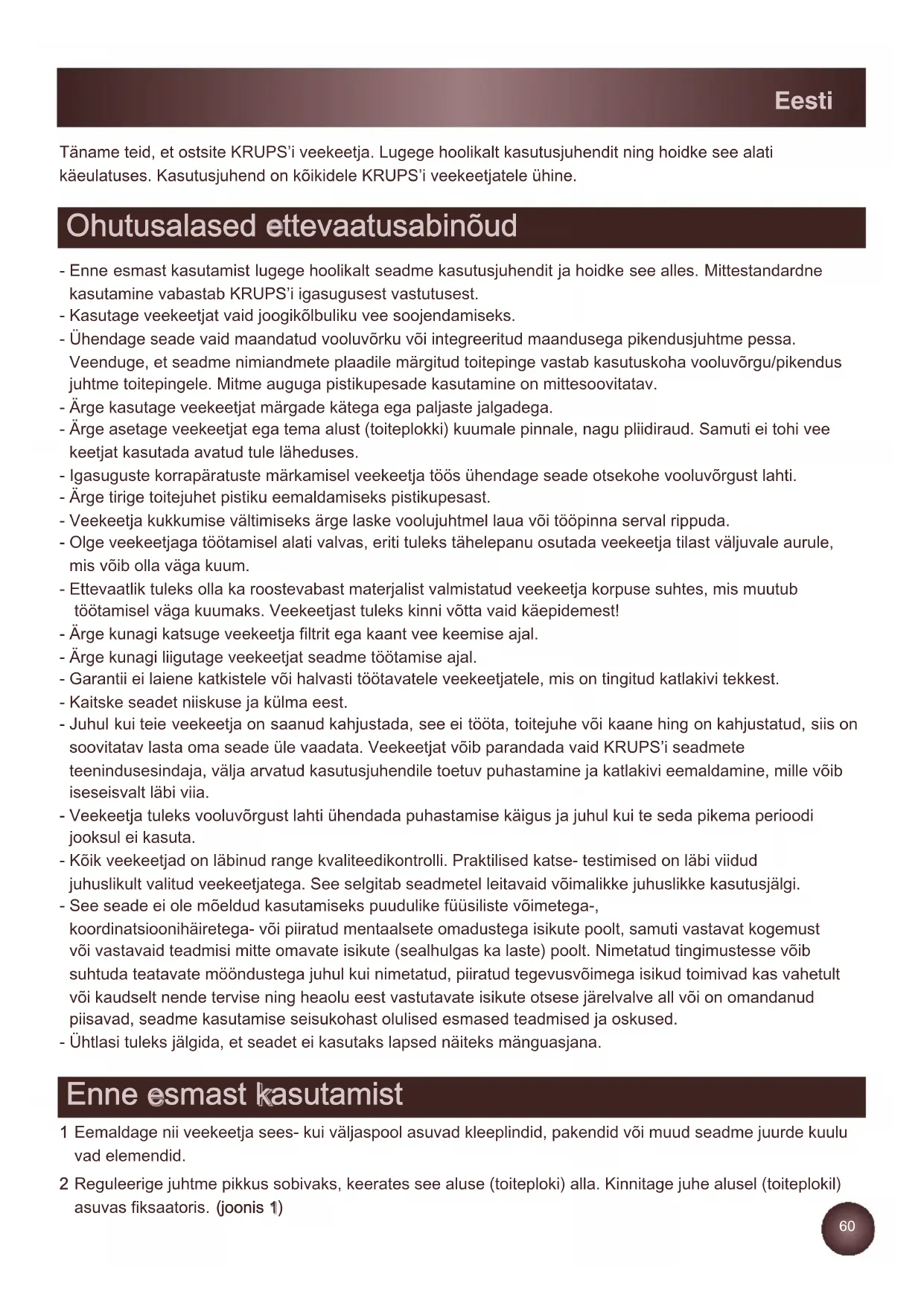 Täname teid, et ostsite KRUPS’i veekeetja. Lugege hoolikalt kasutusjuhendit ning hoidke see alati käeulatuses. Kasutusjuhend on kõikidele KRUPS’i veekeetjatele ühine. - Enne esmast kasutamist lugege hoolikalt seadme kasutusjuhendit ja hoidke see alles. Mittestandardne kasutamine vabastab KRUPS’i igasugusest vastutusest. - Kasutage veekeetjat vaid joogikõlbuliku vee soojendamiseks. - Ühendage seade vaid maandatud vooluvõrku või integreeritud maandusega pikendusjuhtme pessa. Veenduge, et seadme nimiandmete plaadile märgitud toitepinge vastab kasutuskoha vooluvõrgu/pikendus juhtme toitepingele. Mitme auguga pistikupesade kasutamine on mittesoovitatav. - Ärge kasutage veekeetjat märgade kätega ega paljaste jalgadega. - Ärge asetage veekeetjat ega tema alust (toiteplokki) kuumale pinnale, nagu pliidiraud. Samuti ei tohi vee keetjat kasutada avatud tule läheduses. - Igasuguste korrapäratuste märkamisel veekeetja töös ühendage seade otsekohe vooluvõrgust lahti. - Ärge tirige toitejuhet pistiku eemaldamiseks pistikupesast. - Veekeetja kukkumise vältimiseks ärge laske voolujuhtmel laua või tööpinna serval rippuda. - Olge veekeetjaga töötamisel alati valvas, eriti tuleks tähelepanu osutada veekeetja tilast väljuvale aurule, mis võib olla väga kuum. - Ettevaatlik tuleks olla ka roostevabast materjalist valmistatud veekeetja korpuse suhtes, mis muutub töötamisel väga kuumaks. Veekeetjast tuleks kinni võtta vaid käepidemest! - Ärge kunagi katsuge veekeetja filtrit ega kaant vee keemise ajal. - Ärge kunagi liigutage veekeetjat seadme töötamise ajal. - Garantii ei laiene katkistele või halvasti töötavatele veekeetjatele, mis on tingitud katlakivi tekkest. - Kaitske seadet niiskuse ja külma eest. - Juhul kui teie veekeetja on saanud kahjustada, see ei tööta, toitejuhe või kaane hing on kahjustatud, siis on soovitatav lasta oma seade üle vaadata. Veekeetjat võib parandada vaid KRUPS’i seadmete teenindusesindaja, välja arvatud kasutusjuhendile toetuv puhastamine ja katlakivi eemaldamine, mille võib iseseisvalt läbi viia. - Veekeetja tuleks vooluvõrgust lahti ühendada puhastamise käigus ja juhul kui te seda pikema perioodi jooksul ei kasuta. - Kõik veekeetjad on läbinud range kvaliteedikontrolli. Praktilised katse- testimised on läbi viidud juhuslikult valitud veekeetjatega. See selgitab seadmetel leitavaid võimalikke juhuslikke kasutusjälgi. - See seade ei ole mõeldud kasutamiseks puudulike füüsiliste võimetega-, koordinatsioonihäiretega- või piiratud mentaalsete omadustega isikute poolt, samuti vastavat kogemust või vastavaid teadmisi mitte omavate isikute (sealhulgas ka laste) poolt. Nimetatud tingimustesse võib suhtuda teatavate mööndustega juhul kui nimetatud, piiratud tegevusvõimega isikud toimivad kas vahetult või kaudselt nende tervise ning heaolu eest vastutavate isikute otsese järelvalve all või on omandanud piisavad, seadme kasutamise seisukohast olulised esmased teadmised ja oskused. - Ühtlasi tuleks jälgida, et seadet ei kasutaks lapsed näiteks mänguasjana.