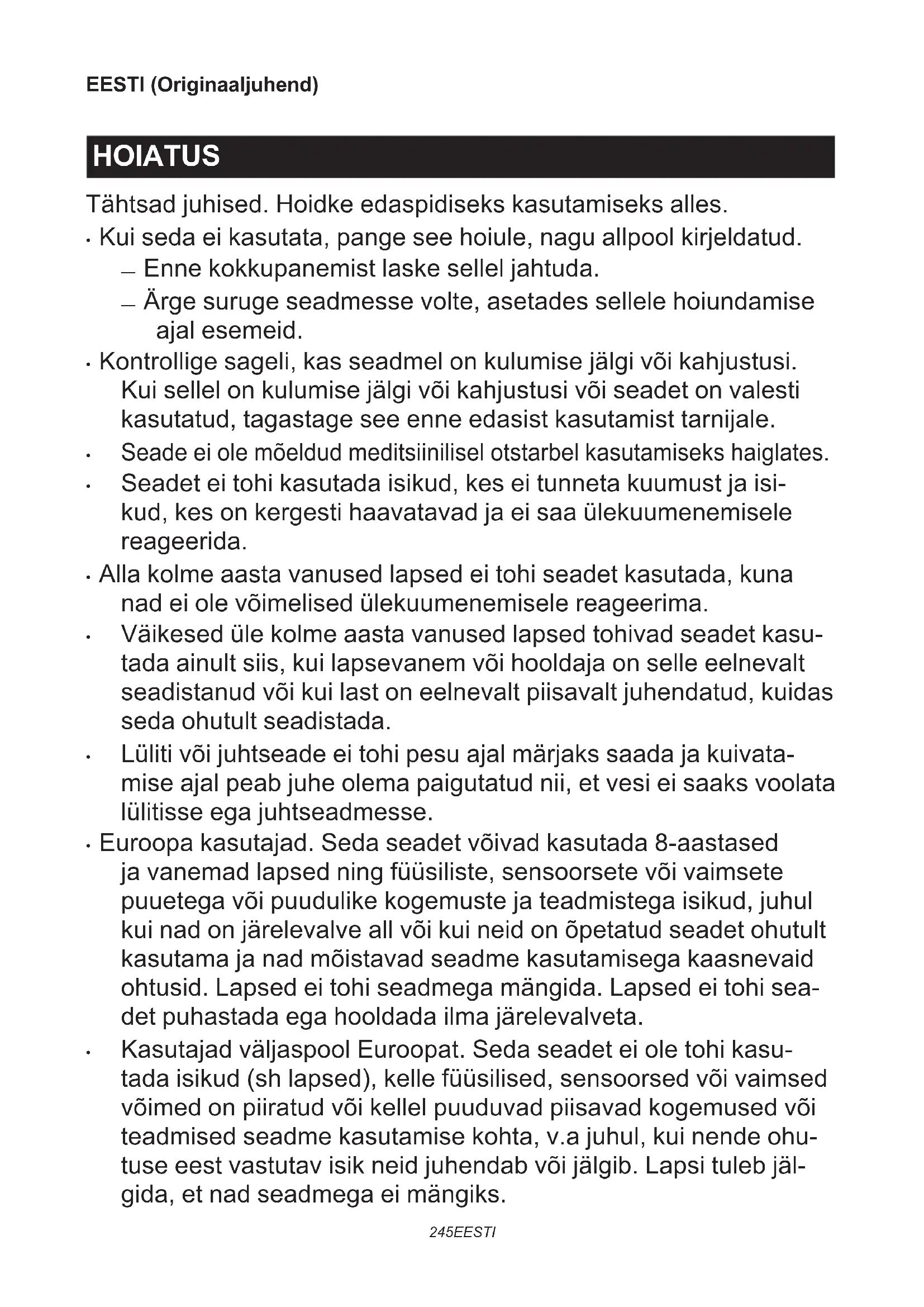 - Kasutajad väljaspool Euroopat. Seda seadet ei ole tohi kasu- tada isikud (sh lapsed), kelle füüsilised, sensoorsed või vaimsed võimed on piiratud või kellel puuduvad piisavad kogemused või teadmised seadme kasutamise kohta, v.a juhul, kui nende ohu- tuse eest vastutav isik neid juhendab või jälgib. Lapsi tuleb jäl- gida, et nad seadmega ei mängiks.246 EESTI