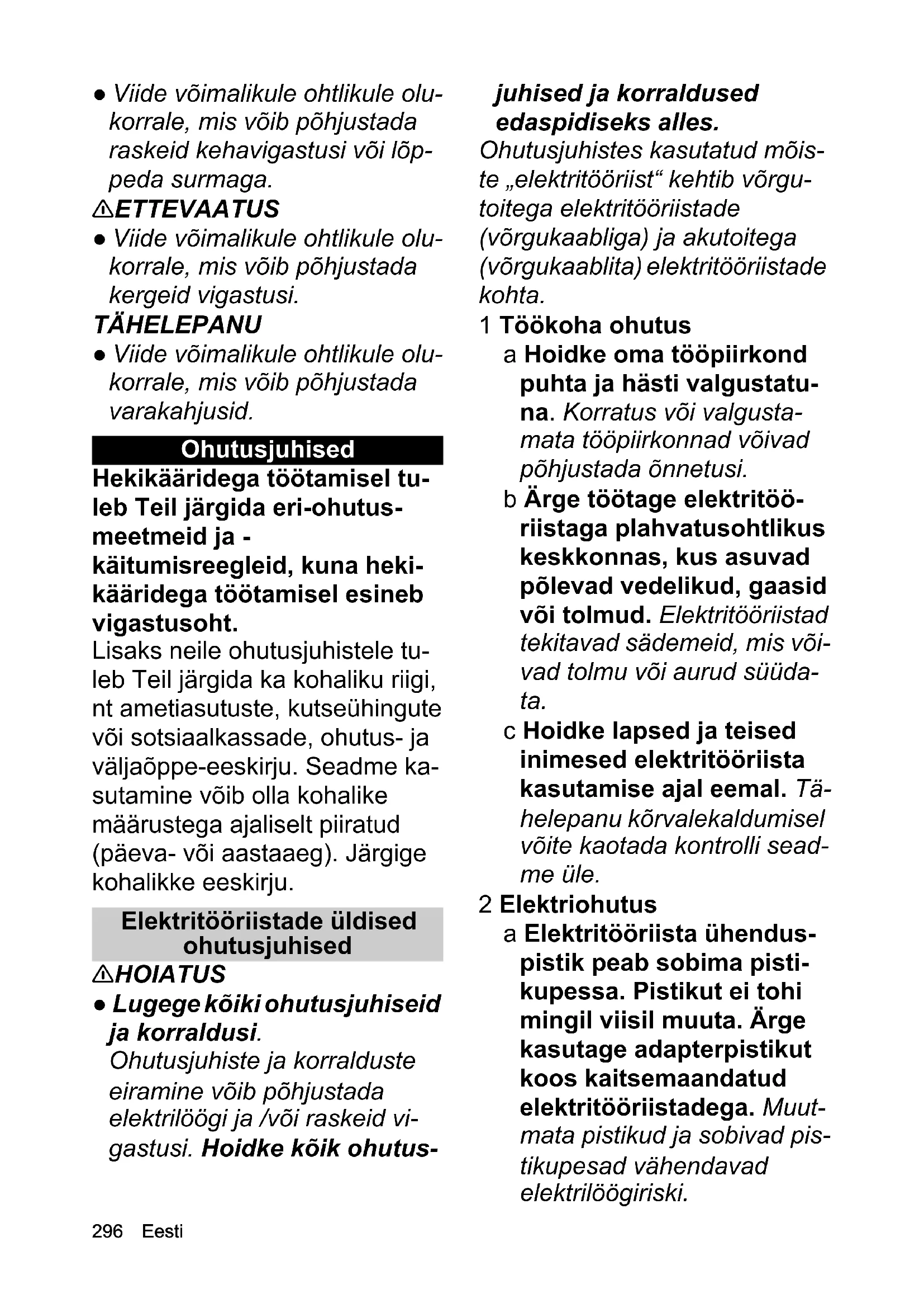 - EL vastavusdeklaratsioon 96 Eesti ● Viide võimalikule ohtlikule olu- korrale, mis võib põhjustada raskeid kehavigastusi või lõp- peda surmaga. 몇 ETTEVAATUS ● Viide võimalikule ohtlikule olu- korrale, mis võib põhjustada kergeid vigastusi. TÄHELEPANU ● Viide võimalikule ohtlikule olu- korrale, mis võib põhjustada varakahjusid. Ohutusjuhised Hekikääridega töötamisel tu- leb Teil järgida eri-ohutus- meetmeid ja - käitumisreegleid, kuna heki- kääridega töötamisel esineb vigastusoht. Lisaks neile ohutusjuhistele tu- leb Teil järgida ka kohaliku riigi, nt ametiasutuste, kutseühingute või sotsiaalkassade, ohutus- ja väljaõppe-eeskirju. Seadme ka- sutamine võib olla kohalike määrustega ajaliselt piiratud (päeva- või aastaaeg). Järgige kohalikke eeskirju. Elektritööriistade üldised ohutusjuhised 몇 HOIATUS ● Lugege kõiki ohutusjuhiseid ja korraldusi. Ohutusjuhiste ja korralduste eiramine võib põhjustada elektrilöögi ja /või raskeid vi- gastusi. Hoidke kõik ohutus- juhised ja korraldused edaspidiseks alles. Ohutusjuhistes kasutatud mõis- te „elektritööriist“ kehtib võrgu- toitega elektritööriistade (võrgukaabliga) ja akutoitega (võrgukaablita) elektritööriistade kohta. 1 Töökoha ohutus a Hoidke oma tööpiirkond puhta ja hästi valgustatu- na. Korratus või valgusta- mata tööpiirkonnad võivad põhjustada õnnetusi. b Ärge töötage elektritöö- riistaga plahvatusohtlikus keskkonnas, kus asuvad põlevad vedelikud, gaasid või tolmud. Elektritööriistad tekitavad sädemeid, mis või- vad tolmu või aurud süüda- ta. c Hoidke lapsed ja teised inimesed elektritööriista kasutamise ajal eemal. Tä- helepanu kõrvalekaldumisel võite kaotada kontrolli sead- me üle. 2 Elektriohutus a Elektritööriista ühendus- pistik peab sobima pisti- kupessa. Pistikut ei tohi mingil viisil muuta. Ärge kasutage adapterpistikut koos kaitsemaandatud elektritööriistadega. Muut- mata pistikud ja sobivad pis- tikupesad vähendavad elektrilöögiriski.Eesti 297 b Vältige kehalist kontakti maandatud pealispindade nagu torude, küttesüstee- mide, pliitide ja külmikute- ga. Kui Teie keha on maandatud, esineb kõrge- nenud risk elektrilöögi tõttu. c Hoidke elektritööriistad vihmast või niiskusest ee- mal. Vee tungimine elektri- tööriista sisse suurendab elektrilöögiriski. d Ärge väärtarvitage kaablit elektritööriista kandmi- seks, ülesriputamiseks või pistiku väljatõmbamiseks pistikupesast. Hoidke kaablit eemal kuumusest, õlist, teravatest servadest või liikuvatest sead- meosadest. Kahjustatud või sassiläinud ühenduskaablid suurendavad elektrilöögiris- ki. e Töötades elektritööriista- ga välitingimustes, kasu- tage ainult pikenduskaableid, mis on ka välipiirkonna jaoks so- bivad. Välipiirkonna jaoks sobiliku pikenduskaabli ka- sutamine vähendab elektri- löögiriski. f Kui elektritööriista käita- mine niiskes ümbruses on vältimatu, kasutage rikke- voolu kaitselülitit. Rikke- voolu kaitselüliti kasutamine vähendab elektrilöögiriski. 3 Inimeste ohutus a Olge tähelepanelik, jälgi- ge, mida Te teete ja käitu- ge elektritööriistaga töötamisel mõistlikult. Är- ge kasutage elektritööriis- ta, kui olete väsinud või uimastite, alkoholi või ra- vimite mõju all. Üks tähele- panematuse hetk elektritööriista kasutamisel võib põhjustada tõsiseid vi- gastusi. b Kandke isiklikku kaitseva- rustust ja alati kaitseprille. Isikliku kaitsevarustuse na- gu tolmumaski, libisemis- kindlate turvajalatsite, kaitsekiivri või kuulmiskait- sevahendite kandmine, ole- nevalt elektritööriista liigist ja kasutamisest, vähendab vi- gastuseriski. c Vältige tahtmatut käiku- võtmist. Veenduge, et elektritööriist on välja lüli- tatud, enne kui Te selle voolutoite ja/või aku külge ühendate, vastu võtate või seda kannate. Kui Teil on elektritööriista kandmisel sõrm lülitil või kui ühendate seadme sisselülitatud sei- sundis voolutoitega, võib see põhjustada õnnetusjuh- tumeid. d Eemaldage seadistustöö- riistad või kruvivõtmed en- ne elektritööriista298 Eesti sisselülitamist. Pöörleval seadmeosal asuv tööriist või võti võib põhjustada vigastu- si. e Vältige ebanormaalset ke- hahoidu. Hoolitsege kind- la seisuasendi eest ja hoidke igal ajal tasakaalu. Nii saate elektritööriista oo- tamatutes olukordades pa- remini kontrollida. f Kandke sobivat riietust. Ärge kandke avarat riie- tust ega ehteid. Hoidke juuksed, riided ja kindad liikuvatest osadest eemal. Liikuvad osad võivad lahtis- test riietest, kinnastest, ehe- test või pikkadest juustest kinni haarata. g Kui tolmuimemis- ja -ko- gumisseadiseid saab monteerida, siis veendu- ge, et need on ühendatud ja neid kasutatakse õiges- ti. Tolmuimemistoru kasuta- mine võib vähendada tolmust tingitud ohte. 4 Elektritööriista kasutamine ja käsitsemine a Ärge koormake seadet üle. Kasutage oma tööks sel- leks ettenähtud elektritöö- riista. Sobiva elektritööriistaga töötate Te paremini ja ohutumalt esita- tud võimsusvahemikus. b Ärge kasutage elektritöö- riista, mille lüliti on defekt- ne. Elektritööriist, mida ei saa enam sisse või välja lüli- tada, on ohtlik ja seda tuleb remontida. c Enne seadme seadistuste tegemist, tarvikuosade va- hetamist või seadme ära- panekut tõmmake pistik pistikupesast välja ja/või eemaldage aku. See ette- vaatusabinõu hoiab ära elektritööriista tahtmatu käi- vitamise. d Hoidke kasutamata elektri- tööriistu lastele kättesaa- matus kohas. Ärge laske seadet kasutada inimestel, kes pole sellega tuttavad või kes pole lugenud käes- olevaid korraldusi. Elektri- tööriistad on ohtlikud, kui neid kasutavad kogenema- tud inimesed. e Hoolitsege elektritööriista- de eest hästi. Kontrollige, kas liikuvad osad talitle- vad laitmatult ega kiilu kin- ni, ega osad pole purunenud või nii kahjus- tatud, et elektritööriista ta- litlus on piiratud. Laske kahjustatud osad enne se