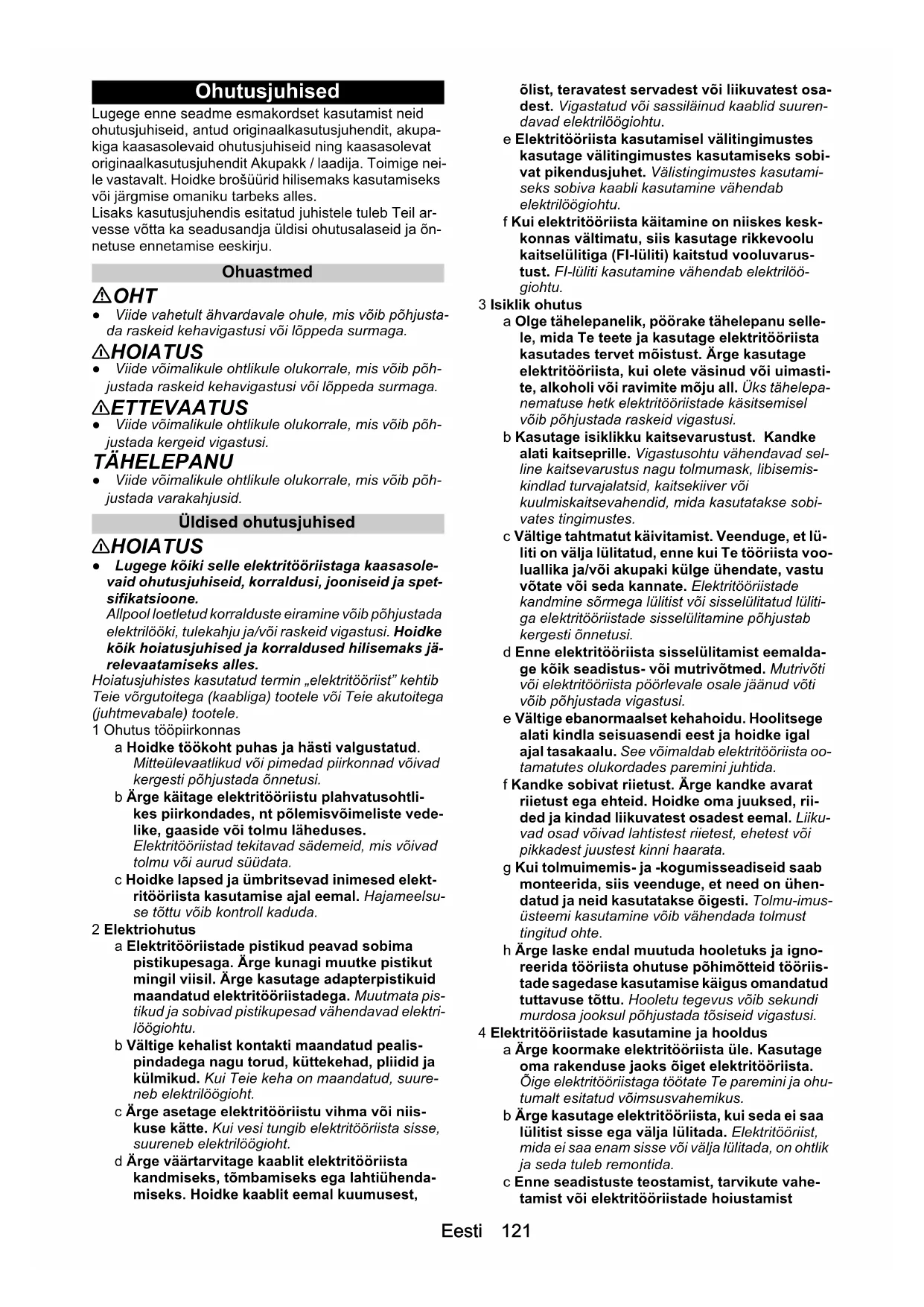 - Tehnilised andmed Eesti 121 Ohutusjuhised Lugege enne seadme esmakordset kasutamist neid ohutusjuhiseid, antud originaalkasutusjuhendit, akupa- kiga kaasasolevaid ohutusjuhiseid ning kaasasolevat originaalkasutusjuhendit Akupakk / laadija. Toimige nei- le vastavalt. Hoidke brošüürid hilisemaks kasutamiseks või järgmise omaniku tarbeks alles. Lisaks kasutusjuhendis esitatud juhistele tuleb Teil ar- vesse võtta ka seadusandja üldisi ohutusalaseid ja õn- netuse ennetamise eeskirju. Ohuastmed OHT ● Viide vahetult ähvardavale ohule, mis võib põhjusta- da raskeid kehavigastusi või lõppeda surmaga. 몇 HOIATUS ● Viide võimalikule ohtlikule olukorrale, mis võib põh- justada raskeid kehavigastusi või lõppeda surmaga. 몇 ETTEVAATUS ● Viide võimalikule ohtlikule olukorrale, mis võib põh- justada kergeid vigastusi. TÄHELEPANU ● Viide võimalikule ohtlikule olukorrale, mis võib põh- justada varakahjusid. Üldised ohutusjuhised 몇 HOIATUS ● Lugege kõiki selle elektritööriistaga kaasasole- vaid ohutusjuhiseid, korraldusi, jooniseid ja spet- sifikatsioone. Allpool loetletud korralduste eiramine võib põhjustada elektrilööki, tulekahju ja/või raskeid vigastusi. Hoidke kõik hoiatusjuhised ja korraldused hilisemaks jä- relevaatamiseks alles. Hoiatusjuhistes kasutatud termin „elektritööriist” kehtib Teie võrgutoitega (kaabliga) tootele või Teie akutoitega (juhtmevabale) tootele. 1 Ohutus tööpiirkonnas a Hoidke töökoht puhas ja hästi valgustatud. Mitteülevaatlikud või pimedad piirkonnad võivad kergesti põhjustada õnnetusi. b Ärge käitage elektritööriistu plahvatusohtli- kes piirkondades, nt põlemisvõimeliste vede- like, gaaside või tolmu läheduses. Elektritööriistad tekitavad sädemeid, mis võivad tolmu või aurud süüdata. c Hoidke lapsed ja ümbritsevad inimesed elekt- ritööriista kasutamise ajal eemal. Hajameelsu- se tõttu võib kontroll kaduda. 2 Elektriohutus a Elektritööriistade pistikud peavad sobima pistikupesaga. Ärge kunagi muutke pistikut mingil viisil. Ärge kasutage adapterpistikuid maandatud elektritööriistadega. Muutmata pis- tikud ja sobivad pistikupesad vähendavad elektri- löögiohtu. b Vältige kehalist kontakti maandatud pealis- pindadega nagu torud, küttekehad, pliidid ja külmikud. Kui Teie keha on maandatud, suure- neb elektrilöögioht. c Ärge asetage elektritööriistu vihma või niis- kuse kätte. Kui vesi tungib elektritööriista sisse, suureneb elektrilöögioht. d Ärge väärtarvitage kaablit elektritööriista kandmiseks, tõmbamiseks ega lahtiühenda- miseks. Hoidke kaablit eemal kuumusest, õlist, teravatest servadest või liikuvatest osa- dest. Vigastatud või sassiläinud kaablid suuren- davad elektrilöögiohtu. e Elektritööriista kasutamisel välitingimustes kasutage välitingimustes kasutamiseks sobi- vat pikendusjuhet. Välistingimustes kasutami- seks sobiva kaabli kasutamine vähendab elektrilöögiohtu. f Kui elektritööriista käitamine on niiskes kesk- konnas vältimatu, siis kasutage rikkevoolu kaitselülitiga (FI-lüliti) kaitstud vooluvarus- tust. FI-lüliti kasutamine vähendab elektrilöö- giohtu. 3 Isiklik ohutus a Olge tähelepanelik, pöörake tähelepanu selle- le, mida Te teete ja kasutage elektritööriista kasutades tervet mõistust. Ärge kasutage elektritööriista, kui olete väsinud või uimasti- te, alkoholi või ravimite mõju all. Üks tähelepa- nematuse hetk elektritööriistade käsitsemisel võib põhjustada raskeid vigastusi. b Kasutage isiklikku kaitsevarustust. Kandke alati kaitseprille. Vigastusohtu vähendavad sel- line kaitsevarustus nagu tolmumask, libisemis- kindlad turvajalatsid, kaitsekiiver või kuulmiskaitsevahendid, mida kasutatakse sobi- vates tingimustes. c Vältige tahtmatut käivitamist. Veenduge, et lü- liti on välja lülitatud, enne kui Te tööriista voo- luallika ja/või akupaki külge ühendate, vastu võtate või seda kannate. Elektritööriistade kandmine sõrmega lülitist või sisselülitatud lüliti- ga elektritööriistade sisselülitamine põhjustab kergesti õnnetusi. d Enne elektritööriista sisselülitamist eemalda- ge kõik seadistus- või mutrivõtmed. Mutrivõti või elektritööriista pöörlevale osale jäänud võti võib põhjustada vigastusi. e Vältige ebanormaalset kehahoidu. Hoolitsege alati kindla seisuasendi eest ja hoidke igal ajal tasakaalu. See võimaldab elektritööriista oo- tamatutes olukordades paremini juhtida. f Kandke sobivat riietust. Ärge kandke avarat riietust ega ehteid. Hoidke oma juuksed, rii- ded ja kindad liikuvatest osadest eemal. Liiku- vad osad võivad lahtistest riietest, ehetest või pikkadest juustest kinni haarata. g Kui tolmuimemis- ja -kogumisseadiseid saab monteerida, siis veenduge, et need on ühen- datud ja neid kasutatakse õigesti. Tolmu-imus- üsteemi kasutamine võib vähendada tolmust tingitud ohte. h Ärge laske endal muutuda hooletuks ja igno- reerida tööriista ohutuse põhimõtteid tööriis- tade sagedase kasutamise käigus omandatud tuttavuse tõttu. Hooletu tegevus võib sekundi murdosa jooksul põhjustada tõsiseid vigastusi. 4 Elektritööriistade kasutamine ja hooldus a Ärge koormake elektritööriista üle. Kasutage oma rakenduse jaoks õiget elektritööriista. Õige elektritööriistaga töötate Te paremini ja ohu- tumalt esitatud võimsusvahemikus. b Ärge kasutage elektritööriista, kui seda ei saa lülitist sisse ega välja lülitada. Elektritööriist, mida ei saa enam sisse või välja lülitada, on ohtlik ja seda tuleb remontida. c Enne seadistuste teostamist, tarvikute vahe- tamist või elektritööriistade hoiustamist122 Eesti ühendage pistik vooluallikast lahti ja/või ee- maldage elektritööriistast akupakk, kui see on eemaldatav. Need ennetavad ohutusmeetmed vähendavad elektritööriista tahtmatu käivitumise ohtu. d Hoidke kasutamata elektritööriistu lastele kät- tesaamatus kohas ja ärge lubage elektritöö- riista käsitseda inimest