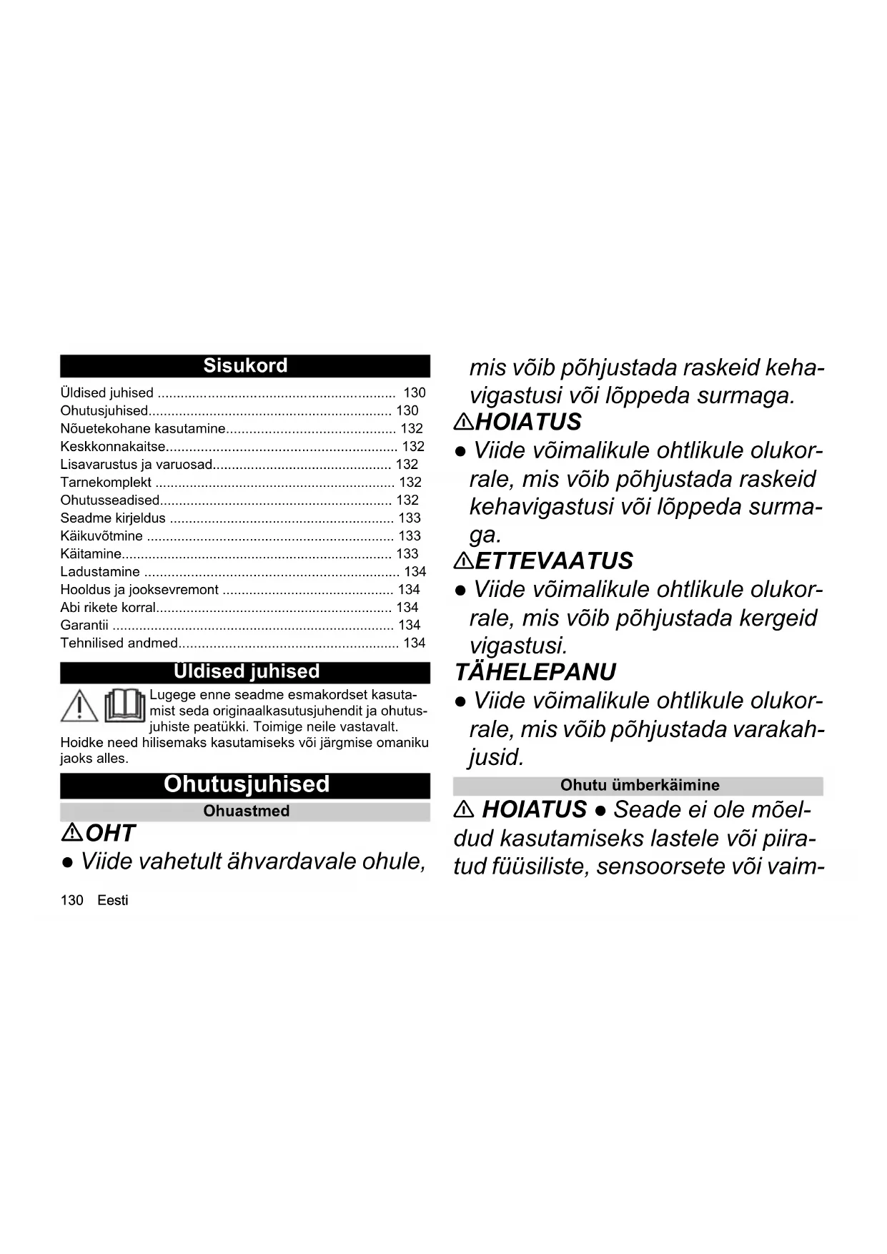 - dB(A) 68130 Eesti Sisukord Üldised juhised Lugege enne seadme esmakordset kasuta- mist seda originaalkasutusjuhendit ja ohutus- juhiste peatükki. Toimige neile vastavalt. Hoidke need hilisemaks kasutamiseks või järgmise omaniku jaoks alles. Ohutusjuhised Ohuastmed OHT ● Viide vahetult ähvardavale ohule, mis võib põhjustada raskeid keha- vigastusi või lõppeda surmaga. 몇 HOIATUS ● Viide võimalikule ohtlikule olukor- rale, mis võib põhjustada raskeid kehavigastusi või lõppeda surma- ga. 몇 ETTEVAATUS ● Viide võimalikule ohtlikule olukor- rale, mis võib põhjustada kergeid vigastusi. TÄHELEPANU ● Viide võimalikule ohtlikule olukor- rale, mis võib põhjustada varakah- jusid. Ohutu ümberkäimine 몇 HOIATUS ● Seade ei ole mõel- dud kasutamiseks lastele või piira- tud füüsiliste, sensoorsete või vaim- Üldised juhised p. 130