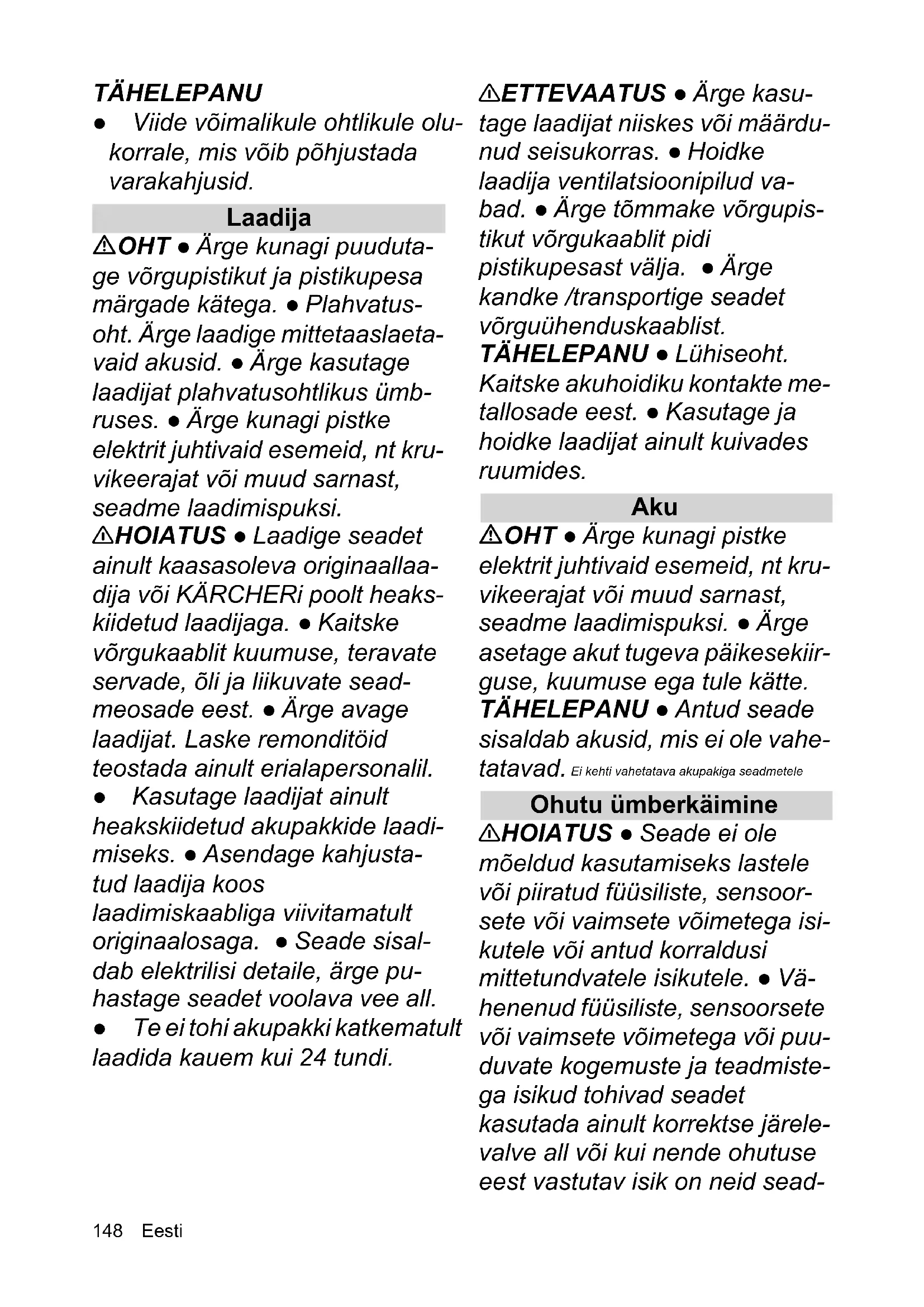 - EL vastavusdeklaratsioon (HVWL TÄHELEPANU ● Viide võimalikule ohtlikule olu- korrale, mis võib põhjustada varakahjusid. Laadija OHT ● Ärge kunagi puuduta- ge võrgupistikut ja pistikupesa märgade kätega. ● Plahvatus- oht. Ärge laadige mittetaaslaeta- vaid akusid. ● Ärge kasutage laadijat plahvatusohtlikus ümb- ruses. ● Ärge kunagi pistke elektrit juhtivaid esemeid, nt kru- vikeerajat või muud sarnast, seadme laadimispuksi. 몇 HOIATUS ● Laadige seadet ainult kaasasoleva originaallaa- dija või KÄRCHERi poolt heaks- kiidetud laadijaga. ● Kaitske võrgukaablit kuumuse, teravate servade, õli ja liikuvate sead- meosade eest. ● Ärge avage laadijat. Laske remonditöid teostada ainult erialapersonalil. ● Kasutage laadijat ainult heakskiidetud akupakkide laadi- miseks. ● Asendage kahjusta- tud laadija koos laadimiskaabliga viivitamatult originaalosaga. ● Seade sisal- dab elektrilisi detaile, ärge pu- hastage seadet voolava vee all. ● Te ei tohi akupakki katkematult laadida kauem kui 24 tundi. 몇 ETTEVAATUS ● Ärge kasu- tage laadijat niiskes või määrdu- nud seisukorras. ● Hoidke laadija ventilatsioonipilud va- bad. ● Ärge tõmmake võrgupis- tikut võrgukaablit pidi pistikupesast välja. ● Ärge kandke /transportige seadet võrguühenduskaablist. TÄHELEPANU ● Lühiseoht. Kaitske akuhoidiku kontakte me- tallosade eest. ● Kasutage ja hoidke laadijat ainult kuivades ruumides. Aku OHT ● Ärge kunagi pistke elektrit juhtivaid esemeid, nt kru- vikeerajat või muud sarnast, seadme laadimispuksi. ● Ärge asetage akut tugeva päikesekiir- guse, kuumuse ega tule kätte. TÄHELEPANU ● Antud seade sisaldab akusid, mis ei ole vahe- tatavad. Ei kehti vahetatava akupakiga seadmetele Ohutu ümberkäimine 몇 HOIATUS ● Seade ei ole mõeldud kasutamiseks lastele või piiratud füüsiliste, sensoor- sete või vaimsete võimetega isi- kutele või antud korraldusi mittetundvatele isikutele. ● Vä- henenud füüsiliste, sensoorsete või vaimsete võimetega või puu- duvate kogemuste ja teadmiste- ga isikud tohivad seadet kasutada ainult korrektse järele- valve all või kui nende ohutuse eest vastutav isik on neid sead-(HVWL me ohutu kasutamise osas ju- hendanud ning nad on aru saanud sellest tulenevatest oh- tudest. ● Lapsed ei tohi sead- mega mängida. ● Teostage laste üle järelevalvet kindlusta- maks, et nad seadmega ei män- gi. ● Kasutage seadet ainult sihtotstarbeliselt. Võtke arvesse kohalikke asjaolusid ning pidage seadmega töötamisel silmas kolmandaid isikuid, eelkõige lapsi. ● Järgige ohupiirkonda- des (nt tanklates) vastavaid ohu- tuseeskirju. Ärge kunagi käitage seadet plahvatusohtlikes ruumi- des. ● Ärge pihustage esemete- le, mis sisaldavad tervist ohustavaid aineid (nt asbesti). ● Vigastusoht. Ärge suunake pi- serdusjuga silmadele. 몇 ETTEVAATUS ● Ärge kasu- tage seadet, kui see on eelne- valt alla kukkunud, nähtavalt kahjustatud või lekib. ● Käitage või ladustage seadet ainult vas- tavalt kirjeldusele või joonisele. ● Ärge jätke seadet kunagi järe- levalveta, kui see on käituses. ● Kindla seisuasendi tagami- seks pange seade seisma tuge- vale tasasele aluspinnale. ● Õnnetusjuhtumid või kahjustu- sed seadme ümberkukkumise tõttu. Te peate enne kõiki tege- vusi seadmega või seadmel loo- ma seisustabiilsuse. TÄHELEPANU ● Ärge lisage puhastusvahendeid või teisi li- sandeid. ● Seadme kahjustus. Ärge kunagi lisage veepaaki la- husteid, lahustisisaldusega ve- delikke või lahjendamata happeid (nt puhastusvahendeid, bensiini, värvivedeldit ja atse- tooni). ● Kuivalt töötamisest tin- gitud seadmekahjustus. Lülitage seade sisse ainult siis, kui vee- paagis on vett. ● Ärge käitage seadet temperatuuridel alla 0 °C. Nõuetekohane kasutamine Kasutage madalsurvepesurit ainult eramajapidamises. Madalsurvepesur on mõeldud masinate, sõidukite, töö- riistade, fassaadide, terrasside, aiaseadmete, koduloo- made jne puhastamiseks madalsurve-veejoaga ilma puhastusaineid lisamata. Keskkonnakaitse Pakkematerjalid on taaskasutatavad. Palun utili- seerige pakendid keskkonnasäästlikult. Elektrilised ja elektroonilised seadmed sisalda- vad väärtuslikke taaskasutatavaid materjale ja sageli koostisosi nagu patareid, akud või õli, mis võivad vale ümberkäimise või vale utiliseerimise korral kujutada potentsiaalset ohtu inimeste tervisele ja keskkonnale. Seadme nõuetekohaseks käitamiseks on neid koostisosi siiski vaja. Selle sümboliga tähistatud seadmeid ei tohi utiliseerida koos olmeprügiga. Puhastustöid, mille puhul tekib õlisisaldusega heit- vesi, nt mootoripesu, aluspõranda pesu, tohib teos- tada ainult õliseparaatoriga pesuplatsidel. Puhastusvahenditega töid tohib teostada ainult ve- delikutihedatel, musta vee kanalisatsiooniga ühen- datud tööpindadel. Ärge laske puhastusvahendil tungida veekogudesse või mulda. Vee võtmine avalikest veekogudest ei ole mõnes riigis lubatud. Juhised koostisainete kohta (REACH) Aktuaalse info koostisainete kohta leiate aadressilt: www.kaercher.de/REACH Lisavarustus ja varuosad Kasutage ainult originaaltarvikuid ja originaalvaruosi, mis tagavad seadme ohutu ja tõrgeteta käituse. Tarvikute ja varuosade kohta leiate teavet aadressilt www.kaercher.com. (HVWL Tarnekomplekt Seadme tarnekomplekt on kujutatud pakendil. Lahtipak- kimisel kontrollige, kas pakendi sisu on täielik. Puudu- olevate tarvikute või transpordikahjustuste korral teavitage oma edasimüüjat. Ohutusseadised 몇 ETTEVAATUS Puuduvad või muudetud ohutusseadised Ohutusseadised on ette nähtud Teie kaitseks. Ärge kunagi muutke või hiilige kõrvale ohutusseadis- test. Seadmelüliti Seadmelüliti hoiab ära seadme tahtmatu käitamise. Rõhulüliti Kui käsipihustuspüstolil asuv hoob lahti lastakse, lülitab survelüliti pumba välja ja madalsurvejuga katkeb. Hoo- va vajutamisel lülitub pump jälle sisse. Mootorikaitselüliti Liiga suure voolutarbe korral lülitab mooto