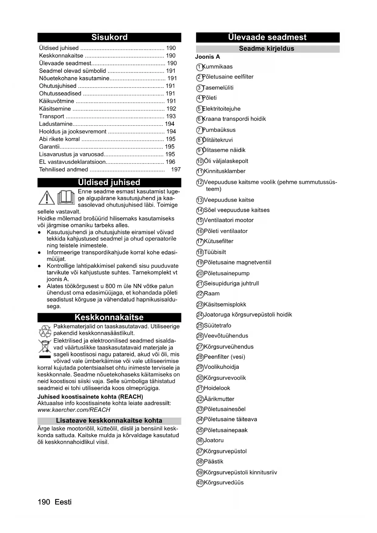 - 1,5190 Eesti Sisukord Üldised juhised Enne seadme esmast kasutamist luge- ge algupärane kasutusjuhend ja kaa- sasolevad ohutusjuhised läbi. Toimige sellele vastavalt. Hoidke mõlemad brošüürid hilisemaks kasutamiseks või järgmise omaniku tarbeks alles. ● Kasutusjuhendi ja ohutusjuhiste eiramisel võivad tekkida kahjustused seadmel ja ohud operaatorile ning teistele inimestele. ● Informeerige transpordikahjude korral kohe edasi- müüjat. ● Kontrollige lahtipakkimisel pakendi sisu puuduvate tarvikute või kahjustuste suhtes. Tarnekomplekt vt joonis A. ● Alates töökõrgusest u 800 m üle NN võtke palun ühendust oma edasimüüjaga, et kohandada põleti seadistust kõrguse ja vähendatud hapnikusisaldu- sega. Keskkonnakaitse Pakkematerjalid on taaskasutatavad. Utiliseerige pakendid keskkonnasäästlikult. Elektrilised ja elektroonilised seadmed sisalda- vad väärtuslikke taaskasutatavaid materjale ja sageli koostisosi nagu patareid, akud või õli, mis võivad vale ümberkäimise või vale utiliseerimise korral kujutada potentsiaalset ohtu inimeste tervisele ja keskkonnale. Seadme nõuetekohaseks käitamiseks on neid koostisosi siiski vaja. Selle sümboliga tähistatud seadmeid ei tohi utiliseerida koos olmeprügiga. Juhised koostisainete kohta (REACH) Aktuaalse info koostisainete kohta leiate aadressilt: www.kaercher.com/REACH Lisateave keskkonnakaitse kohta Ärge laske mootoriõlil, kütteõlil, diislil ja bensiinil kesk- konda sattuda. Kaitske mulda ja kõrvaldage kasutatud õli keskkonnahoidlikul viisil. Ülevaade seadmest Seadme kirjeldus Joonis A 1 Kummikaas 2 Põletusaine eelfilter 3 Tasemelüliti 4 Põleti 5 Elektritoitejuhe 6 Kraana transpordi hoidik 7 Pumbaüksus 8 Õlitäitekruvi 9 Õlitaseme näidik 10 Õli väljalaskepolt 11 Kinnitusklamber 12 Veepuuduse kaitsme voolik (pehme summutussüs- teem) 13 Veepuuduse kaitse 14 Sõel veepuuduse kaitses 15 Ventilaatori mootor 16 Põleti ventilaator 17 Kütusefilter 18 Tüübisilt 19 Põletusaine magnetventiil 20 Põletusainepump 21 Seisupiduriga juhtrull 22 Raam 23 Käsitsemisplokk 24 Joatoruga kõrgsurvepüstoli hoidik 25 Süütetrafo 26 Veevõtuühendus 27 Kõrgsurveühendus 28 Peenfilter (vesi) 29 Voolikuhoidja 30 Kõrgsurvevoolik 31 Hoidelook 32 Äärikmutter 33 Põletusainesõel 34 Põletusaine täiteava 35 Põletusainepaak 36 Joatoru 37 Kõrgsurvepüstol 38 Päästik 39 Kõrgsurvepüstoli kinnitusriiv 40 Kõrgsurvedüüs Üldised juhised p. 190