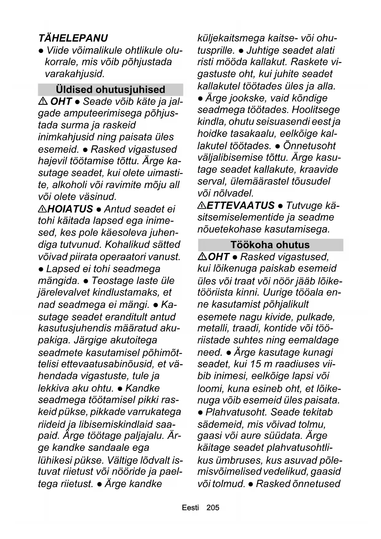 - EL vastavusdeklaratsioon Eesti 205 TÄHELEPANU ● Viide võimalikule ohtlikule olu- korrale, mis võib põhjustada varakahjusid. Üldised ohutusjuhised OHT ● Seade võib käte ja jal- gade amputeerimisega põhjus- tada surma ja raskeid inimkahjusid ning paisata üles esemeid. ● Rasked vigastused hajevil töötamise tõttu. Ärge ka- sutage seadet, kui olete uimasti- te, alkoholi või ravimite mõju all või olete väsinud. 몇 HOIATUS ● Antud seadet ei tohi käitada lapsed ega inime- sed, kes pole käesoleva juhen- diga tutvunud. Kohalikud sätted võivad piirata operaatori vanust. ● Lapsed ei tohi seadmega mängida. ● Teostage laste üle järelevalvet kindlustamaks, et nad seadmega ei mängi. ● Ka- sutage seadet eranditult antud kasutusjuhendis määratud aku- pakiga. Järgige akutoitega seadmete kasutamisel põhimõt- telisi ettevaatusabinõusid, et vä- hendada vigastuste, tule ja lekkiva aku ohtu. ● Kandke seadmega töötamisel pikki ras- keid pükse, pikkade varrukatega riideid ja libisemiskindlaid saa- paid. Ärge töötage paljajalu. Är- ge kandke sandaale ega lühikesi pükse. Vältige lõdvalt is- tuvat riietust või nööride ja pael- tega riietust. ● Ärge kandke küljekaitsmega kaitse- või ohu- tusprille. ● Juhtige seadet alati risti mööda kallakut. Raskete vi- gastuste oht, kui juhite seadet kallakutel töötades üles ja alla. ● Ärge jookske, vaid kõndige seadmega töötades. Hoolitsege kindla, ohutu seisuasendi eest ja hoidke tasakaalu, eelkõige kal- lakutel töötades. ● Õnnetusoht väljalibisemise tõttu. Ärge kasu- tage seadet kallakute, kraavide serval, ülemäärastel tõusudel või nõlvadel. 몇 ETTEVAATUS ● Tutvuge kä- sitsemiselementide ja seadme nõuetekohase kasutamisega. Töökoha ohutus OHT ● Rasked vigastused, kui lõikenuga paiskab esemeid üles või traat või nöör jääb lõike- tööriista kinni. Uurige tööala en- ne kasutamist põhjalikult esemete nagu kivide, pulkade, metalli, traadi, kontide või töö- riistade suhtes ning eemaldage need. ● Ärge kasutage kunagi seadet, kui 15 m raadiuses vii- bib inimesi, eelkõige lapsi või loomi, kuna esineb oht, et lõike- nuga võib esemeid üles paisata. ● Plahvatusoht. Seade tekitab sädemeid, mis võivad tolmu, gaasi või aure süüdata. Ärge käitage seadet plahvatusohtli- kus ümbruses, kus asuvad põle- misvõimelised vedelikud, gaasid või tolmud. ● Rasked õnnetused206 Eesti lastega. Lapsed võivad tunda end seadmest ja tegevusest kaasahaaratuna. Pidage silmas lapsi, kuna nad ei viibi tingimata seal, kus Te neid viimati nägite. 몇 HOIATUS ● Ärge kasutage seadet pikselöögiohu korral. ● Niitke alati päevavalguses või hea kunstliku valgustuse käes. ● Hoidke lapsed niitmispiirkon- nast eemal ja täiskasvanu järel- valve all, kes pole operaator, olge tähelepanelik ja lülitage seade välja, kui laps siseneb niitmispiirkonda. ● Olge ette- vaatlik, kui lähenete pimedatele nurkadele, põõsastele, puudele või objektidele, mis võivad vä- hendada Teie nähtavust. TÄHELEPANU ● Seadme ope- raator vastutab teiste isikute või nende omandiga aset leidnud õnnetuste eest. Ohutu käitamine OHT ● Tehke enne seadme iga kasutamist kindlaks, et nuga, noapoldid ja noaüksus ei ole ku- lunud ega kahjustatud. ● Ärge lukustage sisse-/ väljalülitit ku- nagi SISSE-positsioonis, see on väga ohtlik. ● Tõmmake seadet tagurpidi ainult siis, kui see on hädavajalik. Kui peate seadme seinast või takistusest eemale tõmbama, siis vaadake kõige- pealt alla, et vältida komistamist või seadmega üle jalgade sõit- mist. ● Oht sattuda kokkupuu- tesse katmata noaga või saada pihta ülespaisatud esemetega. Ärge kallutage seadet, kui käivi- tate mootori või mootor töötab. Kui kallutamine on hädavajalik, nt käivitamise lihtsustamiseks, võite Te seadme esikülge 5 cm üles tõsta. Selleks vajutage käe- pide ettevaatlikult alla. Enne niit- misprotsessiga alustamist peate viima seadme normaalsesse käituspositsiooni (st kõik neli ra- tast pinnasel). ● Noad, mis puu- tuvad kokku voolu juhtiva kaabliga, võivad panna seadme katmata metalliosad voolu alla ja põhjustada elektrilöögi. 몇 HOIATUS ● Seadme noad on teravad. Kandke tugevaid kait- sekindaid ja töötage monteeri- misel, väljavahetamisel, puhastamisel või poltide kinnitu- se kontrollimisel ettevaatlikult. ● Asendage kulunud või kahjus- tatud detailid komplektina, et säilitada balanssi. ● Tehke kind- laks, et seade on ohutus seisun- dis, kontrollides regulaarsete ajavahemike järel, kas poldid, mutrid ja kruvid on tugevalt kin- nikeeratud. ● Asendage kulunud või kahjustatud detailid enne seadme käikuvõtmist. ● Ärge käitage seadet kunagi, kui käe- pidemel asuv sisse-/ väljalüliti ei lülita nõuetekohaselt sisse või välja. ● Ärge käsitsege seadet toore jõuga. ● Peatage mootor nugade peatamiseks, kui trans-Eesti 207 pordite seadet niitmispiirkonda või sellest eemale või kui kallu- tate seadet murust erineva alus- pinna ületamisel. ● Peatage nuga enne kruusapindade ületa- mist. ● Ärge kasutage seadet kunagi defektsete kaitseseadis- tega või ilma kaitseseadisteta nagu nt eemalesuunajateta ja/ või rohupüüdekotita. ● Ärge hoidke oma käsi või jalgu pöör- levate detailide läheduses või all. Lülitage mootor vastavalt ju- hendile sisse. ● Ärge tõstke ega kandke seadet kunagi töötava mootori korral. ● Ebatasane maastik kätkeb endas kõrgen- datud libisemis- ja õnnetusohtu. Vältige auke, vagusid, ebata- sasusi, kive või muid peidetud objekte. ● Käivitage seade ainult siis, kui asute käepideme taga ohutus piirkonnas. Kõik neli ratast on pinnasel. Rohu väljaviskešaht ei ole avatud, vaid rohupüüdekoti või kaanega kaetud. Kõigi inimeste käed ja jalad on lõikekorpusest eemal. ● Lülitage mootor välja ja ee- maldage turvavõti. Tehke kind- laks, et kõik liikuvad detailid on täielikult peatatud: Alati, kui jätate seadme 