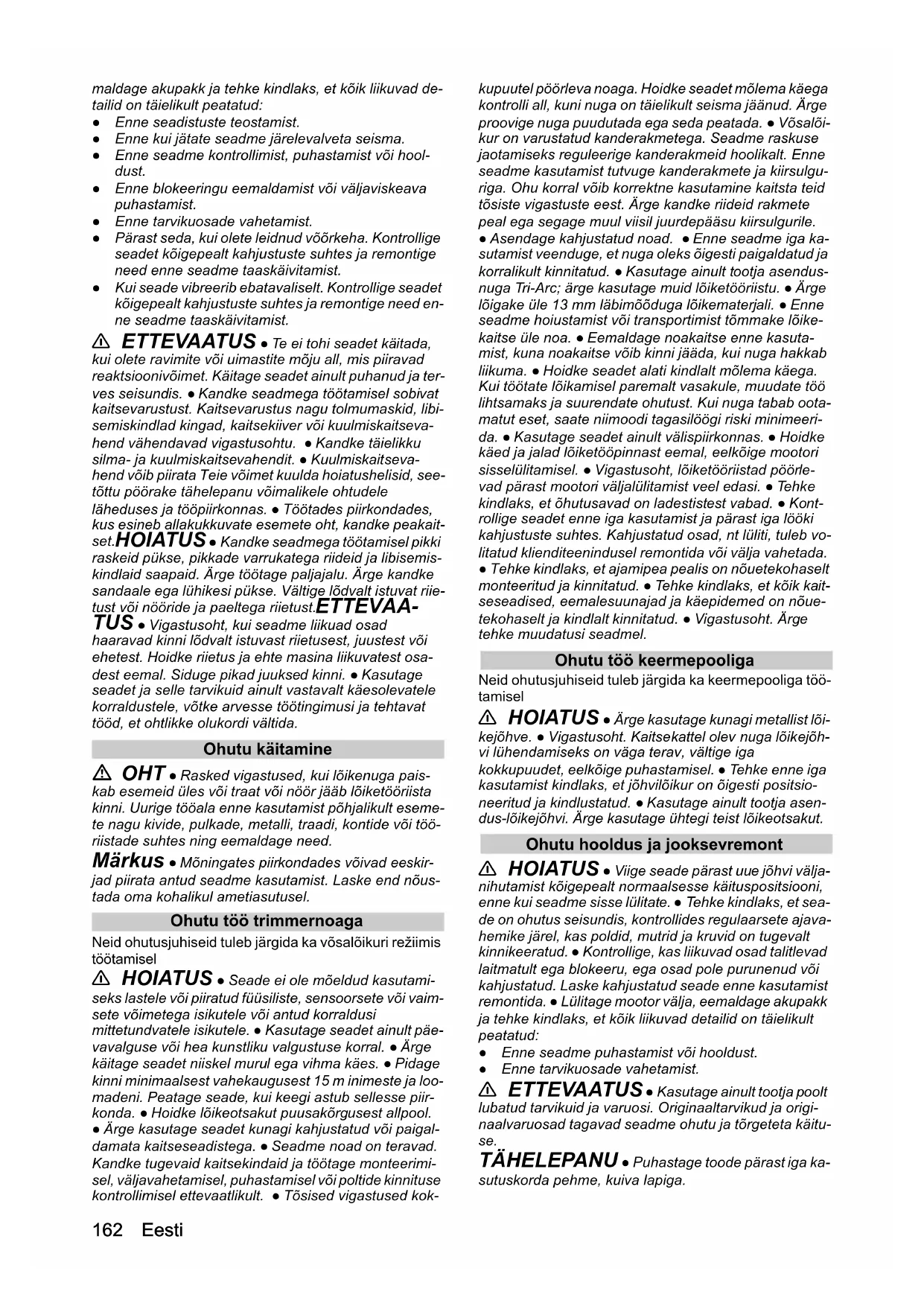 - EL vastavusdeklaratsioon 62 Eesti maldage akupakk ja tehke kindlaks, et kõik liikuvad de- tailid on täielikult peatatud: ● Enne seadistuste teostamist. ● Enne kui jätate seadme järelevalveta seisma. ● Enne seadme kontrollimist, puhastamist või hool- dust. ● Enne blokeeringu eemaldamist või väljaviskeava puhastamist. ● Enne tarvikuosade vahetamist. ● Pärast seda, kui olete leidnud võõrkeha. Kontrollige seadet kõigepealt kahjustuste suhtes ja remontige need enne seadme taaskäivitamist. ● Kui seade vibreerib ebatavaliselt. Kontrollige seadet kõigepealt kahjustuste suhtes ja remontige need en- ne seadme taaskäivitamist. 몇 ETTEVAATUS ● Te ei tohi seadet käitada, kui olete ravimite või uimastite mõju all, mis piiravad reaktsioonivõimet. Käitage seadet ainult puhanud ja ter- ves seisundis. ● Kandke seadmega töötamisel sobivat kaitsevarustust. Kaitsevarustus nagu tolmumaskid, libi- semiskindlad kingad, kaitsekiiver või kuulmiskaitseva- hend vähendavad vigastusohtu. ● Kandke täielikku silma- ja kuulmiskaitsevahendit. ● Kuulmiskaitseva- hend võib piirata Teie võimet kuulda hoiatushelisid, see- tõttu pöörake tähelepanu võimalikele ohtudele läheduses ja tööpiirkonnas. ● Töötades piirkondades, kus esineb allakukkuvate esemete oht, kandke peakait- set. HOIATUS ● Kandke seadmega töötamisel pikki raskeid pükse, pikkade varrukatega riideid ja libisemis- kindlaid saapaid. Ärge töötage paljajalu. Ärge kandke sandaale ega lühikesi pükse. Vältige lõdvalt istuvat riie- tust või nööride ja paeltega riietust. ETTEVAA- TUS ● Vigastusoht, kui seadme liikuad osad haaravad kinni lõdvalt istuvast riietusest, juustest või ehetest. Hoidke riietus ja ehte masina liikuvatest osa- dest eemal. Siduge pikad juuksed kinni. ● Kasutage seadet ja selle tarvikuid ainult vastavalt käesolevatele korraldustele, võtke arvesse töötingimusi ja tehtavat tööd, et ohtlikke olukordi vältida. Ohutu käitamine OHT ● Rasked vigastused, kui lõikenuga pais- kab esemeid üles või traat või nöör jääb lõiketööriista kinni. Uurige tööala enne kasutamist põhjalikult eseme- te nagu kivide, pulkade, metalli, traadi, kontide või töö- riistade suhtes ning eemaldage need. Märkus ● Mõningates piirkondades võivad eeskir- jad piirata antud seadme kasutamist. Laske end nõus- tada oma kohalikul ametiasutusel. Ohutu töö trimmernoaga Neid ohutusjuhiseid tuleb järgida ka võsalõikuri režiimis töötamisel 몇 HOIATUS ● Seade ei ole mõeldud kasutami- seks lastele või piiratud füüsiliste, sensoorsete või vaim- sete võimetega isikutele või antud korraldusi mittetundvatele isikutele. ● Kasutage seadet ainult päe- vavalguse või hea kunstliku valgustuse korral. ● Ärge käitage seadet niiskel murul ega vihma käes. ● Pidage kinni minimaalsest vahekaugusest 15 m inimeste ja loo- madeni. Peatage seade, kui keegi astub sellesse piir- konda. ● Hoidke lõikeotsakut puusakõrgusest allpool. ● Ärge kasutage seadet kunagi kahjustatud või paigal- damata kaitseseadistega. ● Seadme noad on teravad. Kandke tugevaid kaitsekindaid ja töötage monteerimi- sel, väljavahetamisel, puhastamisel või poltide kinnituse kontrollimisel ettevaatlikult. ● Tõsised vigastused kok- kupuutel pöörleva noaga. Hoidke seadet mõlema käega kontrolli all, kuni nuga on täielikult seisma jäänud. Ärge proovige nuga puudutada ega seda peatada. ● Võsalõi- kur on varustatud kanderakmetega. Seadme raskuse jaotamiseks reguleerige kanderakmeid hoolikalt. Enne seadme kasutamist tutvuge kanderakmete ja kiirsulgu- riga. Ohu korral võib korrektne kasutamine kaitsta teid tõsiste vigastuste eest. Ärge kandke riideid rakmete peal ega segage muul viisil juurdepääsu kiirsulgurile. ● Asendage kahjustatud noad. ● Enne seadme iga ka- sutamist veenduge, et nuga oleks õigesti paigaldatud ja korralikult kinnitatud. ● Kasutage ainult tootja asendus- nuga Tri-Arc; ärge kasutage muid lõiketööriistu. ● Ärge lõigake üle 13 mm läbimõõduga lõikematerjali. ● Enne seadme hoiustamist või transportimist tõmmake lõike- kaitse üle noa. ● Eemaldage noakaitse enne kasuta- mist, kuna noakaitse võib kinni jääda, kui nuga hakkab liikuma. ● Hoidke seadet alati kindlalt mõlema käega. Kui töötate lõikamisel paremalt vasakule, muudate töö lihtsamaks ja suurendate ohutust. Kui nuga tabab oota- matut eset, saate niimoodi tagasilöögi riski minimeeri- da. ● Kasutage seadet ainult välispiirkonnas. ● Hoidke käed ja jalad lõiketööpinnast eemal, eelkõige mootori sisselülitamisel. ● Vigastusoht, lõiketööriistad pöörle- vad pärast mootori väljalülitamist veel edasi. ● Tehke kindlaks, et õhutusavad on ladestistest vabad. ● Kont- rollige seadet enne iga kasutamist ja pärast iga lööki kahjustuste suhtes. Kahjustatud osad, nt lüliti, tuleb vo- litatud klienditeenindusel remontida või välja vahetada. ● Tehke kindlaks, et ajamipea pealis on nõuetekohaselt monteeritud ja kinnitatud. ● Tehke kindlaks, et kõik kait- seseadised, eemalesuunajad ja käepidemed on nõue- tekohaselt ja kindlalt kinnitatud. ● Vigastusoht. Ärge tehke muudatusi seadmel. Ohutu töö keermepooliga Neid ohutusjuhiseid tuleb järgida ka keermepooliga töö- tamisel 몇 HOIATUS ● Ärge kasutage kunagi metallist lõi- kejõhve. ● Vigastusoht. Kaitsekattel olev nuga lõikejõh- vi lühendamiseks on väga terav, vältige iga kokkupuudet, eelkõige puhastamisel. ● Tehke enne iga kasutamist kindlaks, et jõhvilõikur on õigesti positsio- neeritud ja kindlustatud. ● Kasutage ainult tootja asen- dus-lõikejõhvi. Ärge kasutage ühtegi teist lõikeotsakut. Ohutu hooldus ja jooksevremont 몇 HOIATUS ● Viige seade pärast uue jõhvi välja- nihutamist kõigepealt normaalsesse käituspositsiooni, enne kui seadme sisse lülitate. ● Tehke kindlaks, et sea- de on ohutus seisundis, kontrollides regulaarsete ajava- hemike järel, kas poldid, mutrid 