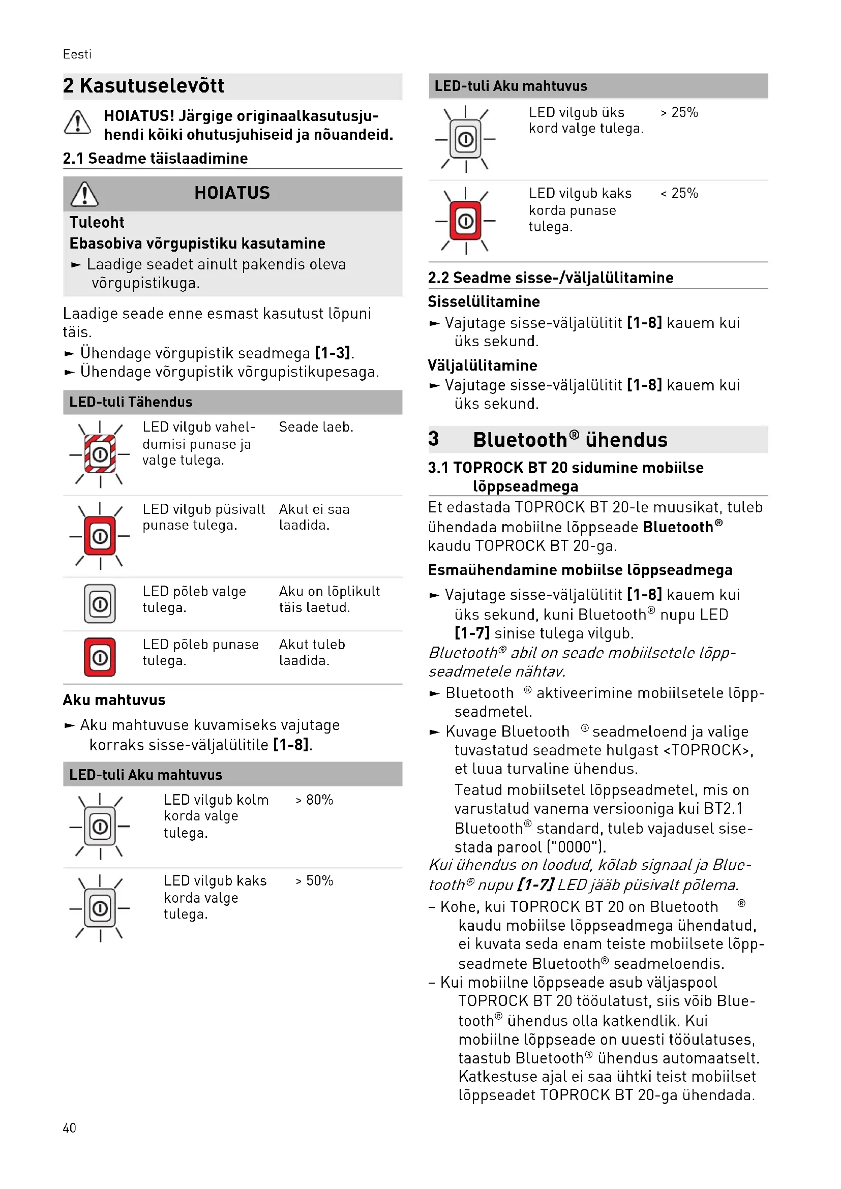 - Bluetooth® ühenduse tugevus voib varieeruda söltuvalt ühendatud mobilsest lopp-seadmest. Enne kui asute seadet TOPROCK BT 20-ga ühendama, kontrollige alati, kas mobiilse loppseadme Bluetooth® toimib.
